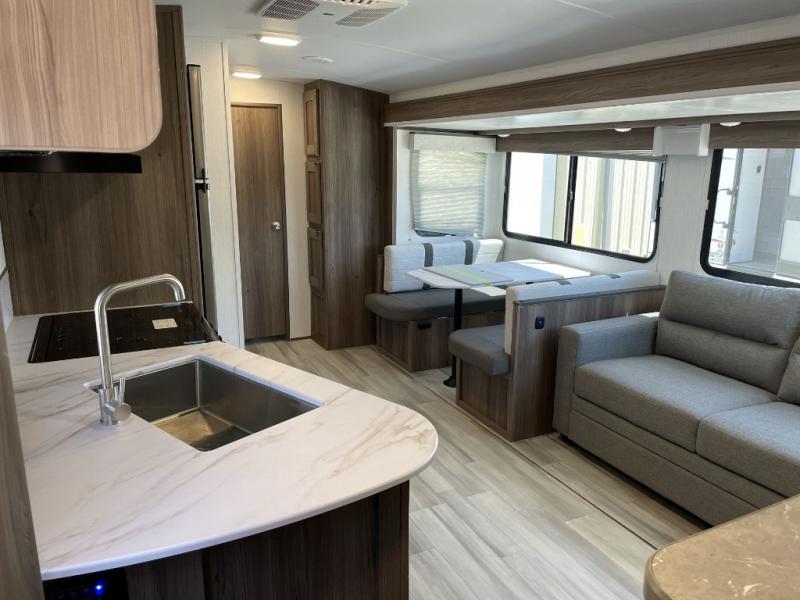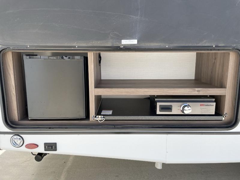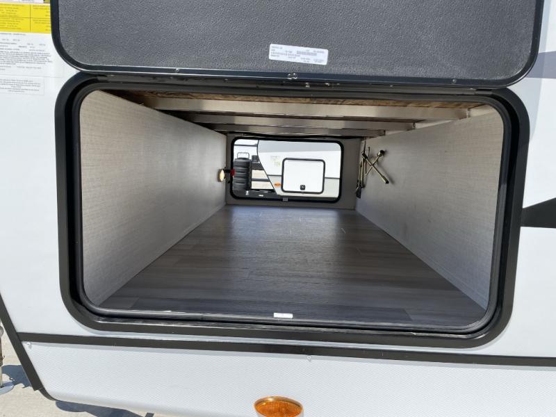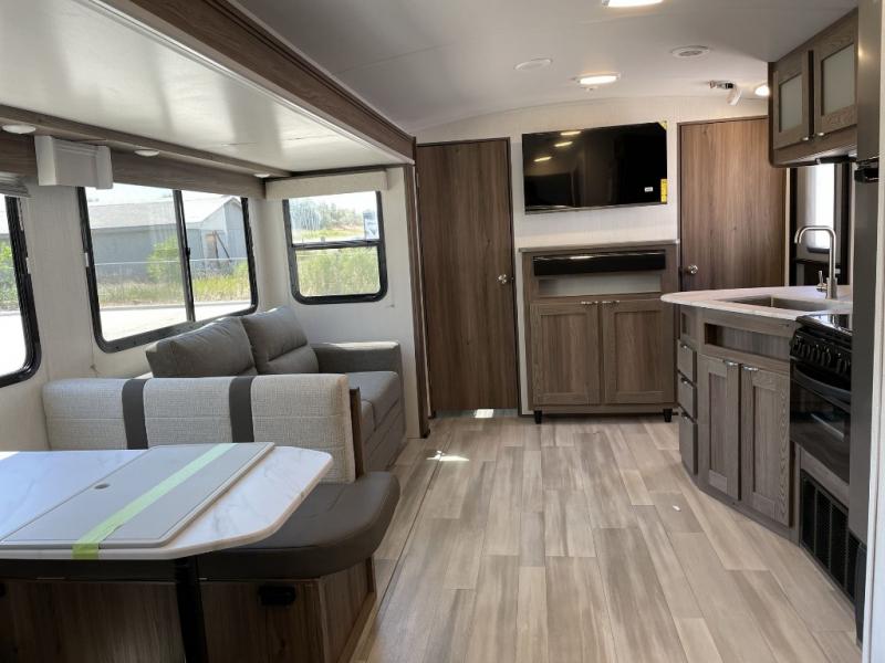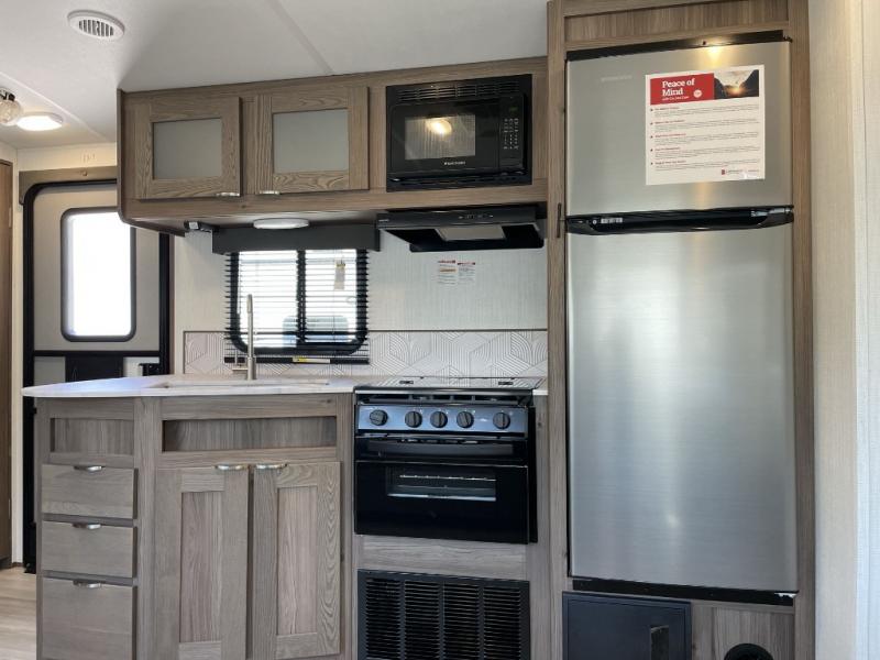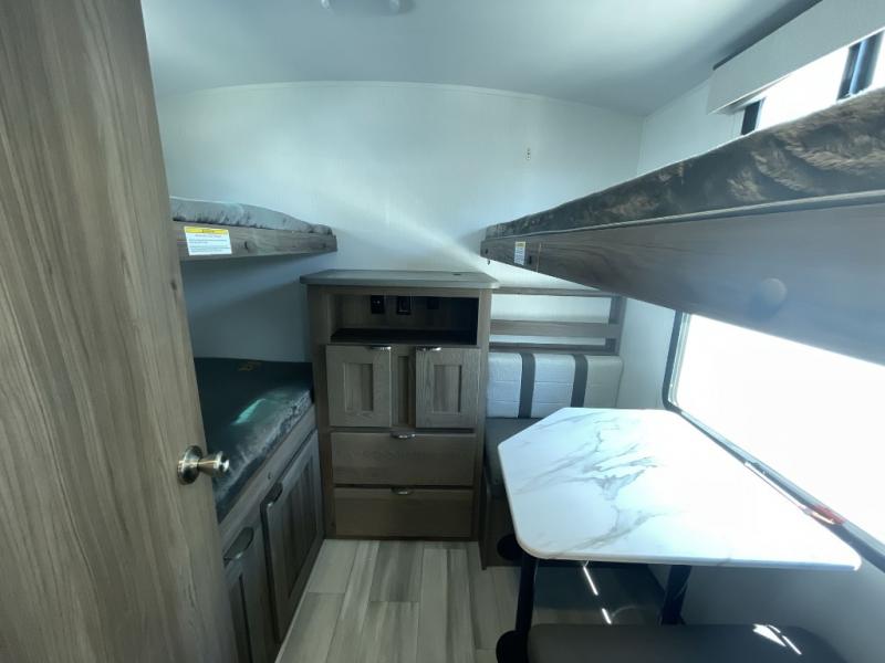 Everyone is going to love this travel trailer with a private bunkhouse! There are triple bunk beds, plus a dinette under one bunk for the kids or your friends to enjoy their own privacy, sleeping space and sitting area. You'll appreciate having your own front private bedroom with a king bed sliding system, and there is a booth dinette and sofa within the large slide out for more seating and sleeping space. Meals can be prepared on the three burner cooktop indoors, or outdoors on the outside griddle. This model also includes a full belly storage system to bring along hiking and fishing gear, and a patio awning for protection from the elements.