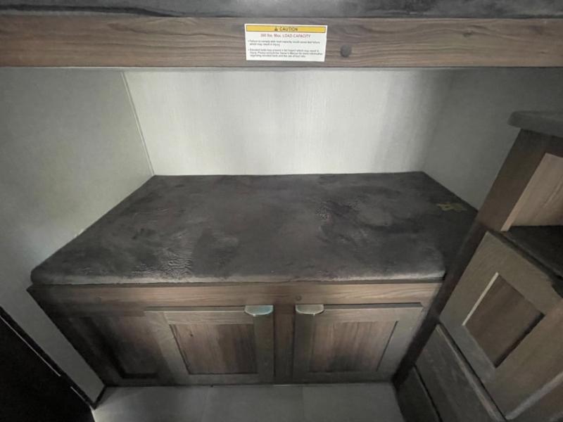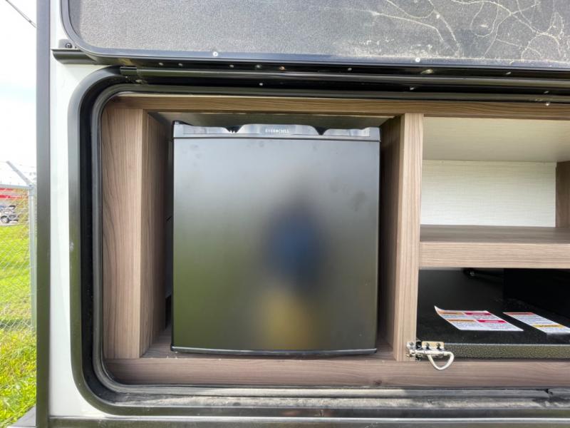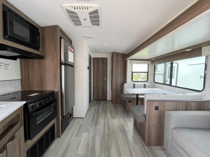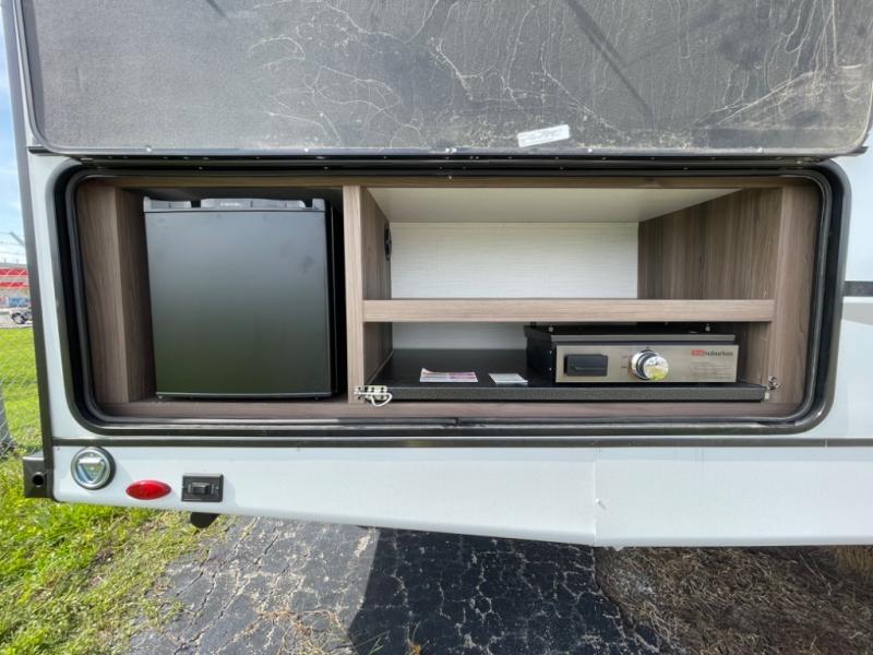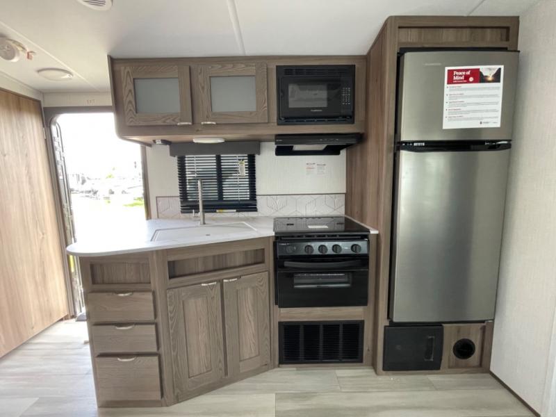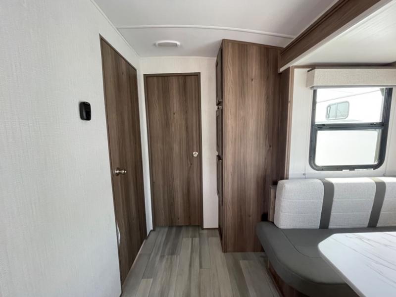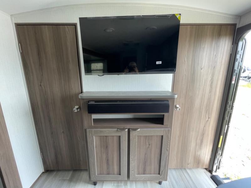 You'll want to take this travel trailer out every other weekend with its sleeping space for eight, dual entry doors, and double slides! Once you arrive at your destination, set up the 19' awning with LED light, then start lunch at the outside kitchen. The kids or your guests can start unpacking their things in the rear private bunkhouse with two bunks and a gaming chairs, bunk steps, plus storage, while your clothing and such will be in the dual wardrobes in the front private bedroom. The inside kitchen includes full amenities, the full bathroom offers the second entry/exit door, and the front bedroom has two entries, one on either side of the entertainment center. Everyone can meet in the main living area that includes a large slide with a booth dinette and a sofa. And you can add the optional LED TV for inside entertainment.