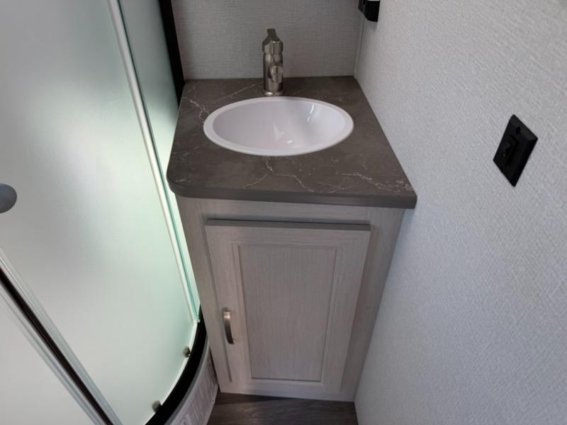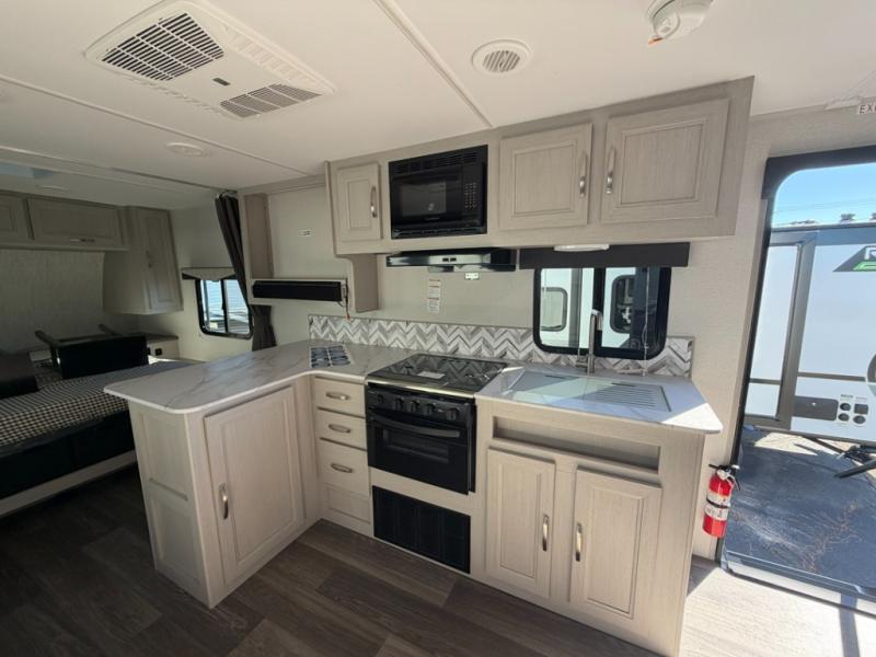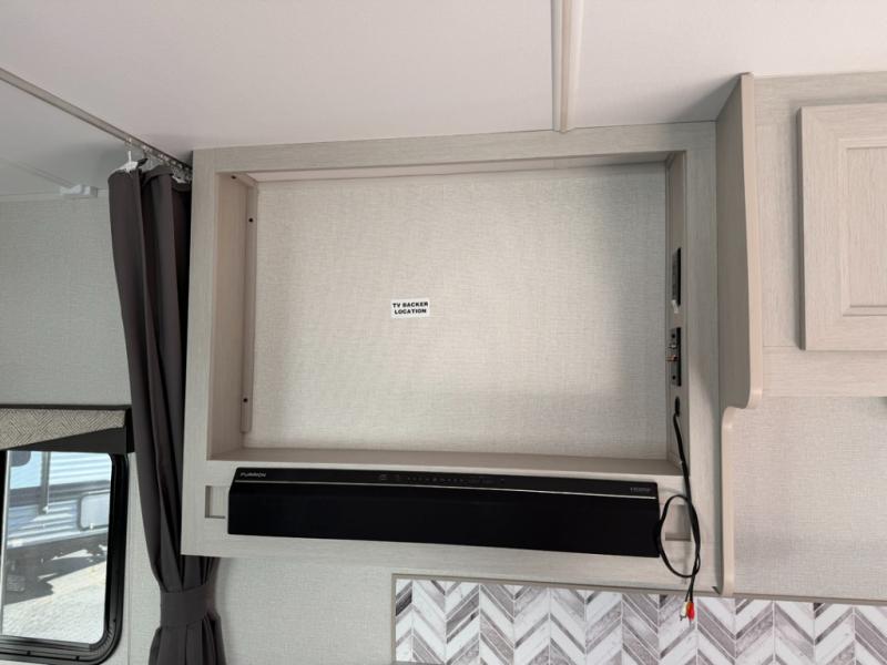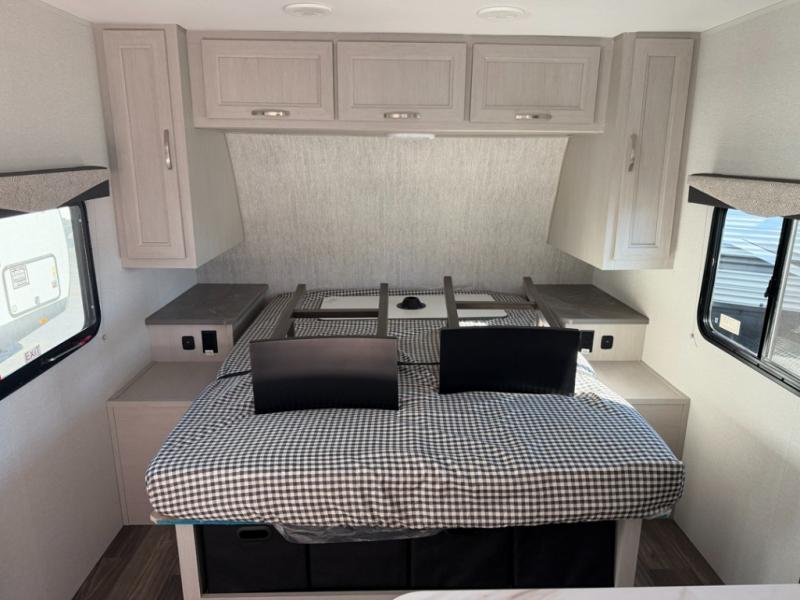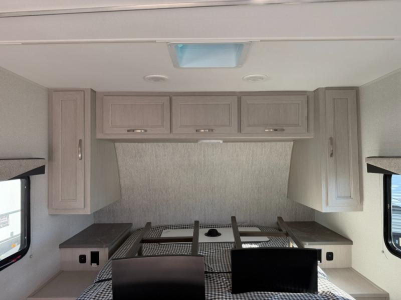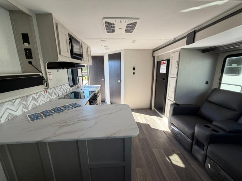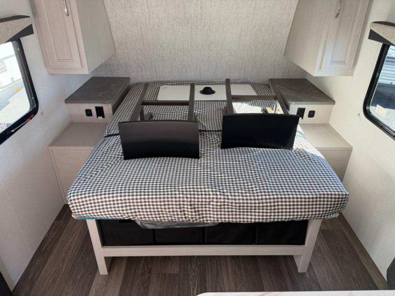Camping just got a whole lot sweeter in this travel trailer! There is a slide out for more interior space, and here you'll find the 70" sofa, 12V refrigerator, and one of the pantries. A bartop with two stools will provide a place to dine at each morning, and the full bath will let you freshen up after a day outdoors. When you're ready for some shut-eye, the queen bed up front will provide a great night's rest, and there are dual bedside wardrobes to keep your things organized.