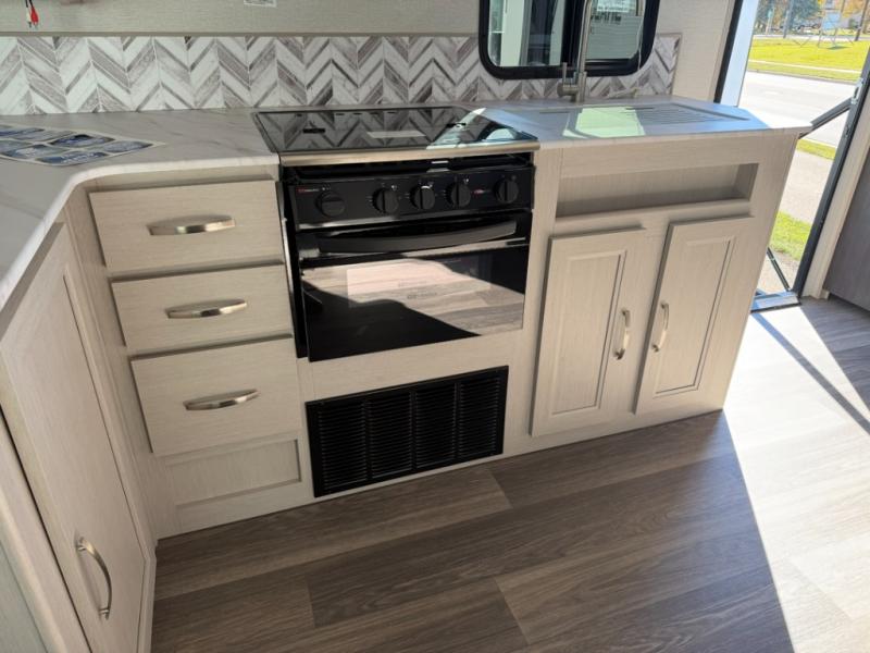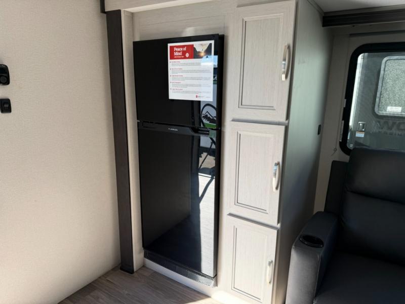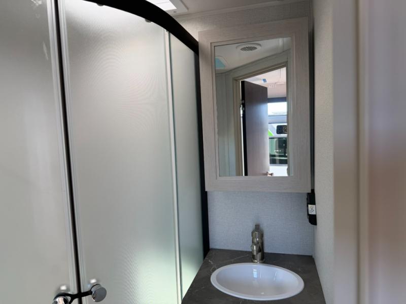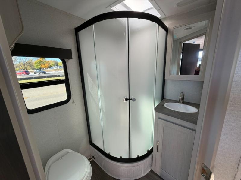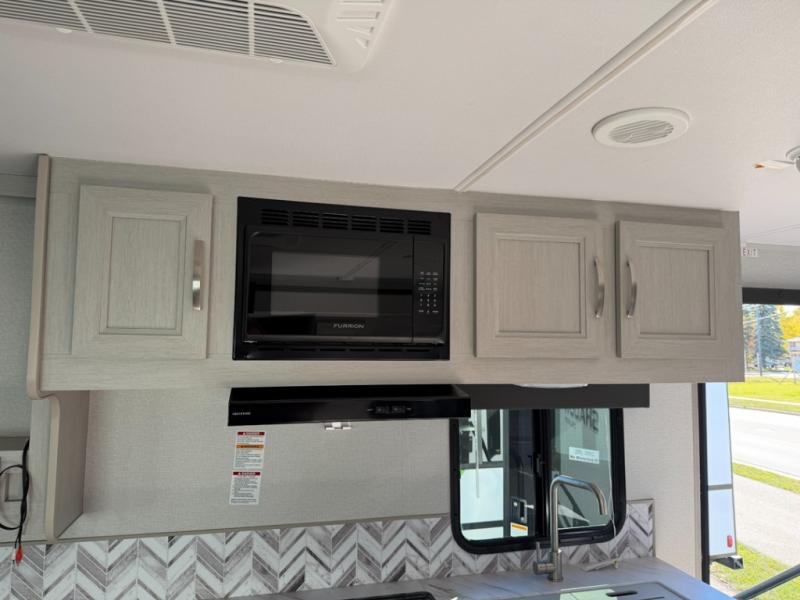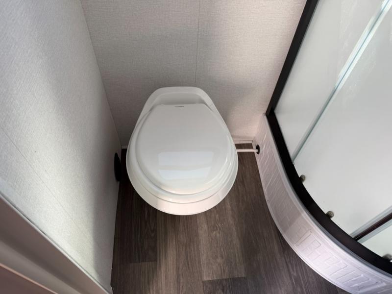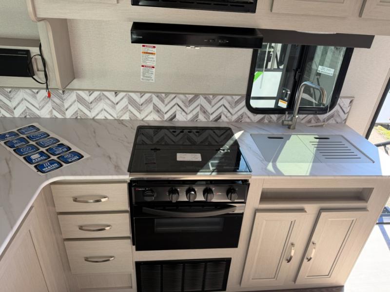 Camping just got a whole lot sweeter in this travel trailer! There is a slide out for more interior space, and here you'll find the 70" sofa, 12V refrigerator, and one of the pantries. A bartop with two stools will provide a place to dine at each morning, and the full bath will let you freshen up after a day outdoors. When you're ready for some shut-eye, the queen bed up front will provide a great night's rest, and there are dual bedside wardrobes to keep your things organized.