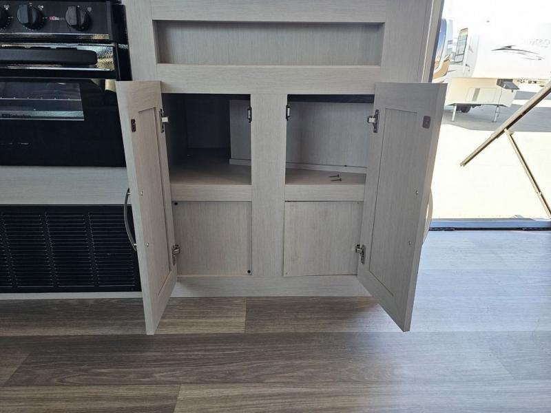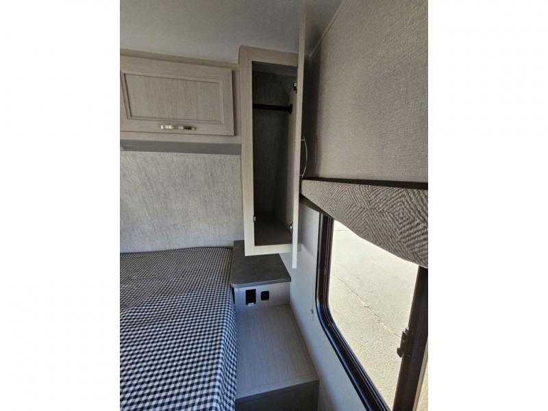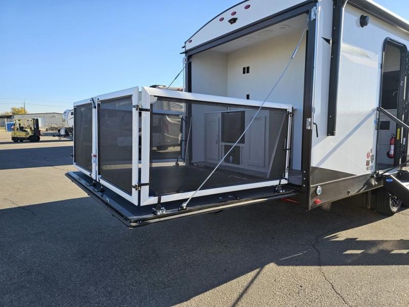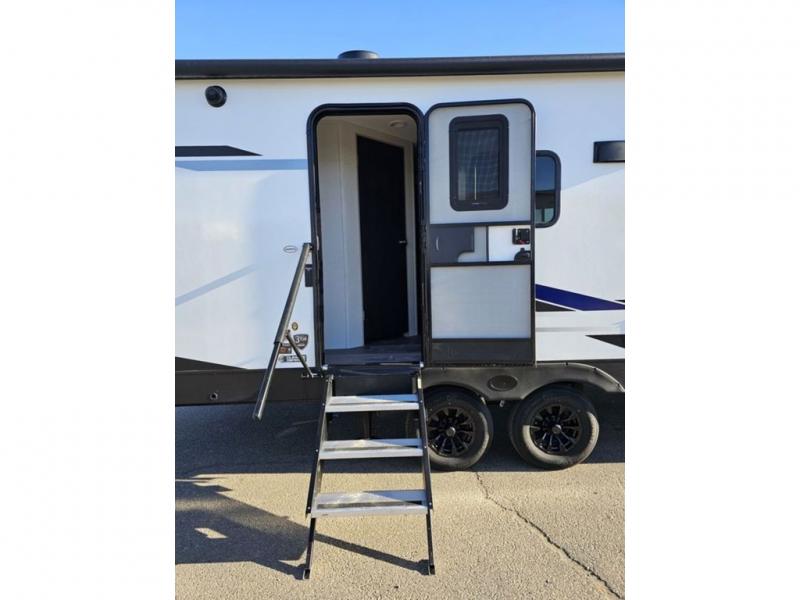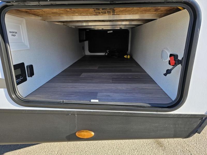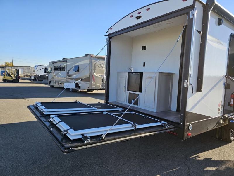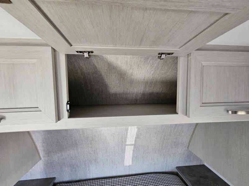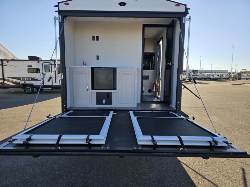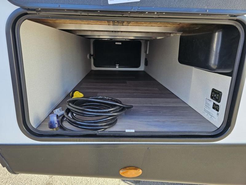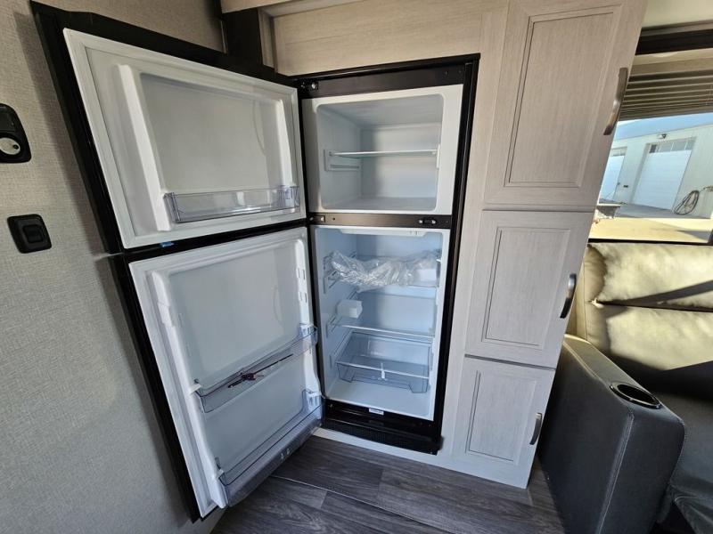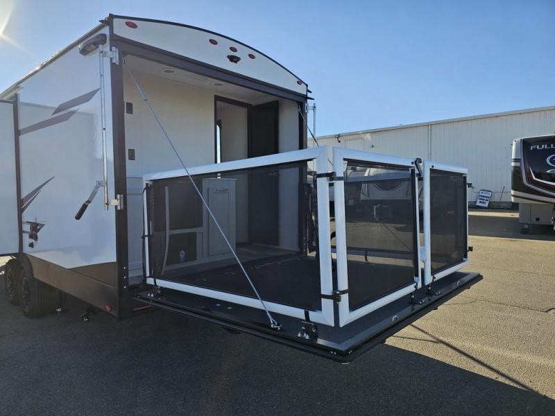 Camping just got a whole lot sweeter in this travel trailer with a rear ramp door and available/optional patio kit! There is a slide out for more interior space, and here you'll find the 70" sofa, 12V refrigerator, and pantry for snacks. There is ample counter space to prep meals, and the full bath will let you freshen up after a day outdoors. When you're ready for some shut-eye, the queen bed up front will provide a great night's rest, and there are dual bedside wardrobes to keep your things organized plus a privacy curtain if you have guests staying over on the sofa.