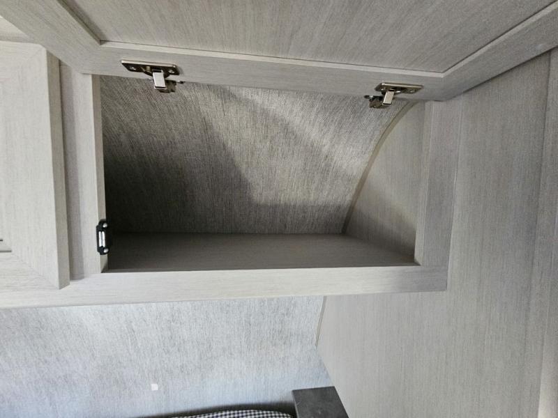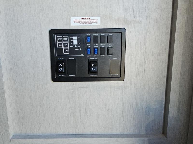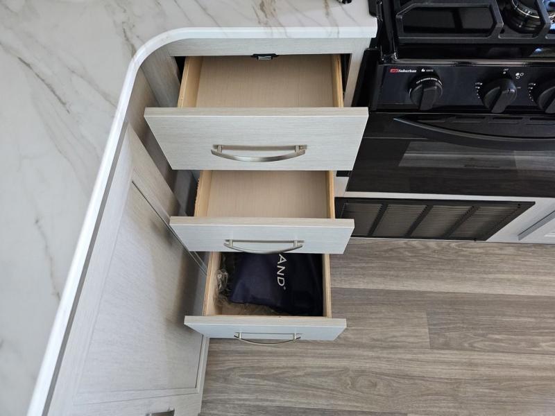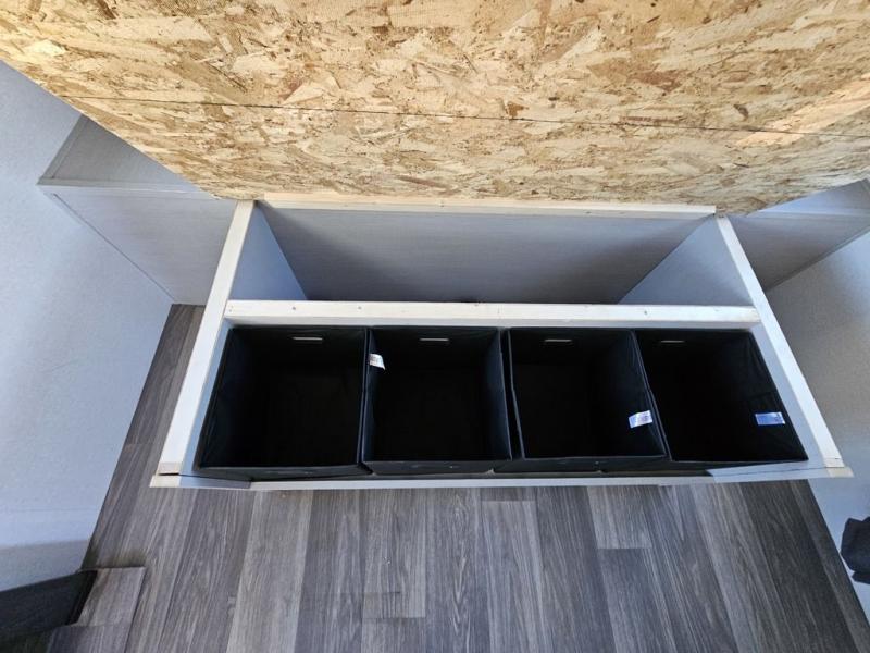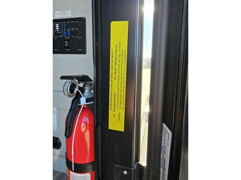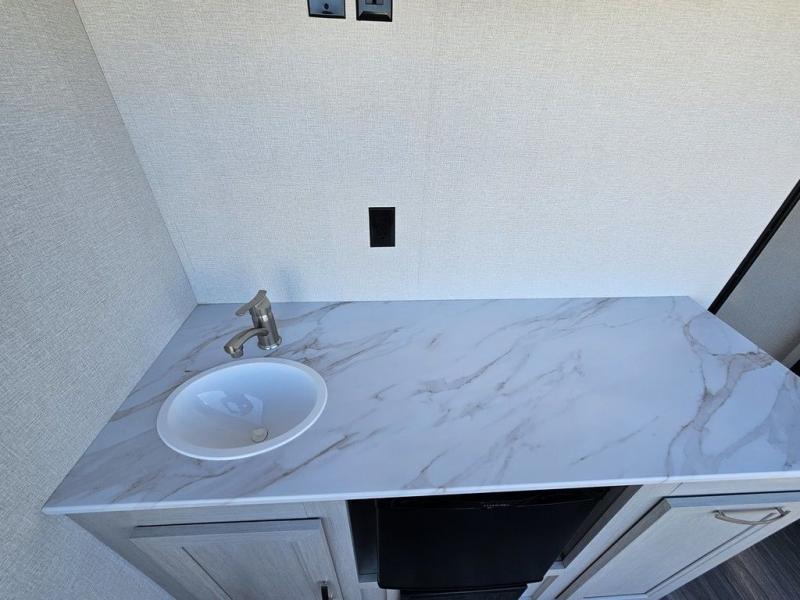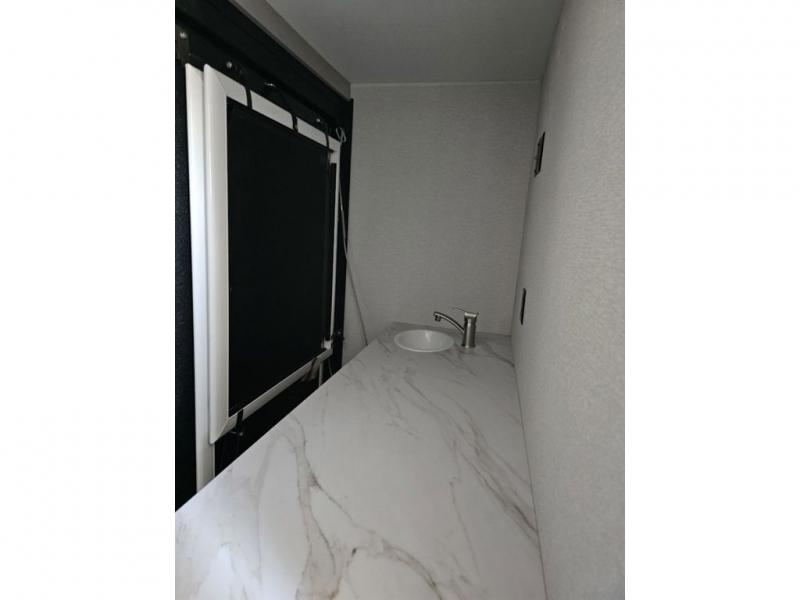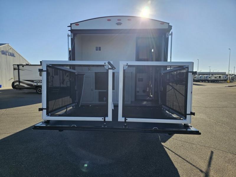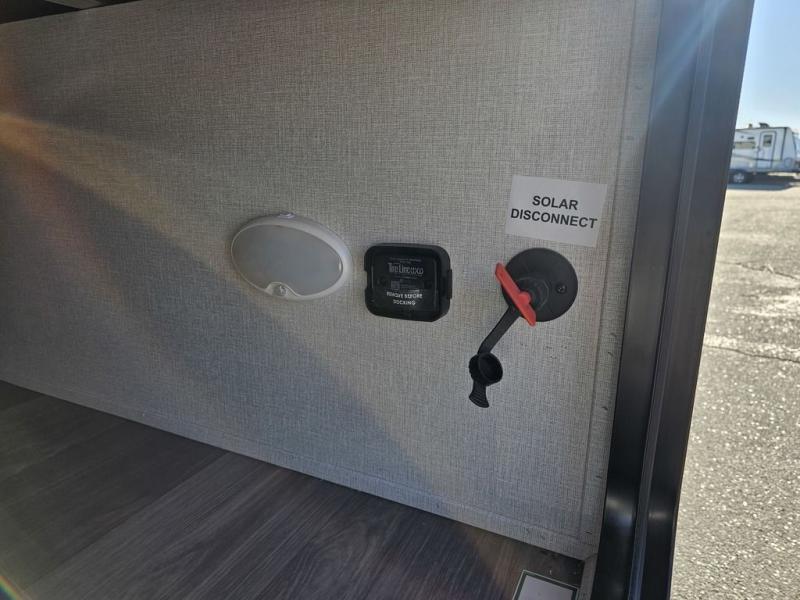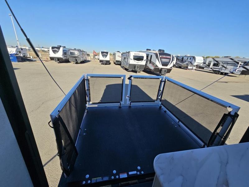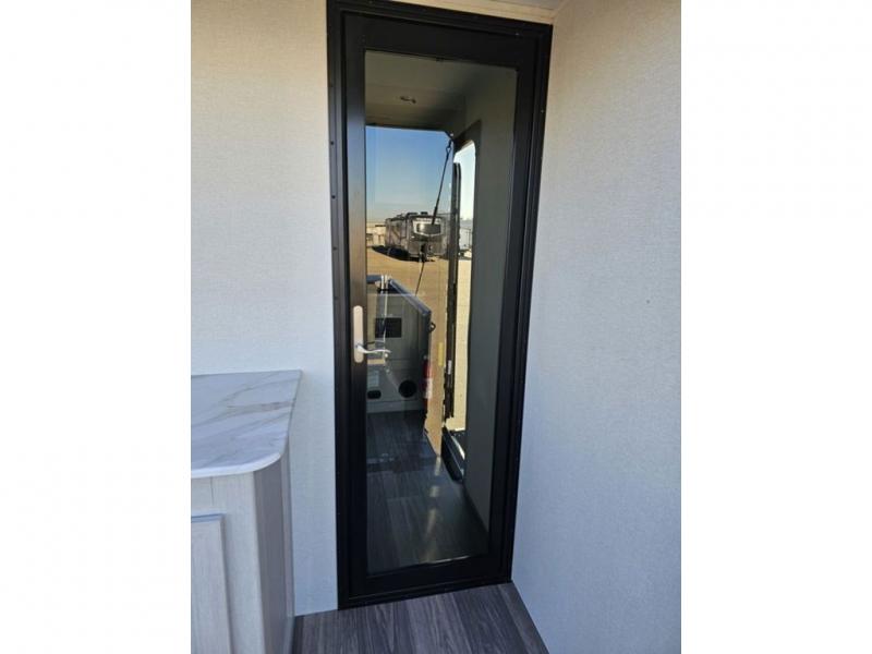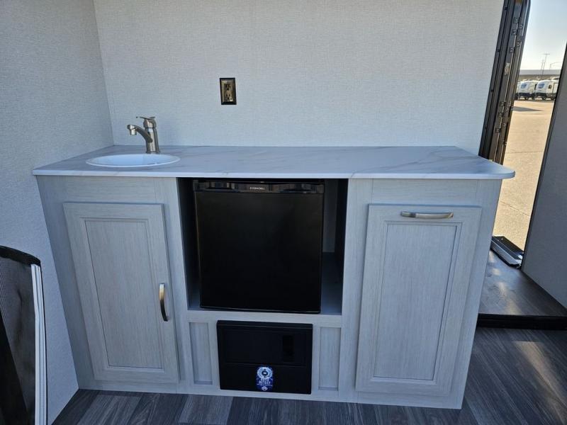 Camping just got a whole lot sweeter in this travel trailer with a rear ramp door and available/optional patio kit! There is a slide out for more interior space, and here you'll find the 70" sofa, 12V refrigerator, and pantry for snacks. There is ample counter space to prep meals, and the full bath will let you freshen up after a day outdoors. When you're ready for some shut-eye, the queen bed up front will provide a great night's rest, and there are dual bedside wardrobes to keep your things organized plus a privacy curtain if you have guests staying over on the sofa.