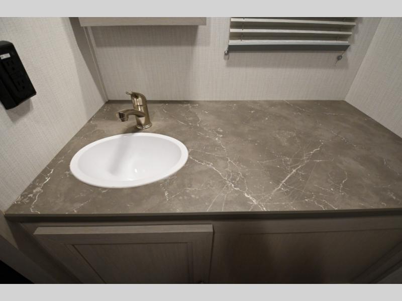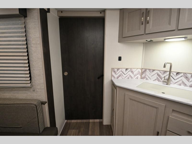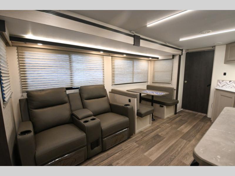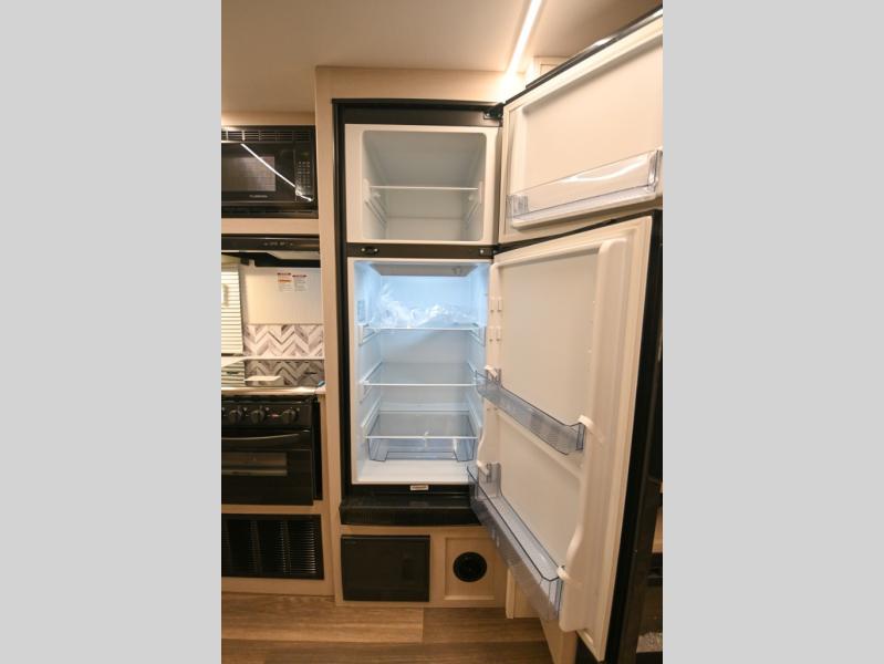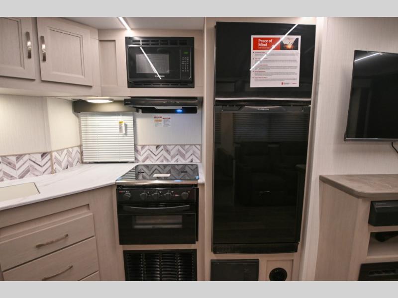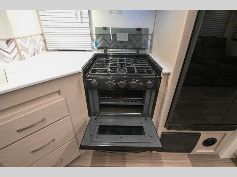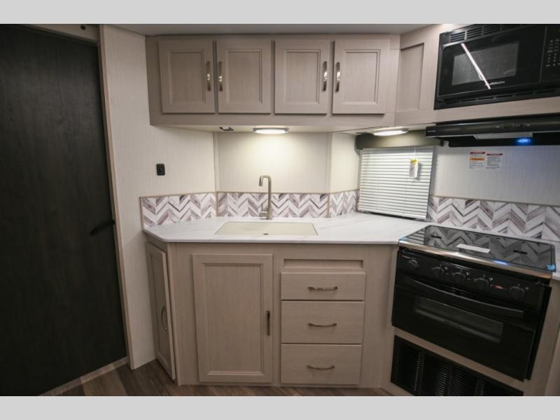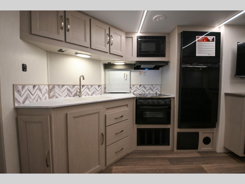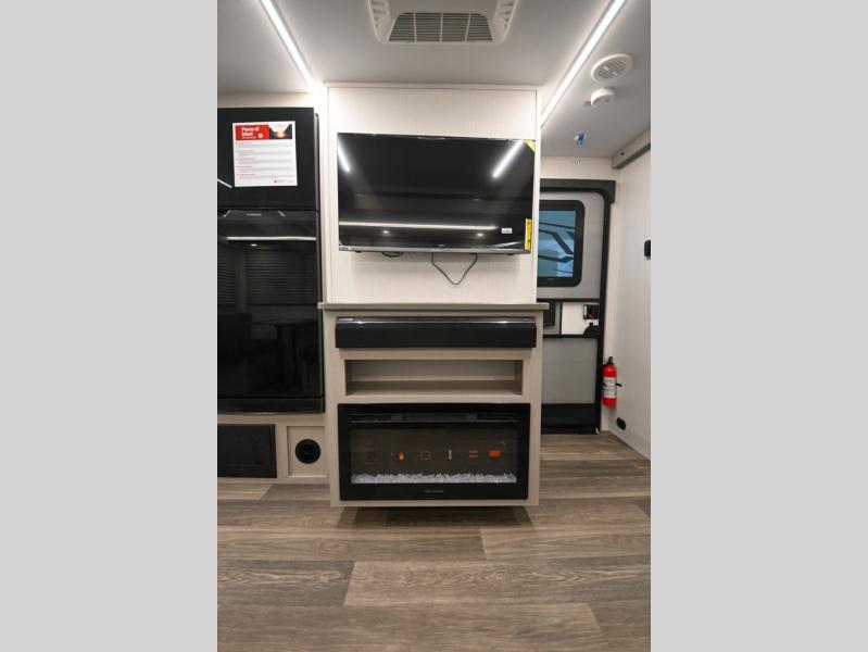 Camping just got a whole lot sweeter in this travel trailer! There is a large slide out for more interior space, and here you'll find the sofa and booth dinette across from the entertainment center with TV prep and a fireplace to make it feel more like home. The kitchen includes a three burner range and microwave oven to make meals each day, or you can head outdoors to cook on the outdoor kitchen with a griddle. When you're ready for some shut-eye, the queen bed up front will provide a great night's rest, and there are dual bedside wardrobes to keep your things organized.
