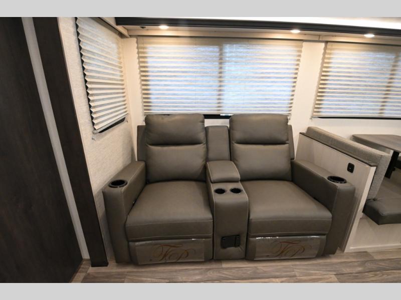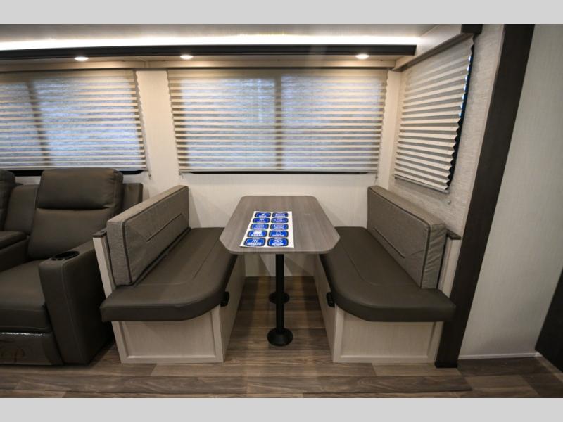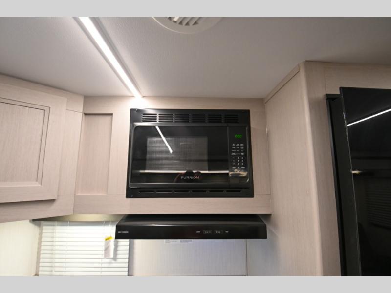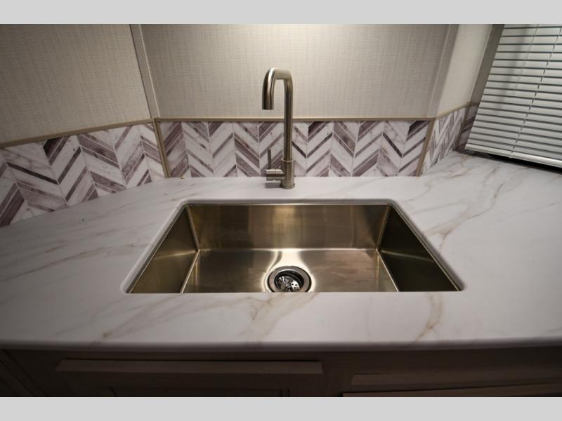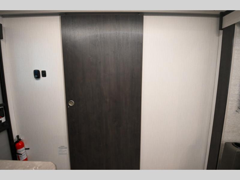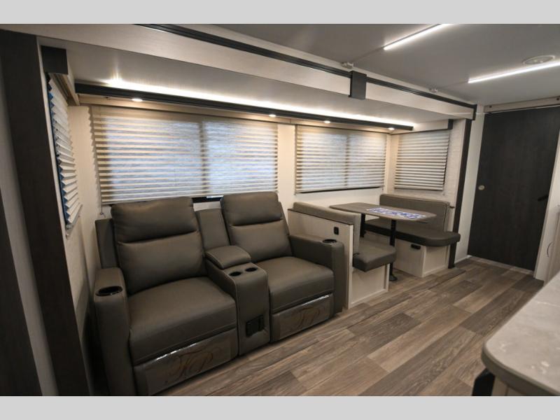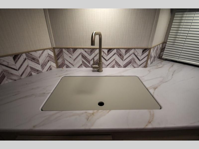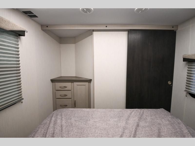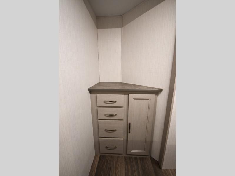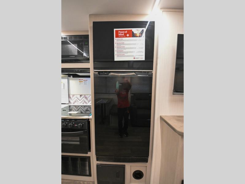 Camping just got a whole lot sweeter in this travel trailer! There is a large slide out for more interior space, and here you'll find the sofa and booth dinette across from the entertainment center with TV prep and a fireplace to make it feel more like home. The kitchen includes a three burner range and microwave oven to make meals each day, or you can head outdoors to cook on the outdoor kitchen with a griddle. When you're ready for some shut-eye, the queen bed up front will provide a great night's rest, and there are dual bedside wardrobes to keep your things organized.