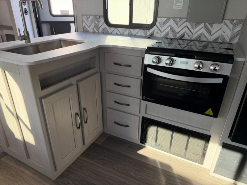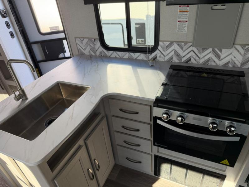 The whole gang will love camping in this spacious travel trailer. You can comfortable sleep eight between the double-size bunks in the rear bunkhouse, the queen bed in the master bedroom, plus the U-shaped dinette and sofa within the large slide. The chef of your group can make meals inside on the three burner range or outdoors on the exterior griddle. There is also a 20' power awning with LED lights for added shade during the day and a relaxing space at night.