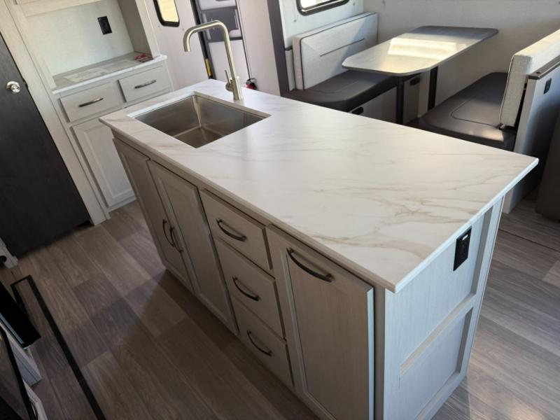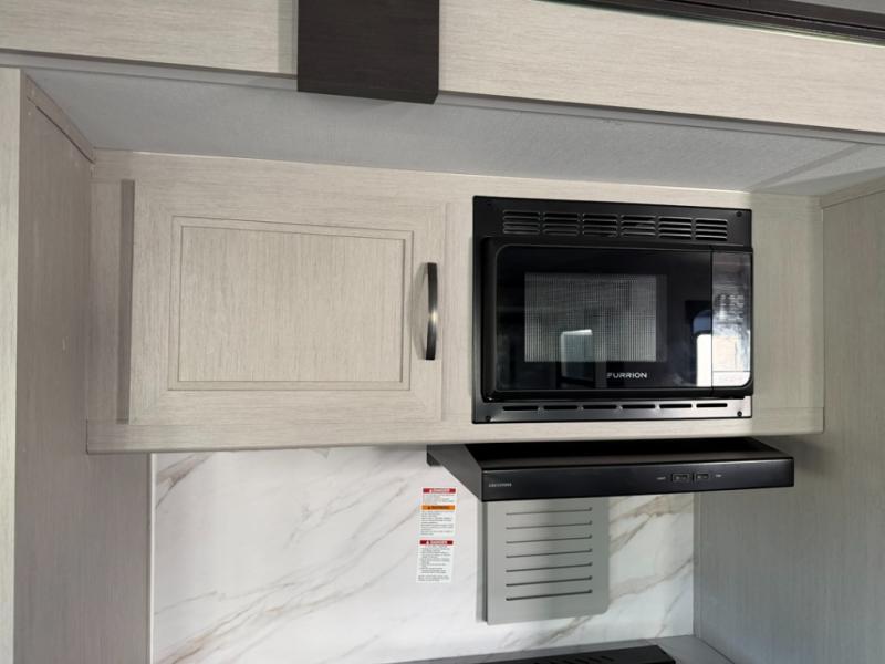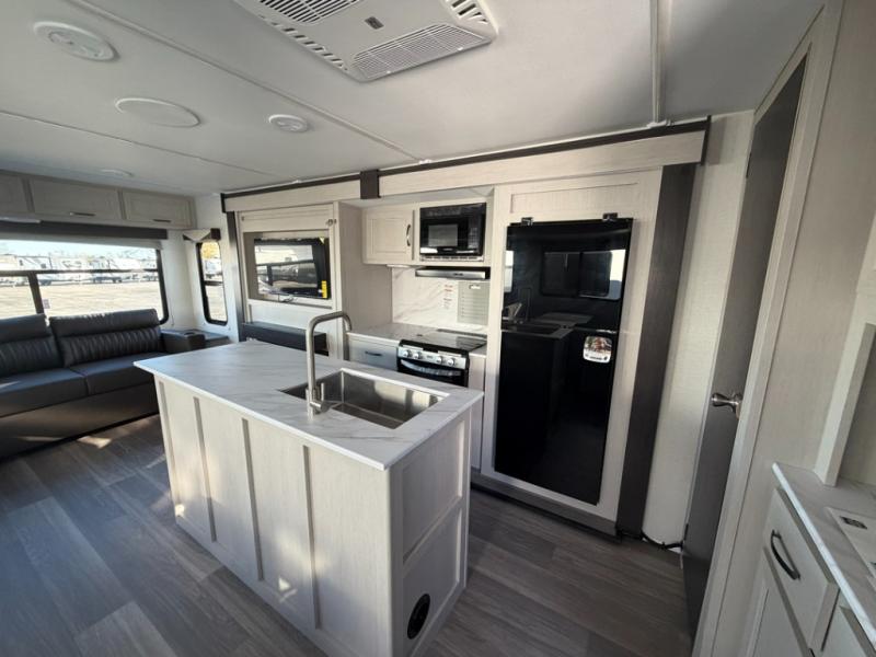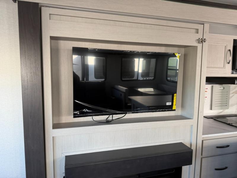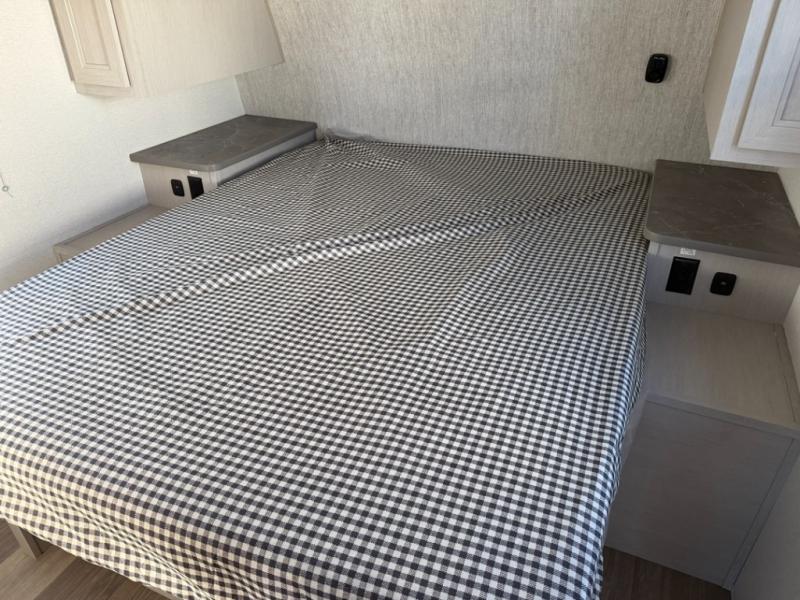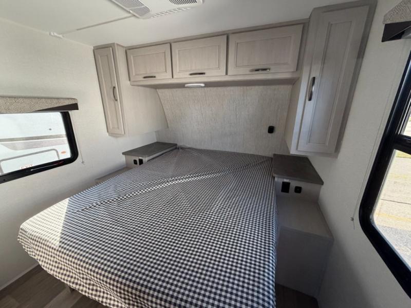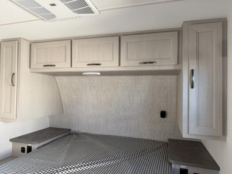 You'll love every minute spent in this spacious travel trailer for four to five campers. There are dual opposing slides in the combined kitchen and living room, along with a kitchen island with storage, a 60" theater seat, 70" sofa, plus a booth dinette for dining space. You'll find ample storage space, including a pantry and second pantry that is hidden behind the entertainment center with TV prep. There is even a wine rack so you can keep drinks stocked when guests come over! A spacious full bath lets you freshen up each day and the front private bedroom with a queen bed will feel just like home. There are also dual bedside wardrobes, an overhead cabinet, plus a dresser/wardrobe so everything has its own space.