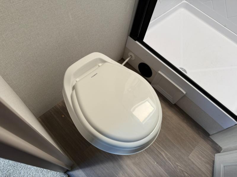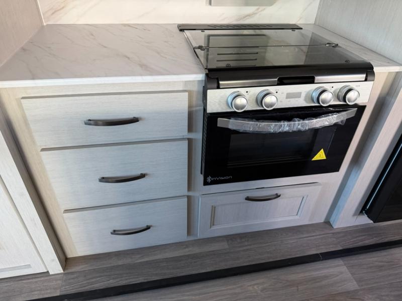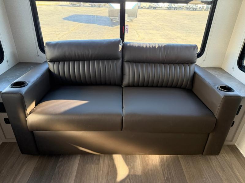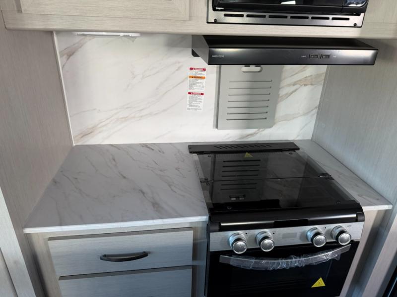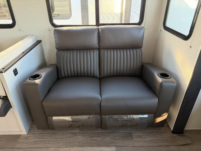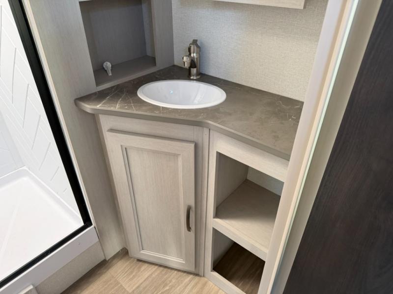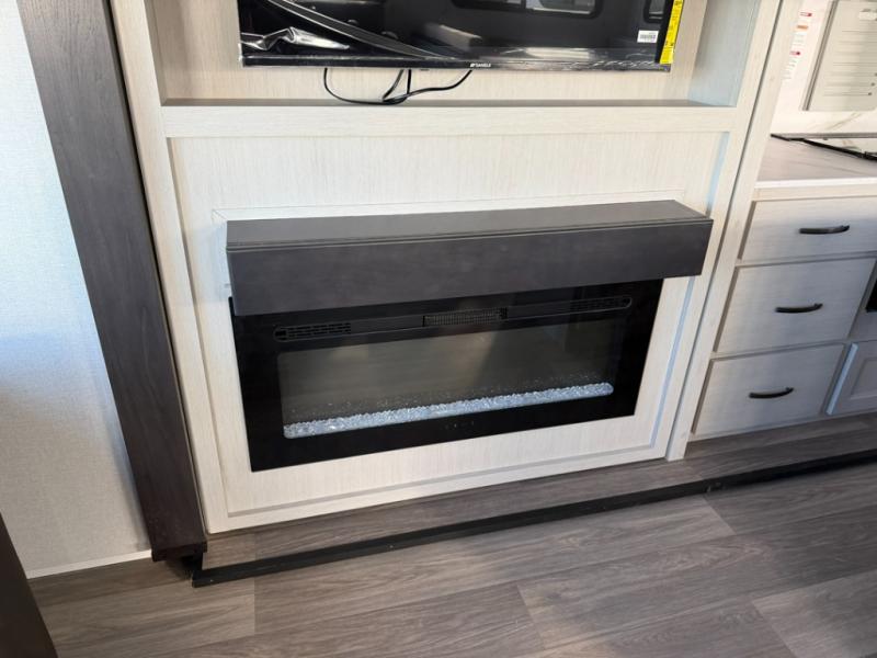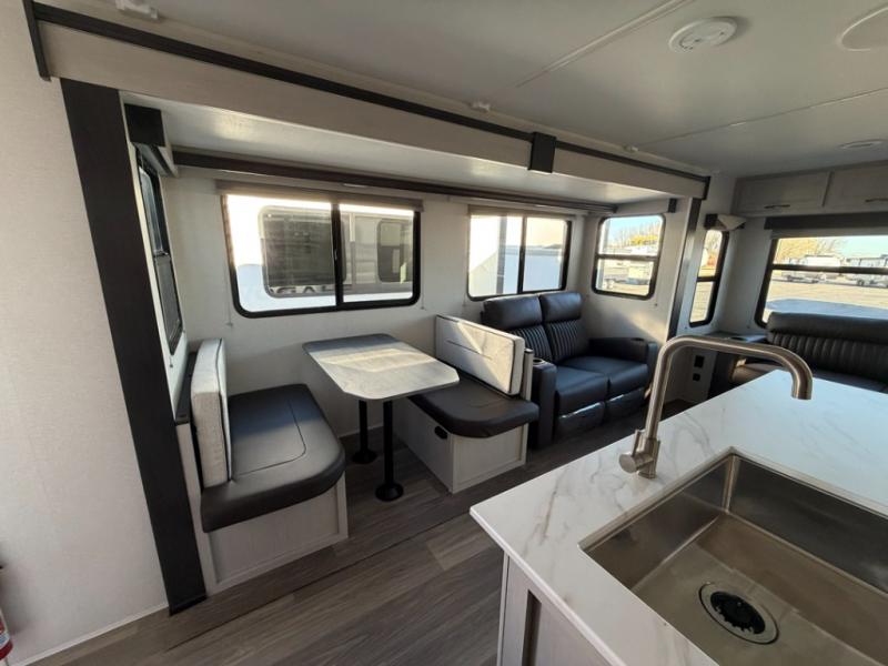 You'll love every minute spent in this spacious travel trailer for four to five campers. There are dual opposing slides in the combined kitchen and living room, along with a kitchen island with storage, a 60" theater seat, 70" sofa, plus a booth dinette for dining space. You'll find ample storage space, including a pantry and second pantry that is hidden behind the entertainment center with TV prep. There is even a wine rack so you can keep drinks stocked when guests come over! A spacious full bath lets you freshen up each day and the front private bedroom with a queen bed will feel just like home. There are also dual bedside wardrobes, an overhead cabinet, plus a dresser/wardrobe so everything has its own space.
