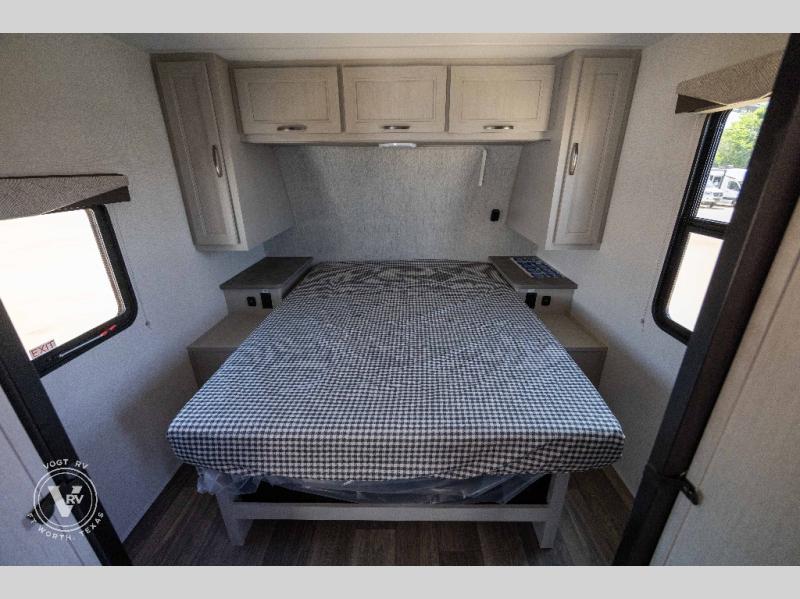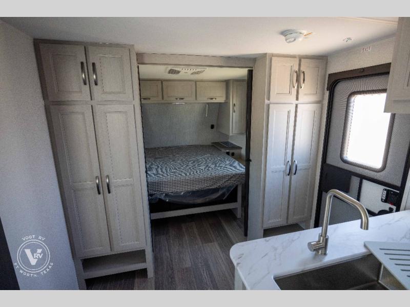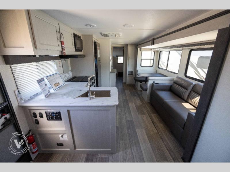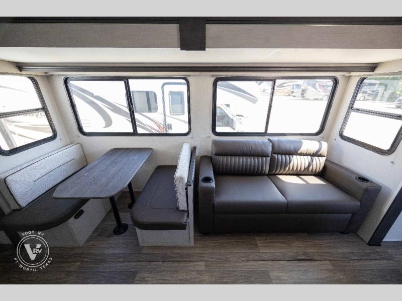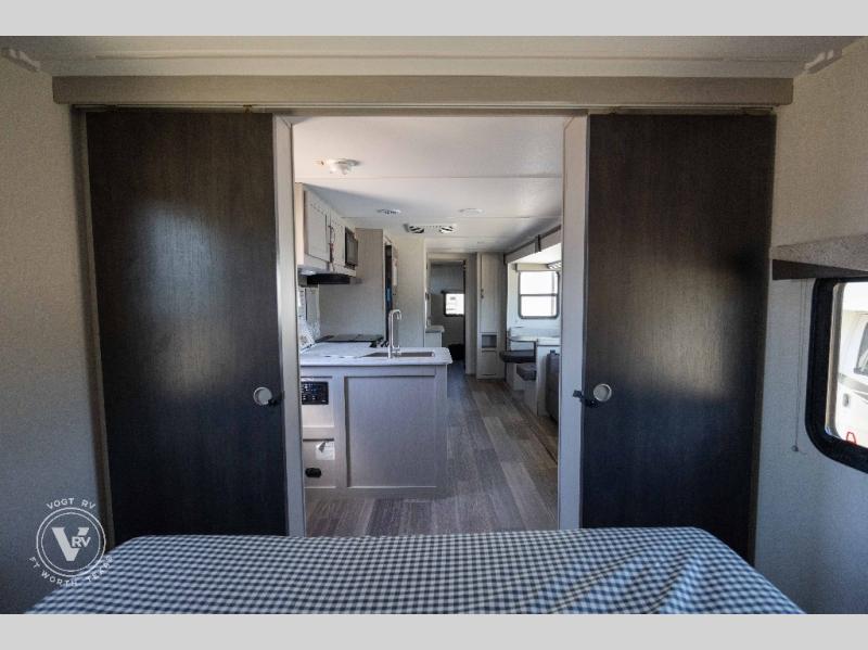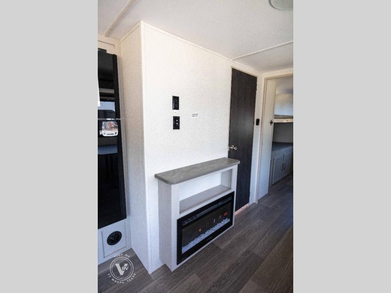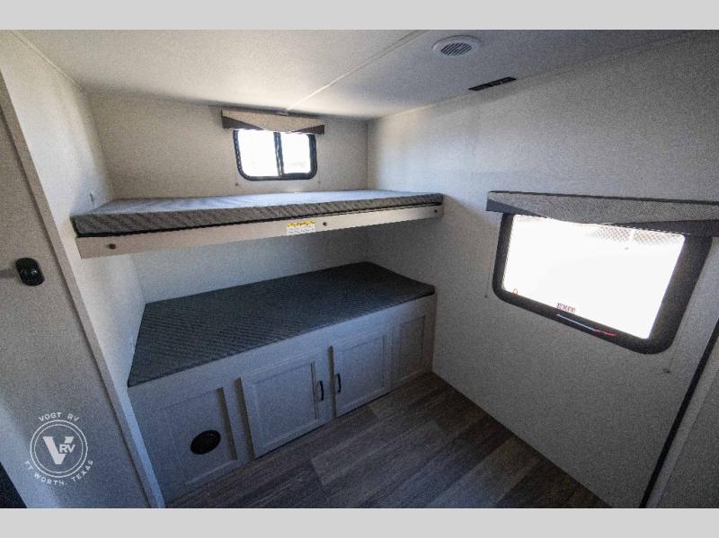 If you're looking for a travel trailer with more interior space and a larger sleeping capacity, this is the one! The rear private bunkhouse includes bunks over the outdoor kitchen, plus a third flip-up bunk above a tri-fold sofa. The full bath with its own entry door is easily accessible for everyone both inside and out, and the large slide out in the main living area will make it easy to move about. Here, you'll find a 70" sofa and booth dinette for seating and additional sleeping space, and there is a full interior kitchen when the weather isn't cooperating outside. An entertainment center with a fireplace and TV prep will add even more comfort to this room, and there is a pantry and closet towards the bedroom for food and more. The owners of this trailer will appreciate having their own space up front, complete with a queen bed and dual bedside wardrobes.