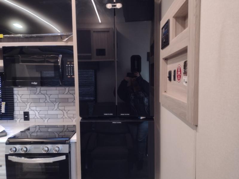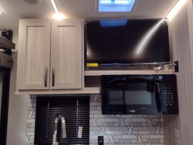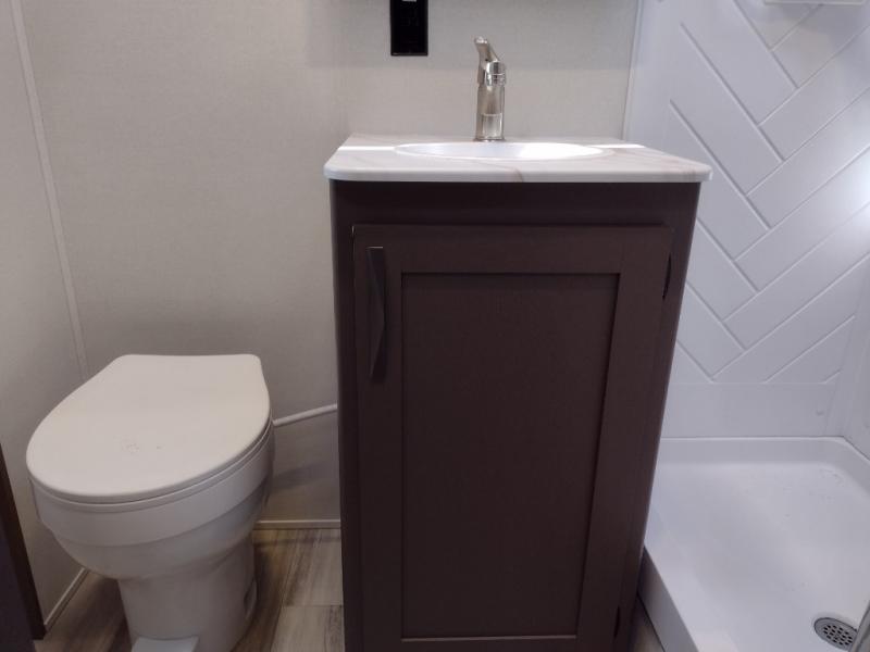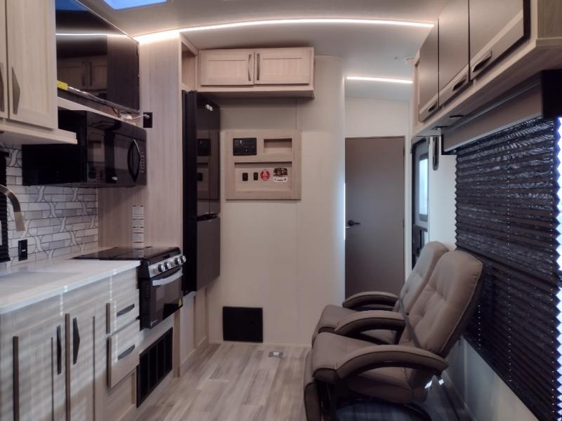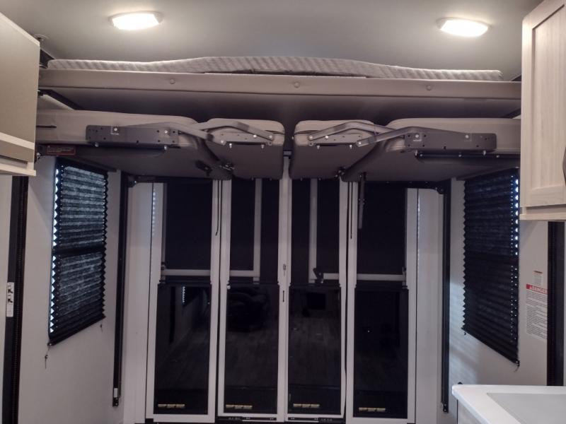 Never leave your dirt bikes behind with this toy hauler in tow! You can easily unload them through the 8' 6" door opening while using the easy-load 8' ramp door. Once the toys are out, you can relax on the opposing sofas with a dinette, and this area can become your guests' bedroom at night since there is a power queen bed above the sofas. And you might want to add the optional three seasons glass door for great outdoor views as you dine or play cards in the evening. The full kitchen includes a three burner range with an oven and a large residential microwave to cook meals each day, along with a refrigerator for food storage. This model also includes dual lounge chairs in the kitchen area to provide even more seating space. When you're ready to turn in for the night, freshen up in the dual entry bath that includes a spacious shower with a skylight, a seamless edge countertop, and even a bonus shelf with towel hangers so everything has a place. Your king bed will be waiting for you in the front master bedroom, and you can keep all your clothes tidy in the dual wardrobes!