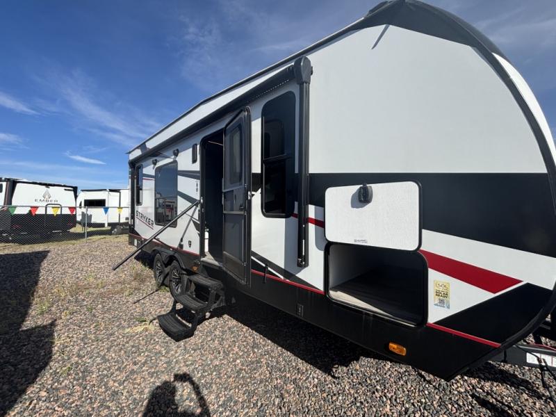 Each Stryker toy hauler travel trailer by Cruiser starts with a powder coated structural steel I-beam frame, Azdel composite laminated sidewalls, and a 102" wide body, perfect for your side-by-side, dirt bikes, or kayaks! The EZ flex rubberized suspension provides smooth towing on tougher roads, and the painted molded fiberglass front cap not only looks sleek, but provides better protection. Inside, you'll find barreled ceilings up to 98" in height, solid surface kitchen cabinets, and numerous USB ports and 110V outlets. There's so much more to love about the Stryker toy haulers, like the premium sound system, large windows, tons of storage space, and the list goes on!