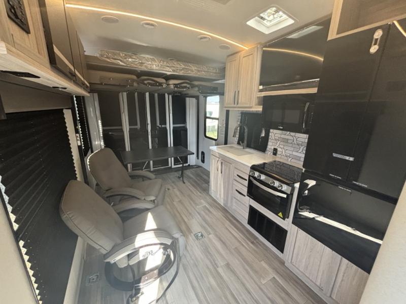 Never leave your dirt bikes behind with this toy hauler in tow! You can easily unload them through the 8' 6" door opening while using the easy-load 8' ramp door. Once the toys are out, you can relax on the opposing sofas with a dinette, and this area can become your guests' bedroom at night since there is a power queen bed above the sofas. And you might want to add the optional three seasons glass door for great outdoor views as you dine or play cards in the evening. The full kitchen includes a three burner range with an oven and a large residential microwave to cook meals each day, along with a refrigerator for food storage. This model also includes dual lounge chairs in the kitchen area to provide even more seating space. When you're ready to turn in for the night, freshen up in the dual entry bath that includes a spacious shower with a skylight, a seamless edge countertop, and even a bonus shelf with towel hangers so everything has a place. Your king bed will be waiting for you in the front master bedroom, and you can keep all your clothes tidy in the dual wardrobes!