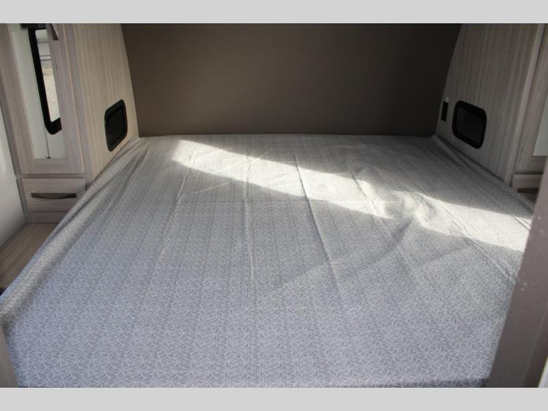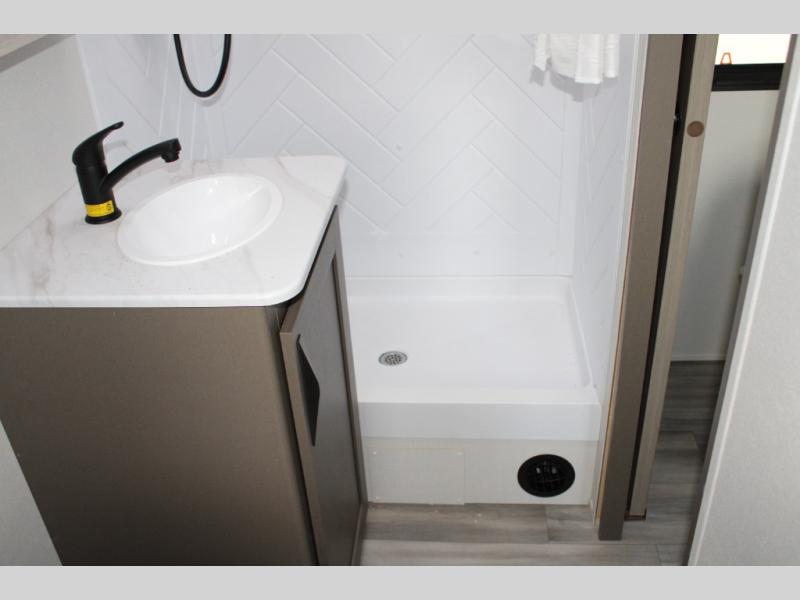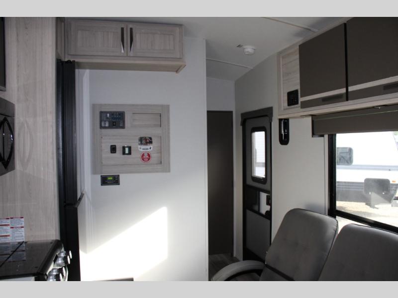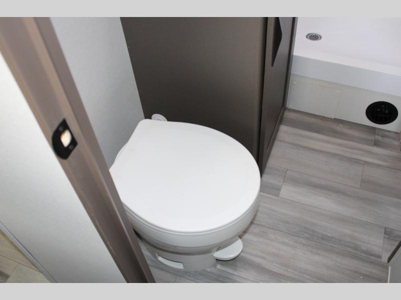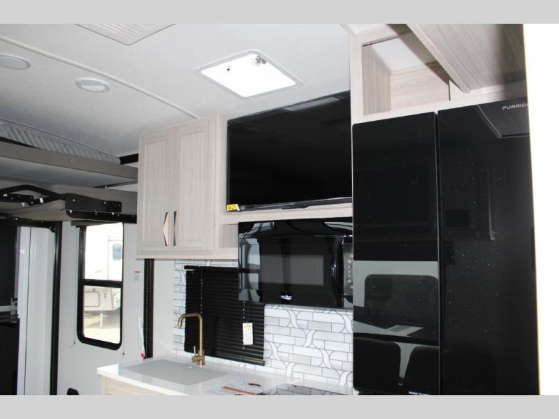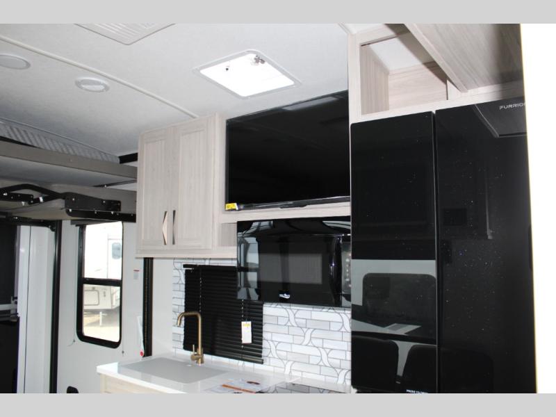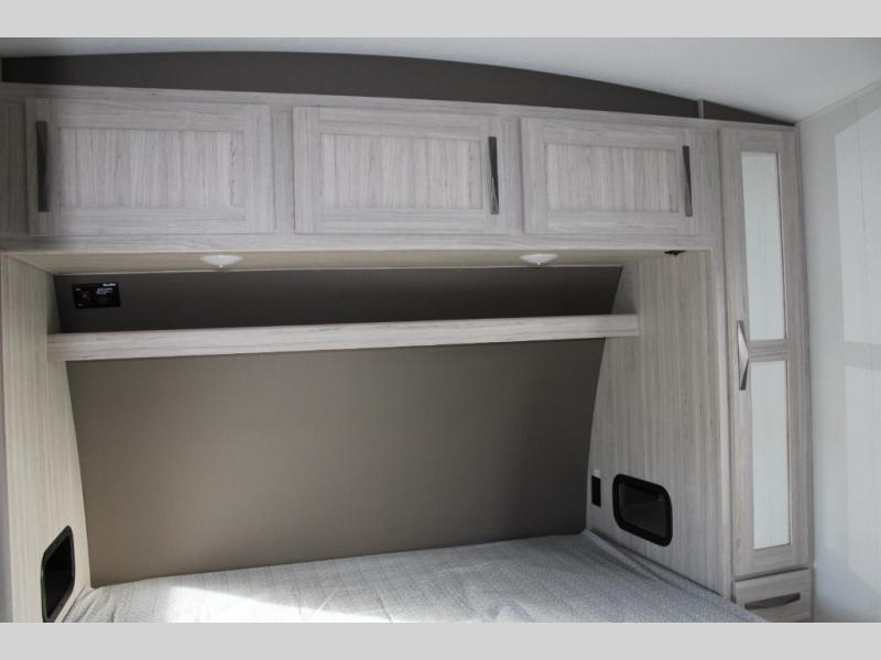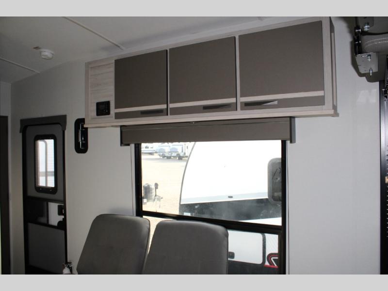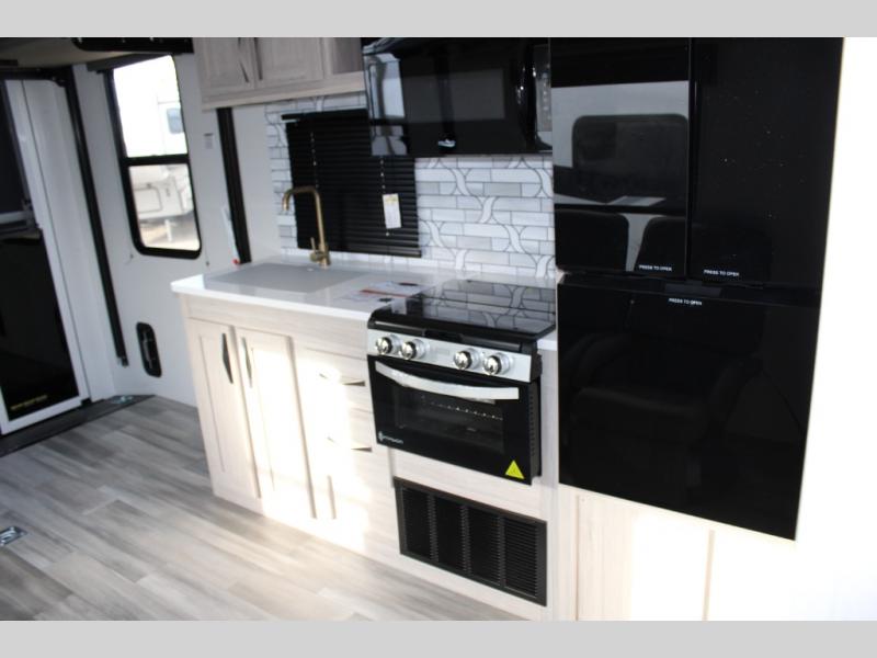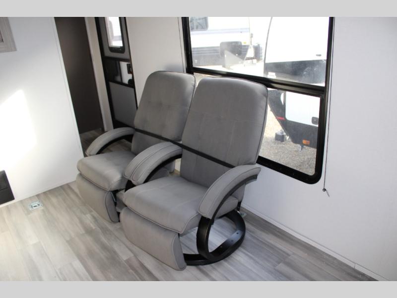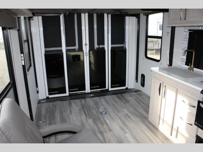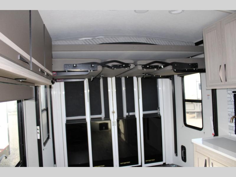 Never leave your dirt bikes behind with this toy hauler in tow! You can easily unload them through the 8' 6" door opening while using the easy-load 8' ramp door. Once the toys are out, you can relax on the opposing sofas with a dinette, and this area can become your guests' bedroom at night since there is a power queen bed above the sofas. And you might want to add the optional three seasons glass door for great outdoor views as you dine or play cards in the evening. The full kitchen includes a three burner range with an oven and a large residential microwave to cook meals each day, along with a refrigerator for food storage. This model also includes dual lounge chairs in the kitchen area to provide even more seating space. When you're ready to turn in for the night, freshen up in the dual entry bath that includes a spacious shower with a skylight, a seamless edge countertop, and even a bonus shelf with towel hangers so everything has a place. Your king bed will be waiting for you in the front master bedroom, and you can keep all your clothes tidy in the dual wardrobes!
