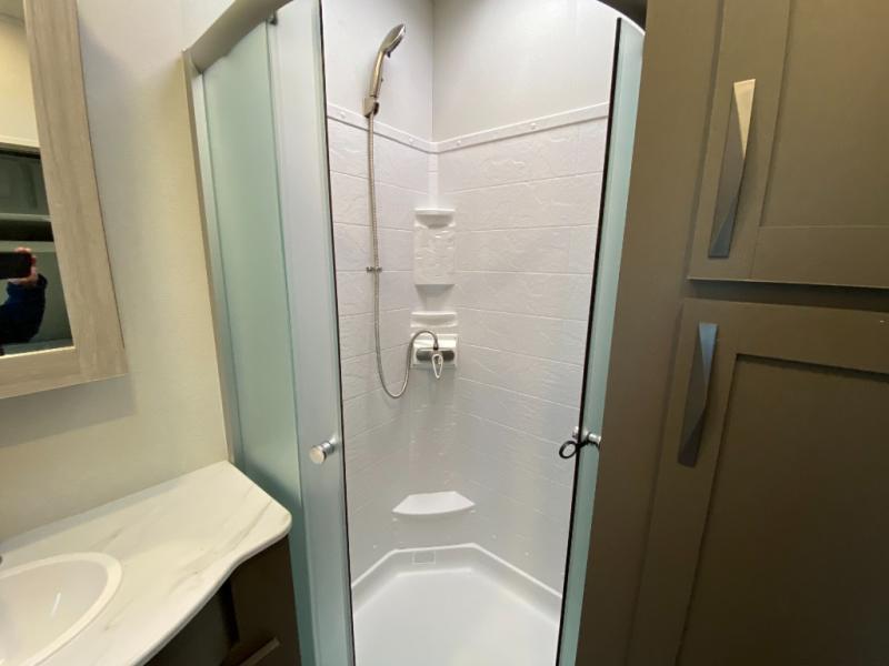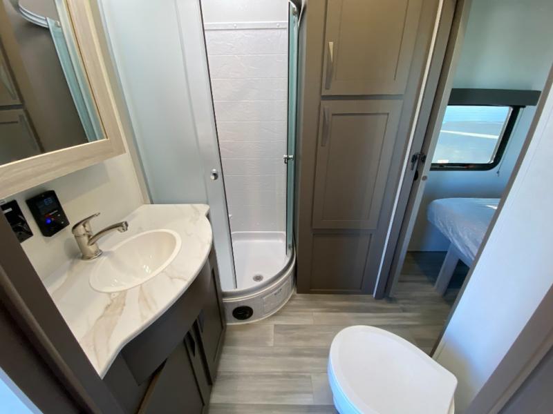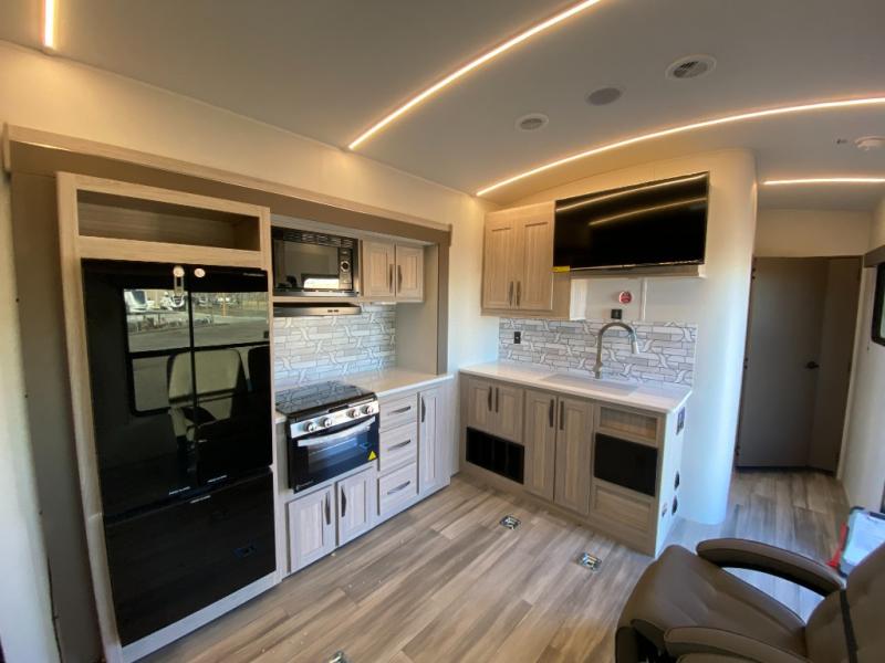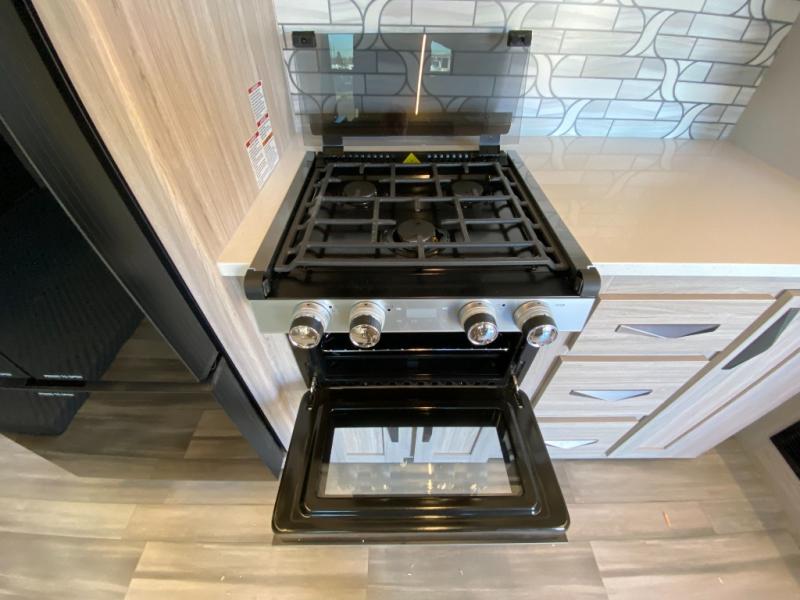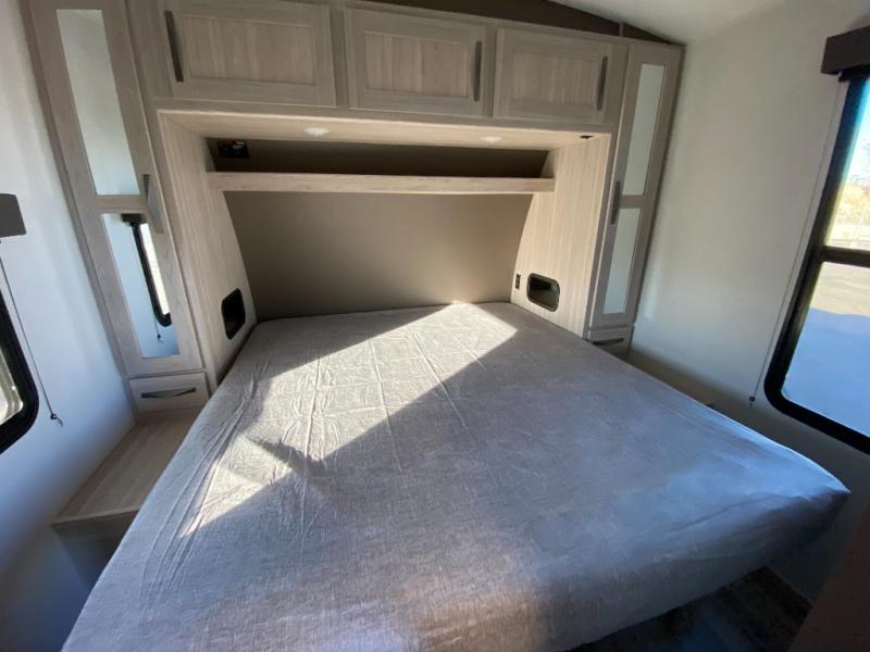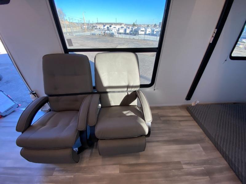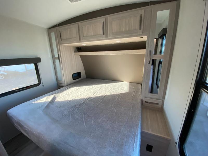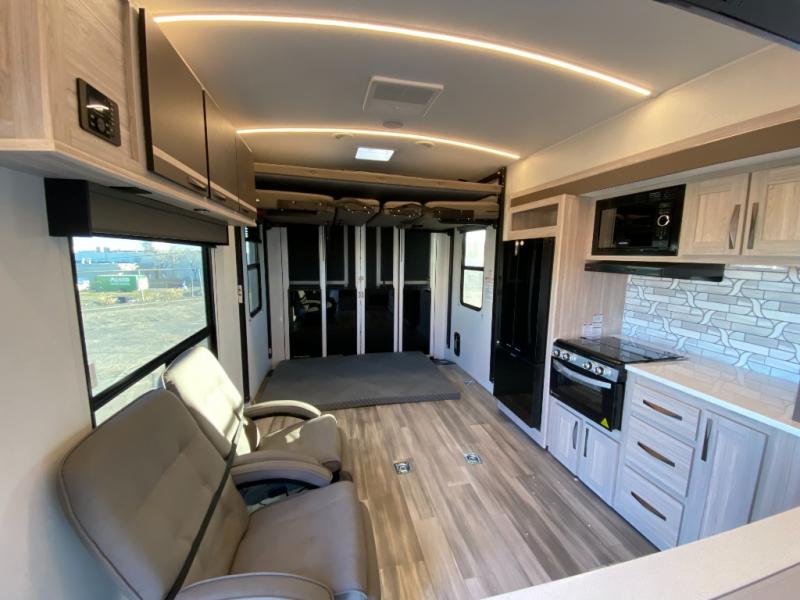 Just because you want to kick up some mud during the day, doesn't mean you can't enjoy at-home comforts in the evening. You can do just that and more in this toy hauler for six. After you've unloaded the side-by-side, fill it up with the 30 gallon fuel tank, then head out on an adventure. It will be so easy to clean up in the dual entry bath when you return, and the chef of your group can start lunch on the three burner cooktop. Everyone can dine at the opposing sofas with a dinette, or head outdoors to sit under the 19' power awning with LED lights. There are even two lounge chairs indoors if you want to enjoy a cup of coffee to relax. You'll find the king bed in the front master will give you plenty of space on either side of the bed to get dressed for bed, plus there are dual bedroom wardrobes to keep your clothes tidy!