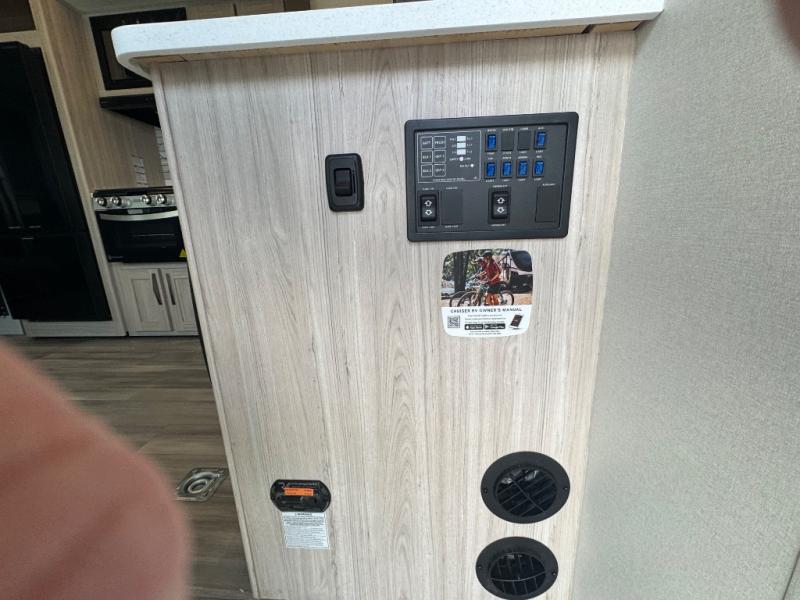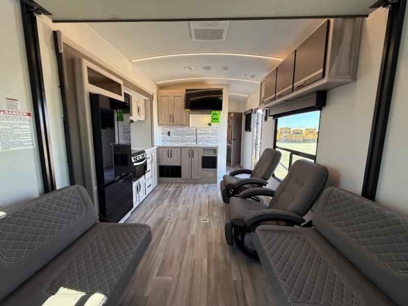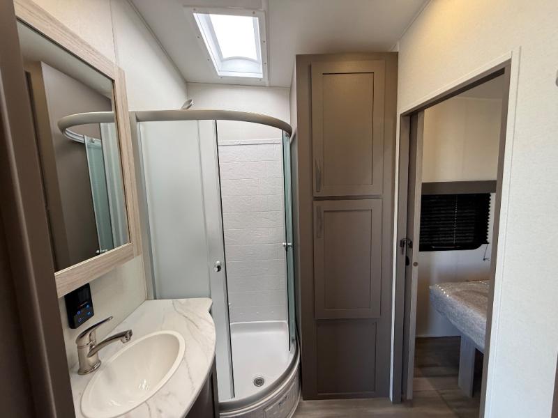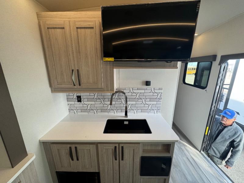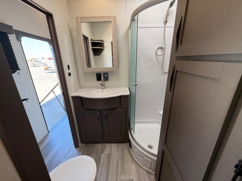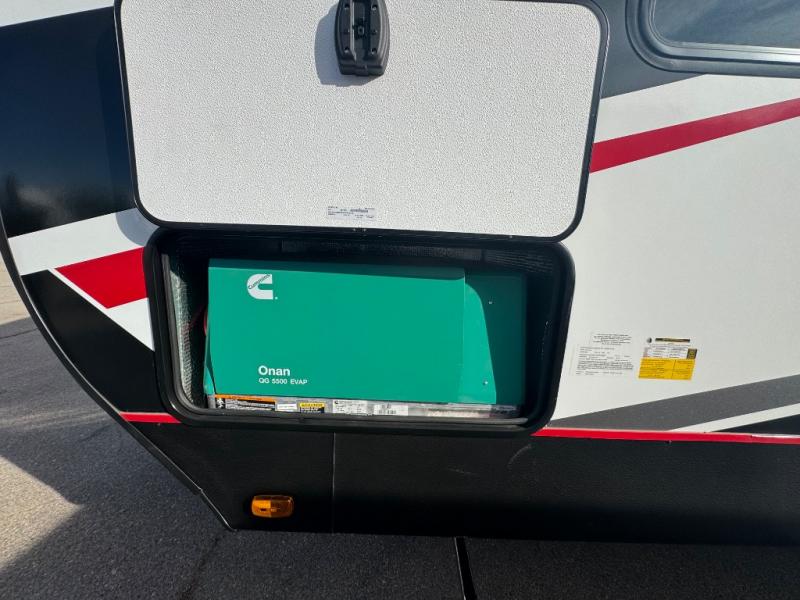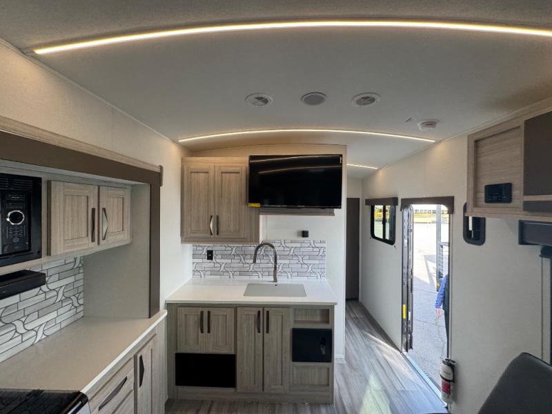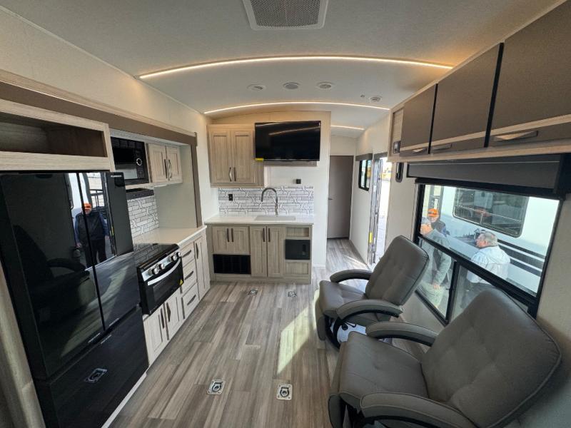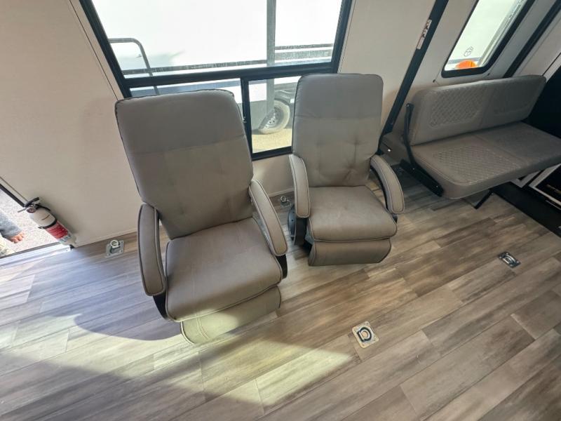 Just because you want to kick up some mud during the day, doesn't mean you can't enjoy at-home comforts in the evening. You can do just that and more in this toy hauler for six. After you've unloaded the side-by-side, fill it up with the 30 gallon fuel tank, then head out on an adventure. It will be so easy to clean up in the dual entry bath when you return, and the chef of your group can start lunch on the three burner cooktop. Everyone can dine at the opposing sofas with a dinette, or head outdoors to sit under the 19' power awning with LED lights. There are even two lounge chairs indoors if you want to enjoy a cup of coffee to relax. You'll find the king bed in the front master will give you plenty of space on either side of the bed to get dressed for bed, plus there are dual bedroom wardrobes to keep your clothes tidy!