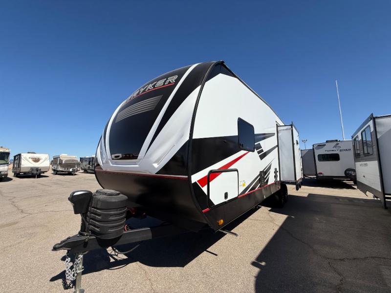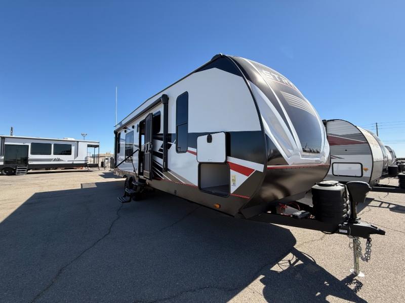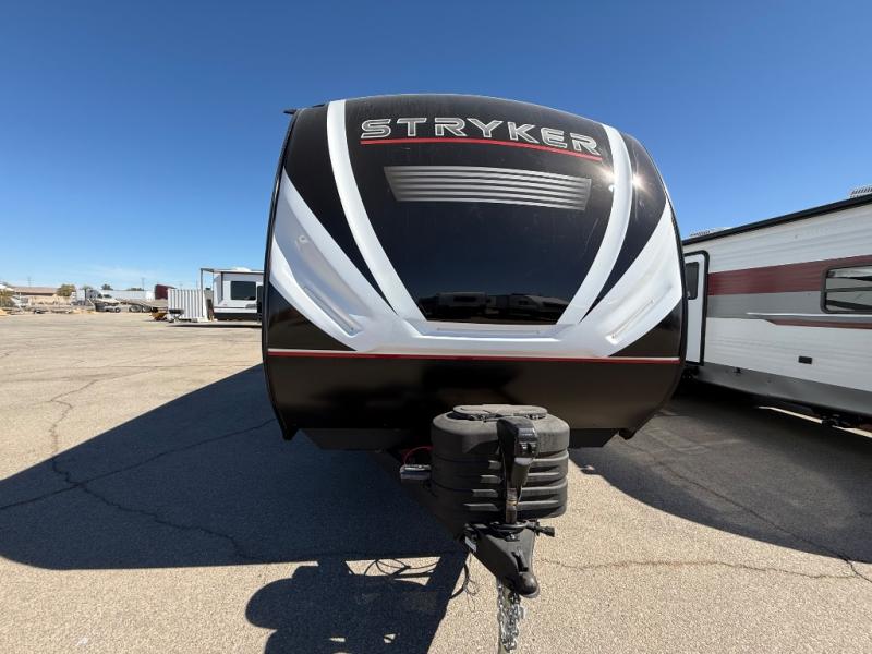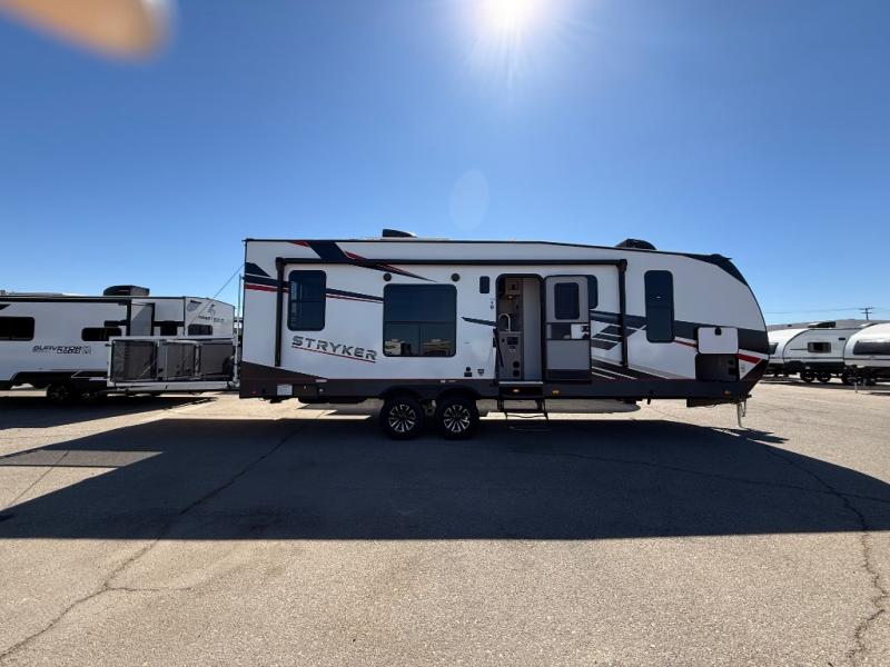 Each Stryker toy hauler travel trailer by Cruiser starts with a powder coated structural steel I-beam frame, Azdel composite laminated sidewalls, and a 102" wide body, perfect for your side-by-side, dirt bikes, or kayaks! The EZ flex rubberized suspension provides smooth towing on tougher roads, and the painted molded fiberglass front cap not only looks sleek, but provides better protection. Inside, you'll find barreled ceilings up to 98" in height, solid surface kitchen cabinets, and numerous USB ports and 110V outlets. There's so much more to love about the Stryker toy haulers, like the premium sound system, large windows, tons of storage space, and the list goes on!