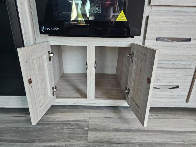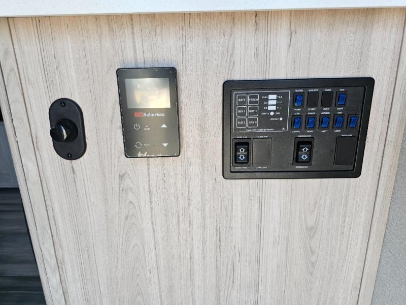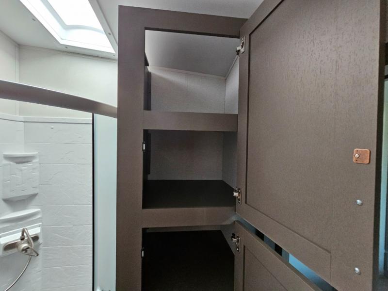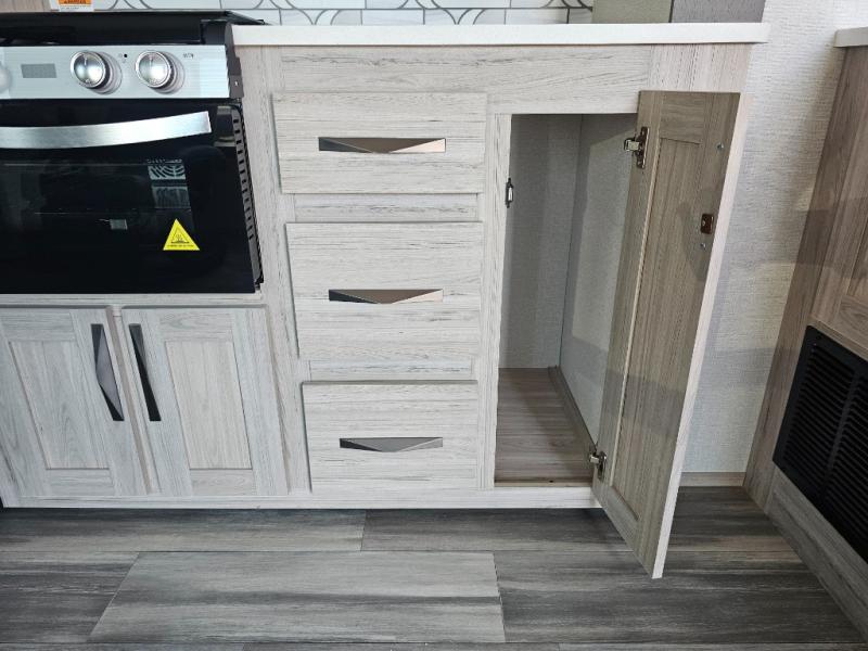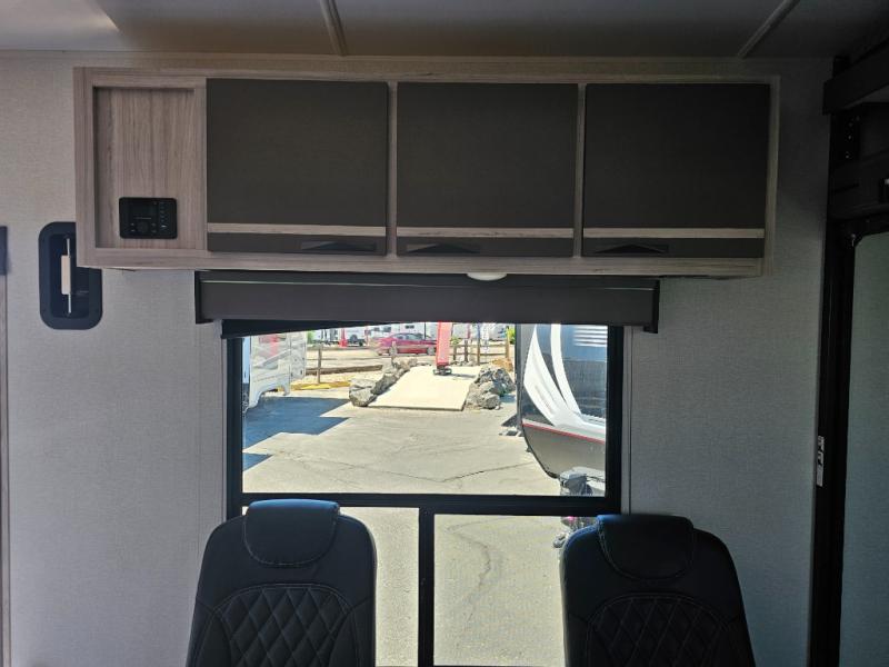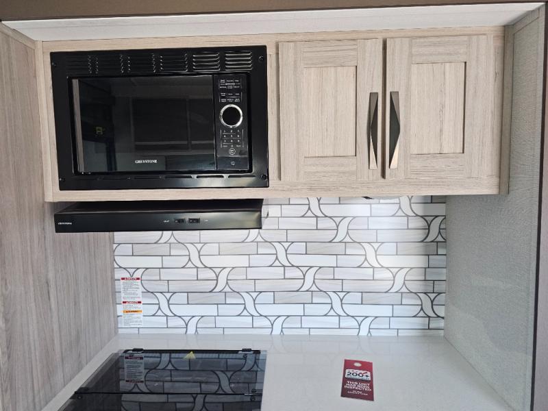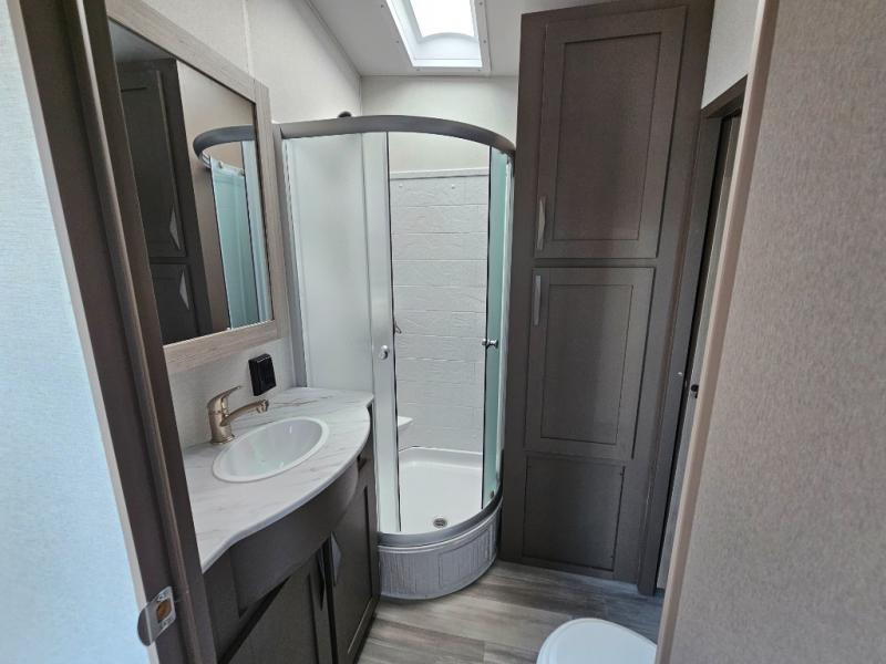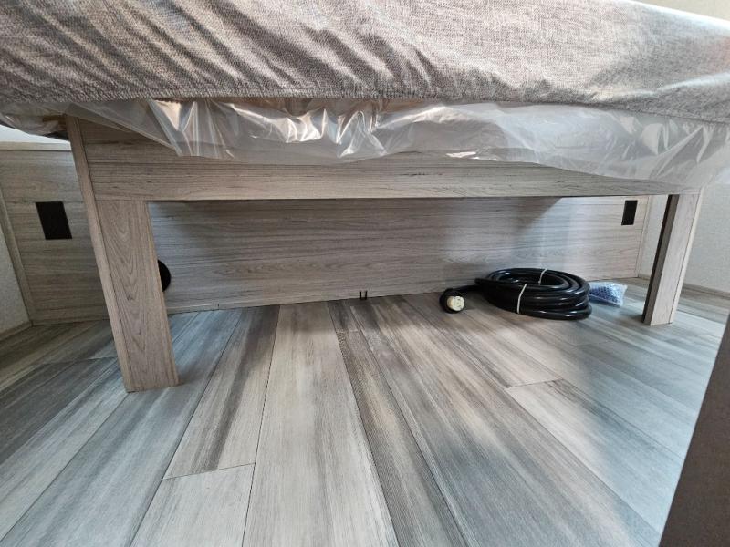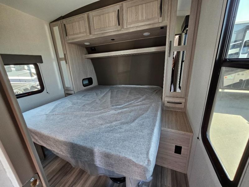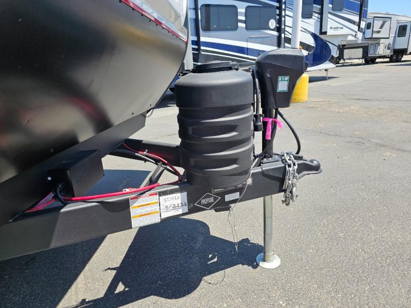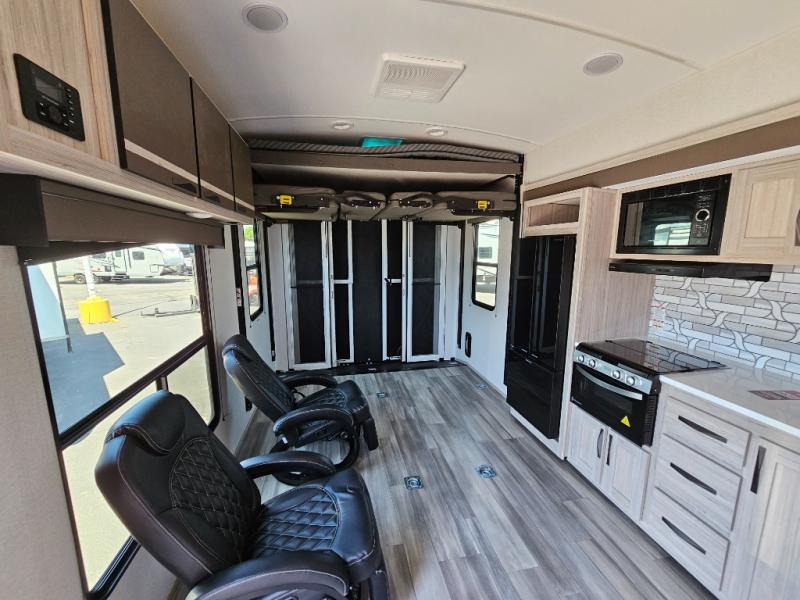Just because you want to kick up some mud during the day, doesn't mean you can't enjoy at-home comforts in the evening. You can do just that and more in this toy hauler for six. After you've unloaded the side-by-side, fill it up with the 30 gallon fuel tank, then head out on an adventure. It will be so easy to clean up in the dual entry bath when you return, and the chef of your group can start lunch on the three burner cooktop. Everyone can dine at the opposing sofas with a dinette, or head outdoors to sit under the 19' power awning with LED lights. There are even two lounge chairs indoors if you want to enjoy a cup of coffee to relax. You'll find the king bed in the front master will give you plenty of space on either side of the bed to get dressed for bed, plus there are dual bedroom wardrobes to keep your clothes tidy!