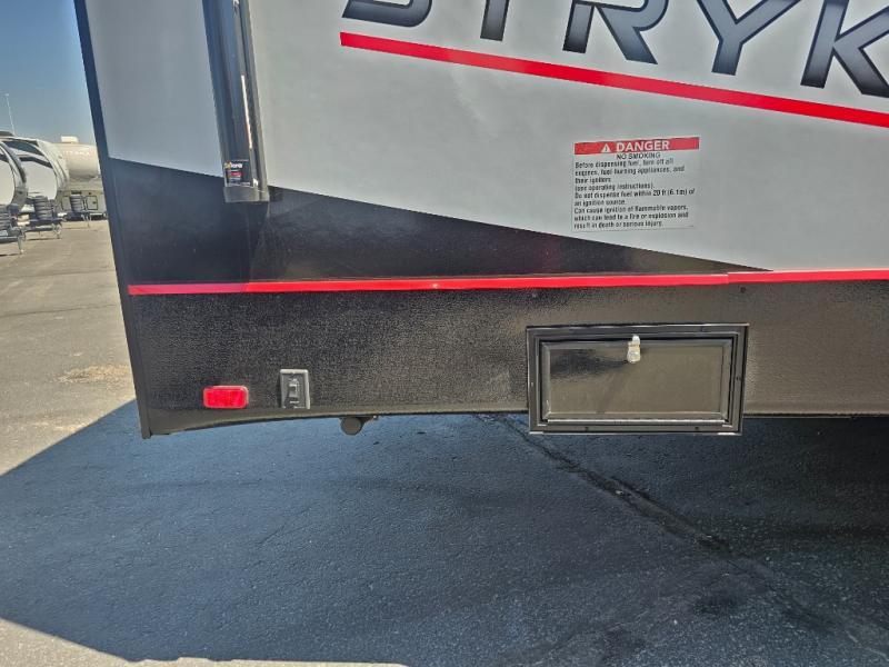 Each Stryker toy hauler travel trailer by Cruiser starts with a powder coated structural steel I-beam frame, Azdel composite laminated sidewalls, and a 102" wide body, perfect for your side-by-side, dirt bikes, or kayaks! The EZ flex rubberized suspension provides smooth towing on tougher roads, and the painted molded fiberglass front cap not only looks sleek, but provides better protection. Inside, you'll find barreled ceilings up to 98" in height, solid surface kitchen cabinets, and numerous USB ports and 110V outlets. There's so much more to love about the Stryker toy haulers, like the premium sound system, large windows, tons of storage space, and the list goes on!