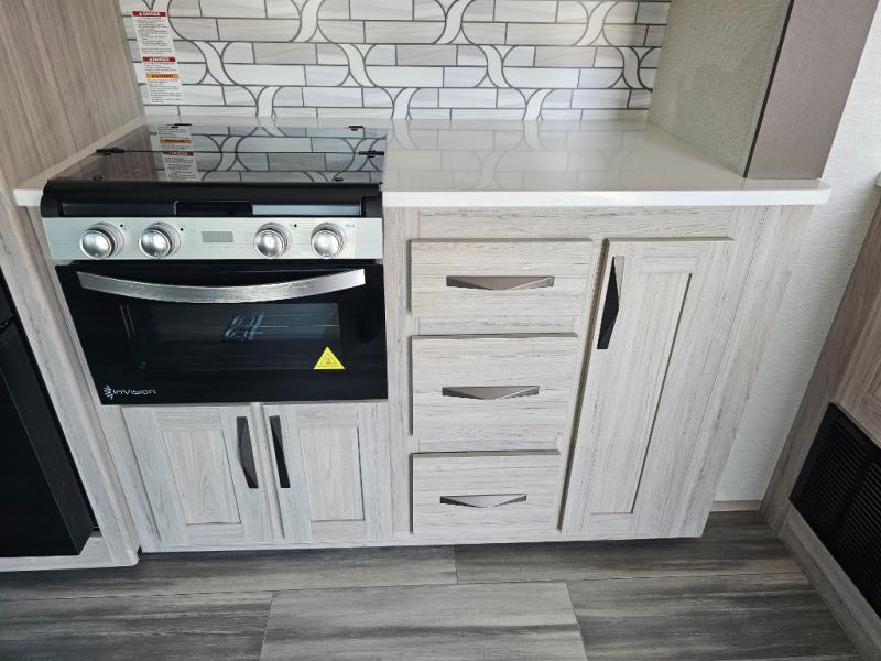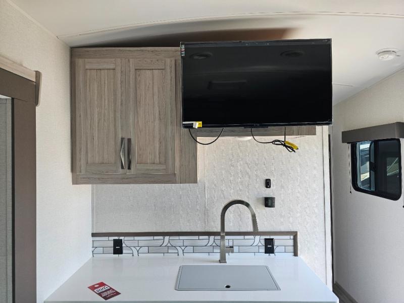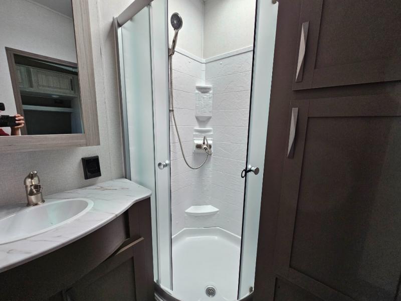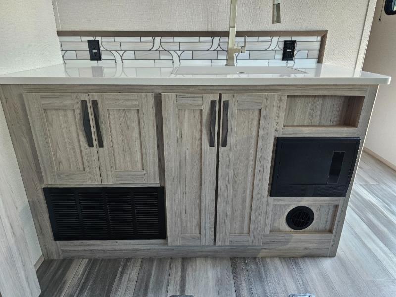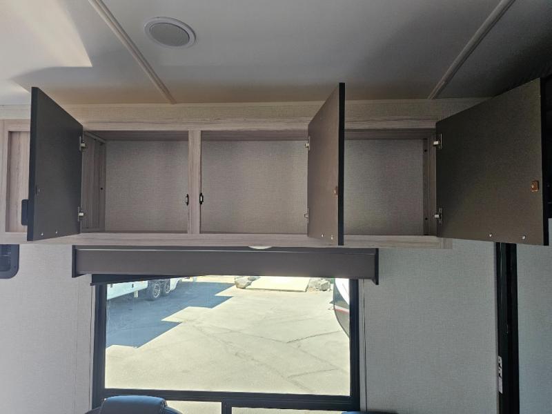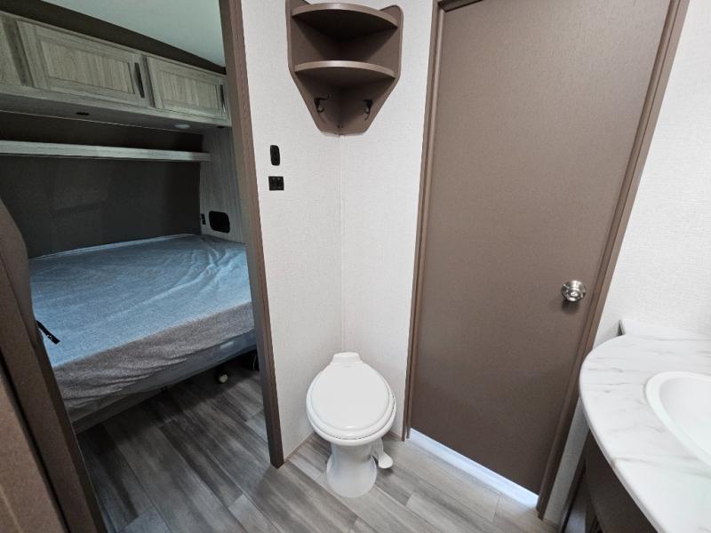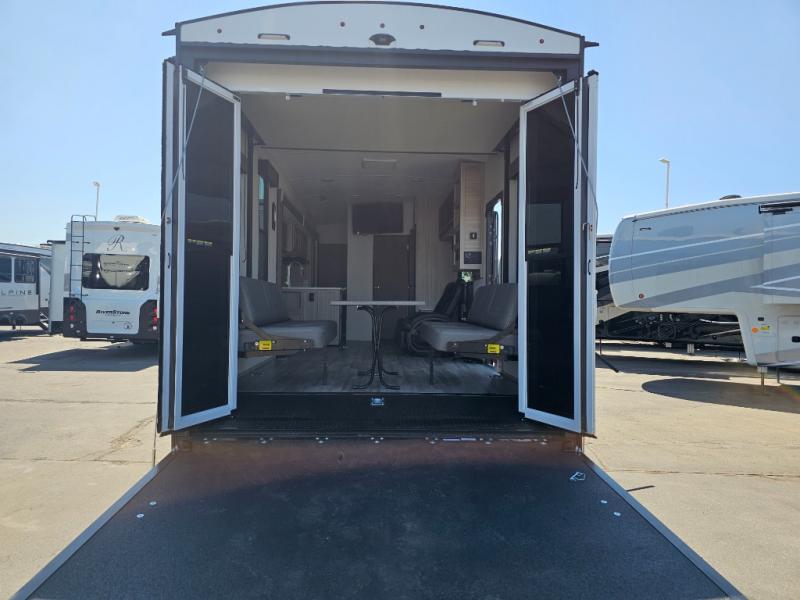 Just because you want to kick up some mud during the day, doesn't mean you can't enjoy at-home comforts in the evening. You can do just that and more in this toy hauler for six. After you've unloaded the side-by-side, fill it up with the 30 gallon fuel tank, then head out on an adventure. It will be so easy to clean up in the dual entry bath when you return, and the chef of your group can start lunch on the three burner cooktop. Everyone can dine at the opposing sofas with a dinette, or head outdoors to sit under the 19' power awning with LED lights. There are even two lounge chairs indoors if you want to enjoy a cup of coffee to relax. You'll find the king bed in the front master will give you plenty of space on either side of the bed to get dressed for bed, plus there are dual bedroom wardrobes to keep your clothes tidy!