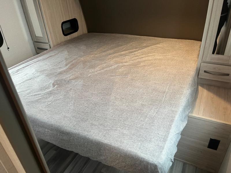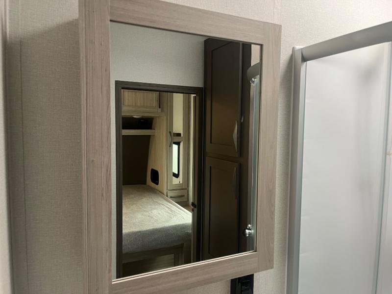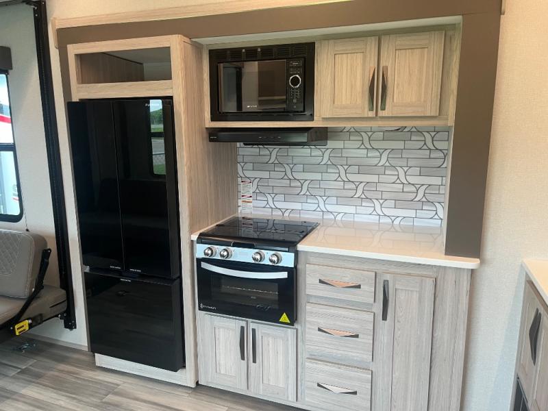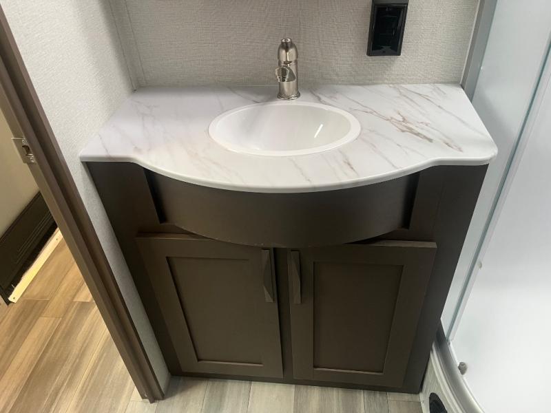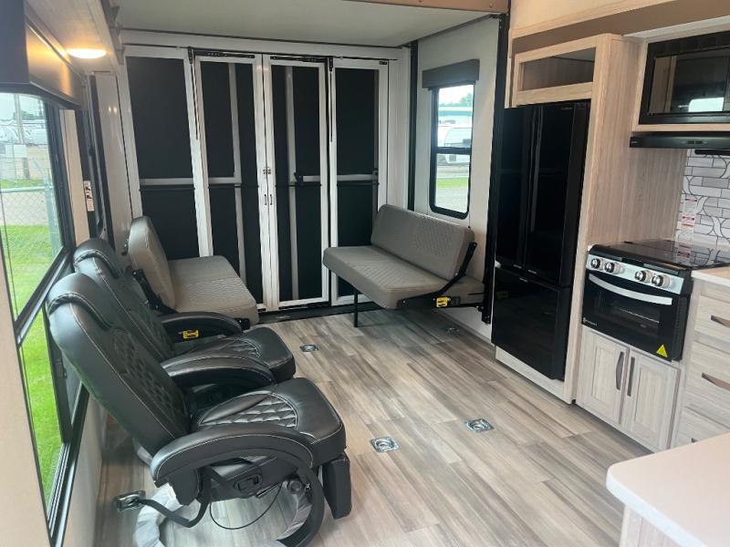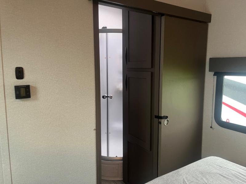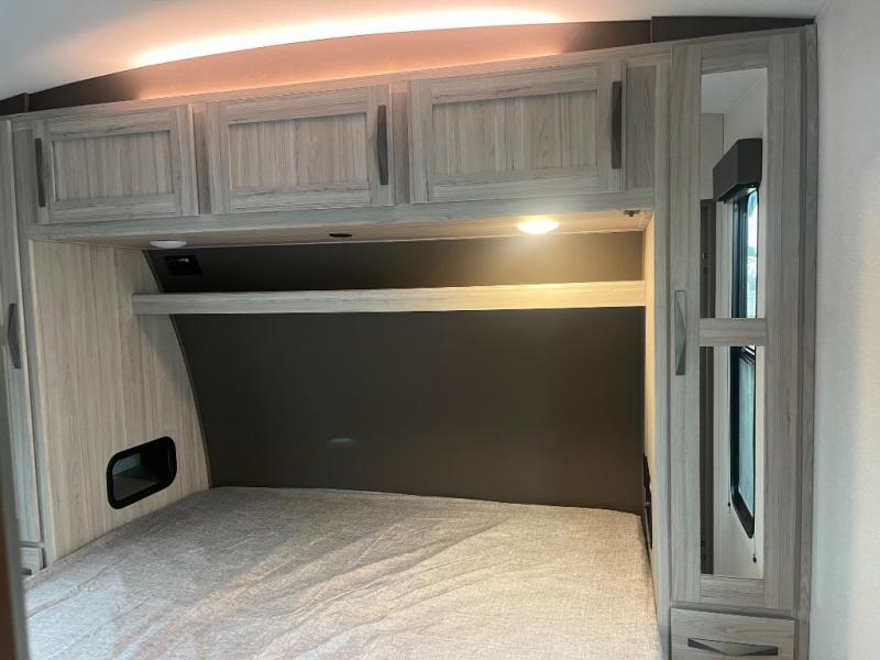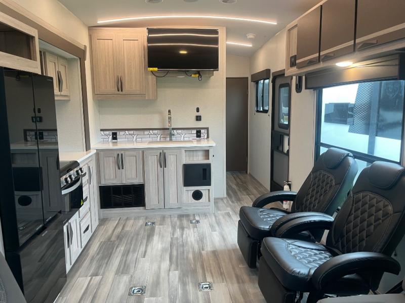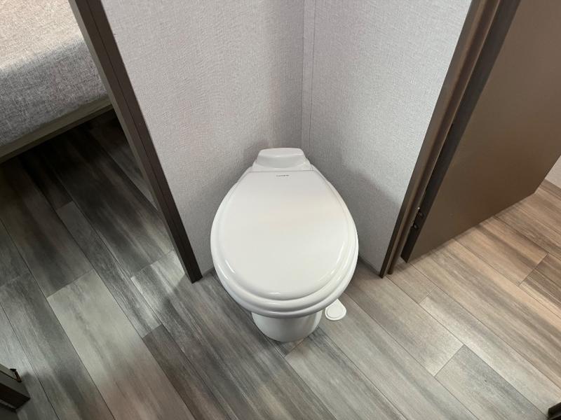 Just because you want to kick up some mud during the day, doesn't mean you can't enjoy at-home comforts in the evening. You can do just that and more in this toy hauler for six. After you've unloaded the side-by-side, fill it up with the 30 gallon fuel tank, then head out on an adventure. It will be so easy to clean up in the dual entry bath when you return, and the chef of your group can start lunch on the three burner cooktop. Everyone can dine at the opposing sofas with a dinette, or head outdoors to sit under the 19' power awning with LED lights. There are even two lounge chairs indoors if you want to enjoy a cup of coffee to relax. You'll find the king bed in the front master will give you plenty of space on either side of the bed to get dressed for bed, plus there are dual bedroom wardrobes to keep your clothes tidy!