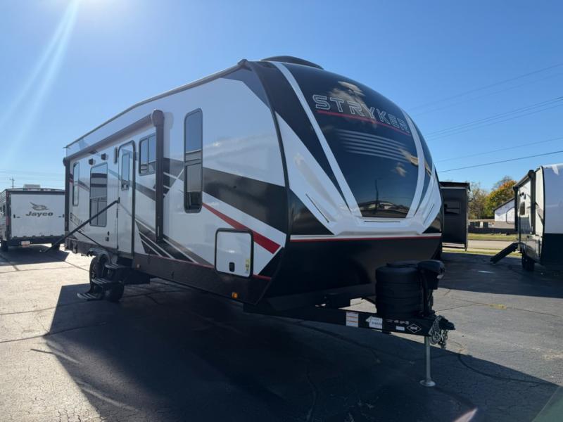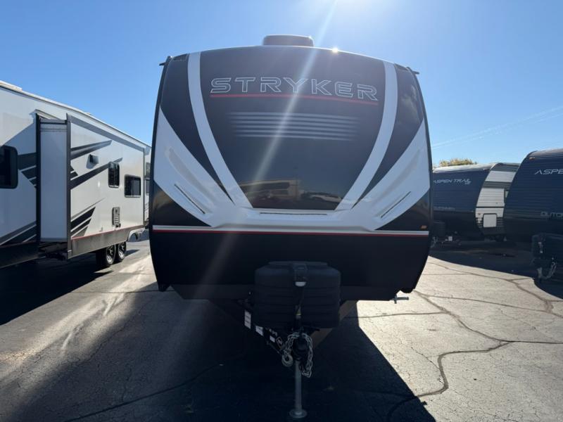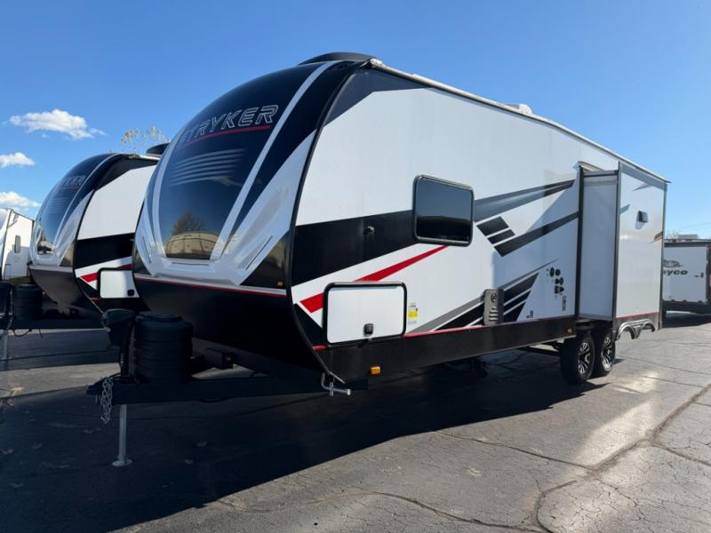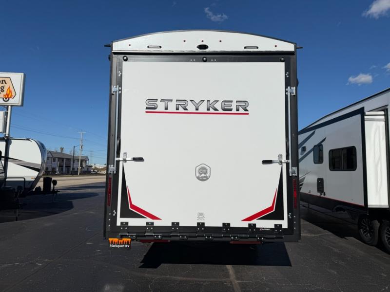 Each Stryker toy hauler travel trailer by Cruiser starts with a powder coated structural steel I-beam frame, Azdel composite laminated sidewalls, and a 102" wide body, perfect for your side-by-side, dirt bikes, or kayaks! The EZ flex rubberized suspension provides smooth towing on tougher roads, and the painted molded fiberglass front cap not only looks sleek, but provides better protection. Inside, you'll find barreled ceilings up to 98" in height, solid surface kitchen cabinets, and numerous USB ports and 110V outlets. There's so much more to love about the Stryker toy haulers, like the premium sound system, large windows, tons of storage space, and the list goes on!