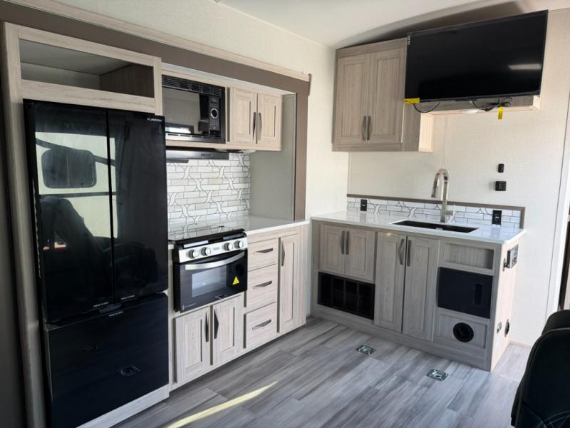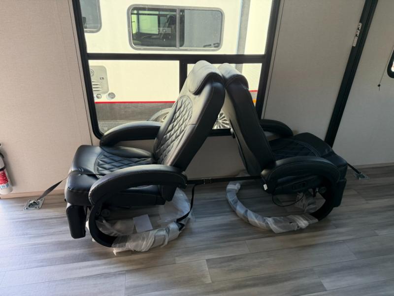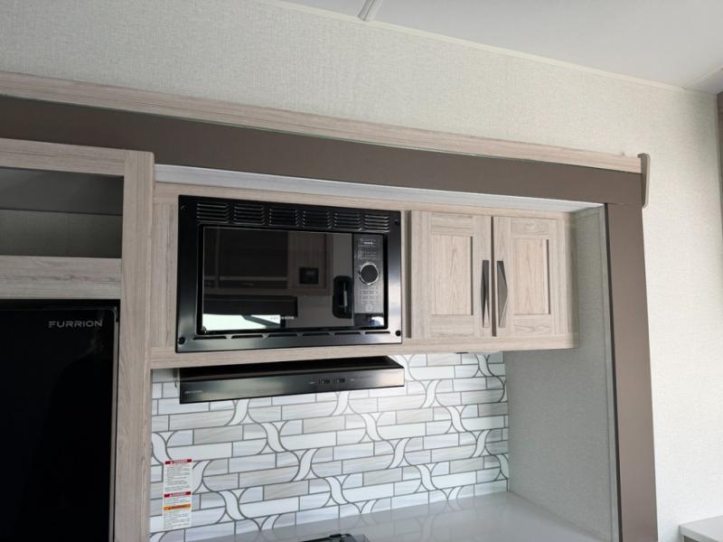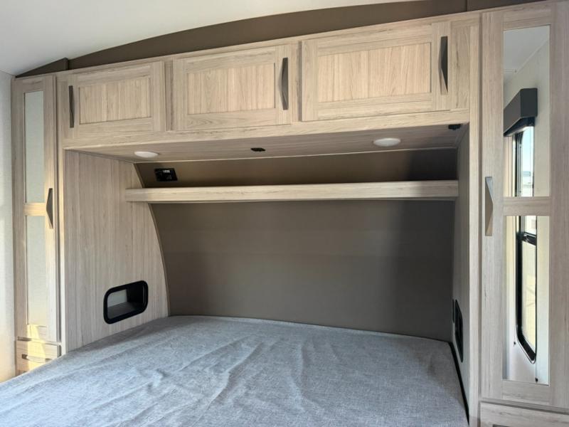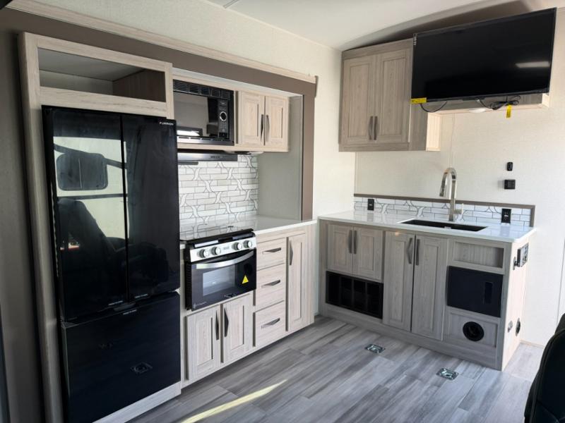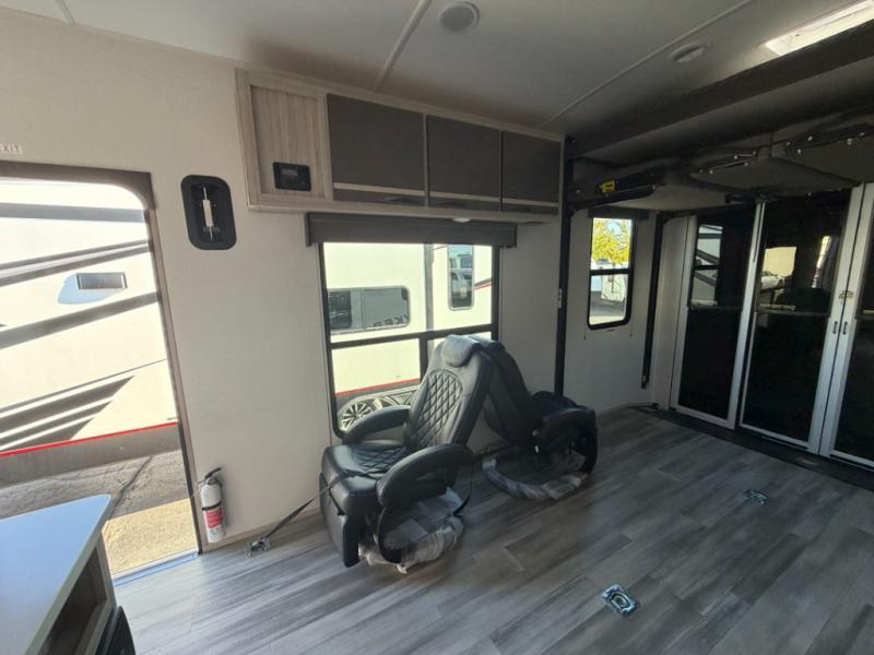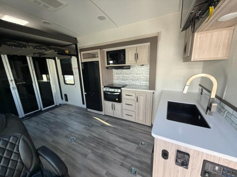 Just because you want to kick up some mud during the day, doesn't mean you can't enjoy at-home comforts in the evening. You can do just that and more in this toy hauler for six. After you've unloaded the side-by-side, fill it up with the 30 gallon fuel tank, then head out on an adventure. It will be so easy to clean up in the dual entry bath when you return, and the chef of your group can start lunch on the three burner cooktop. Everyone can dine at the opposing sofas with a dinette, or head outdoors to sit under the 19' power awning with LED lights. There are even two lounge chairs indoors if you want to enjoy a cup of coffee to relax. You'll find the king bed in the front master will give you plenty of space on either side of the bed to get dressed for bed, plus there are dual bedroom wardrobes to keep your clothes tidy!
