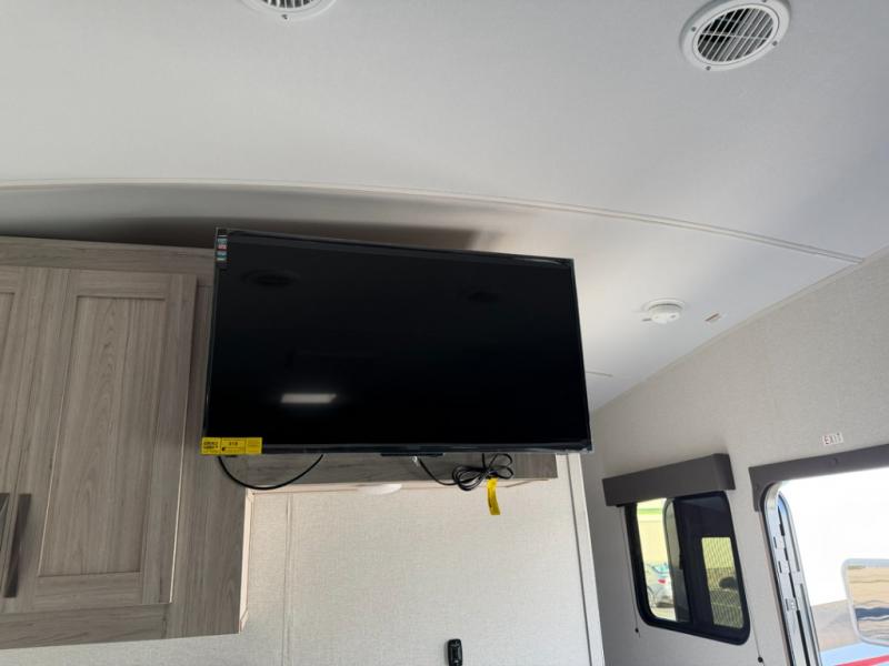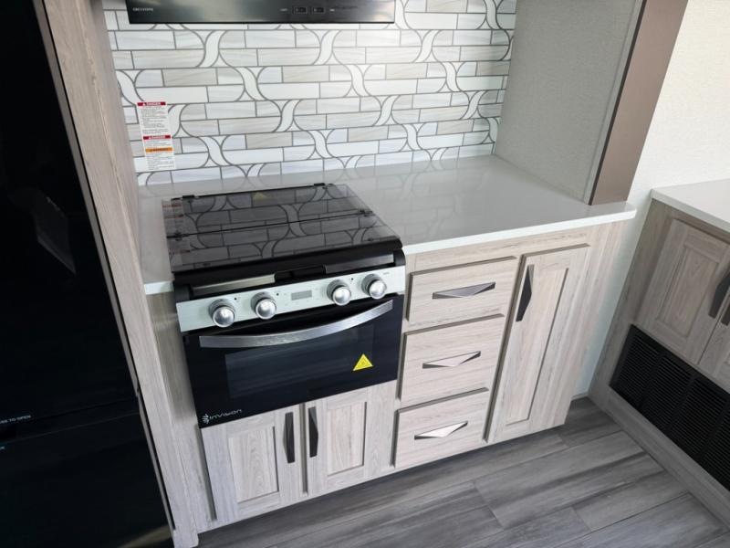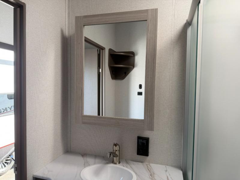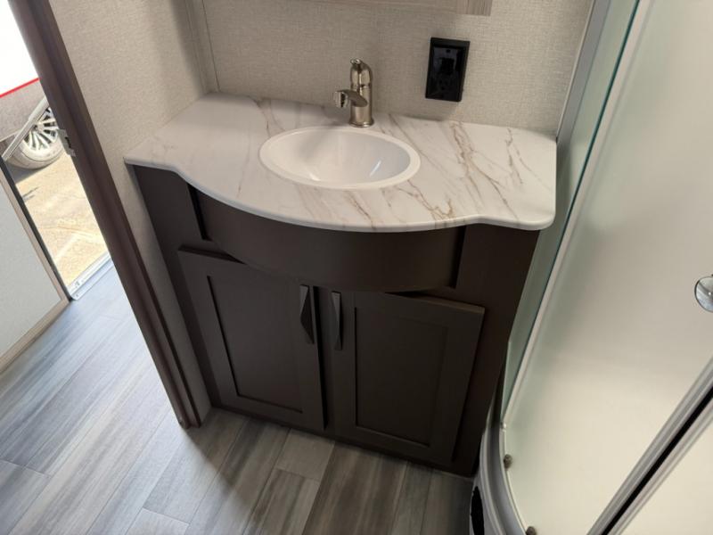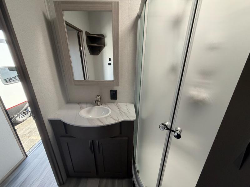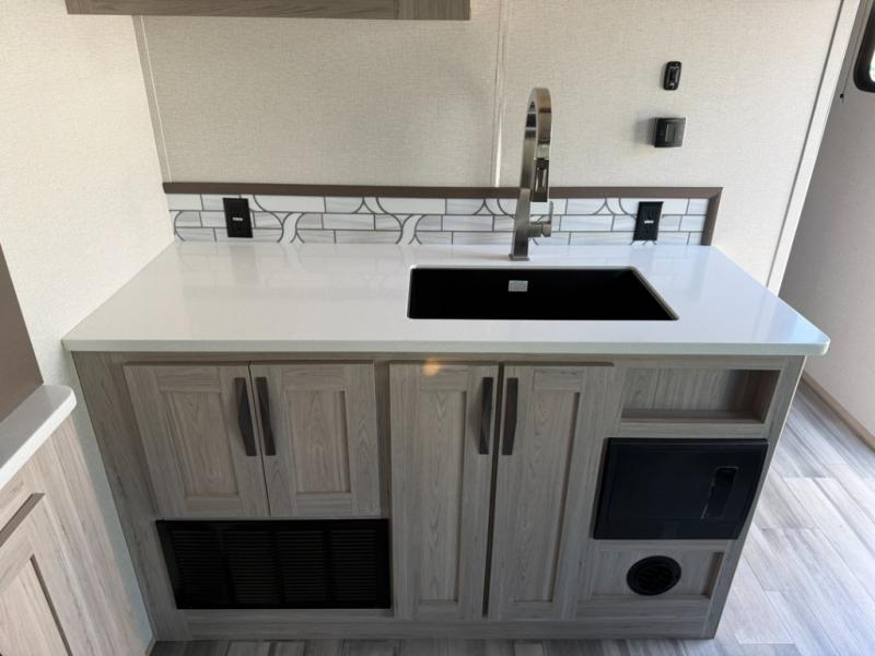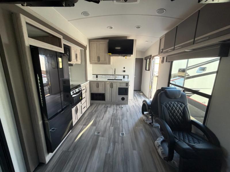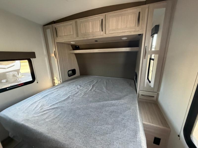 Just because you want to kick up some mud during the day, doesn't mean you can't enjoy at-home comforts in the evening. You can do just that and more in this toy hauler for six. After you've unloaded the side-by-side, fill it up with the 30 gallon fuel tank, then head out on an adventure. It will be so easy to clean up in the dual entry bath when you return, and the chef of your group can start lunch on the three burner cooktop. Everyone can dine at the opposing sofas with a dinette, or head outdoors to sit under the 19' power awning with LED lights. There are even two lounge chairs indoors if you want to enjoy a cup of coffee to relax. You'll find the king bed in the front master will give you plenty of space on either side of the bed to get dressed for bed, plus there are dual bedroom wardrobes to keep your clothes tidy!