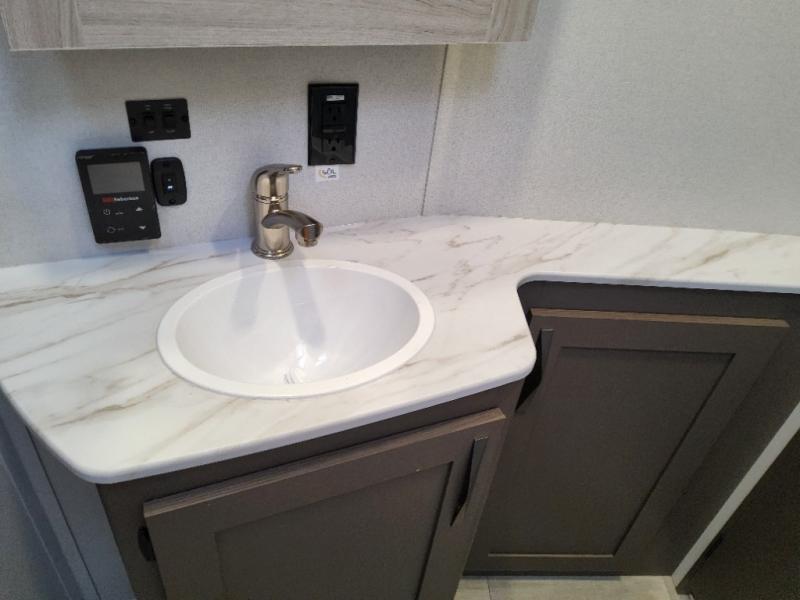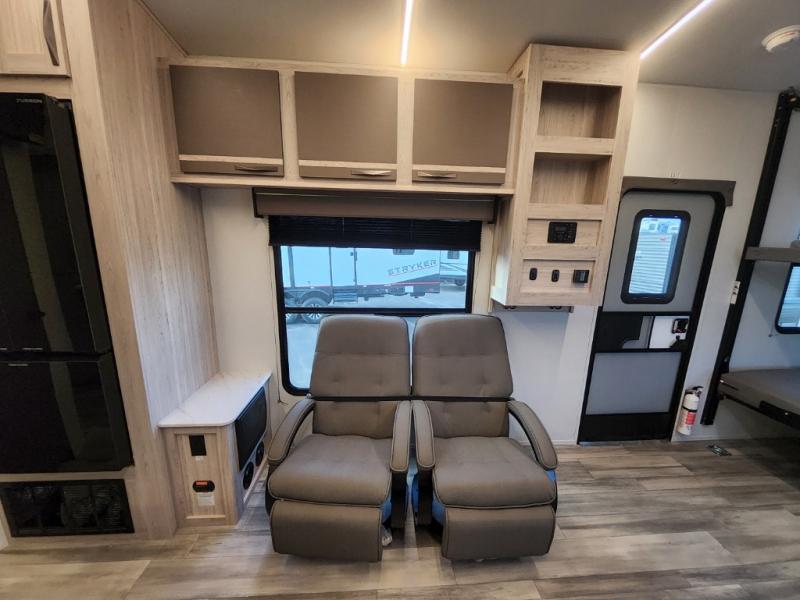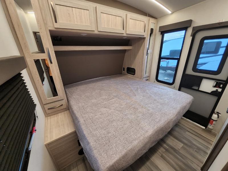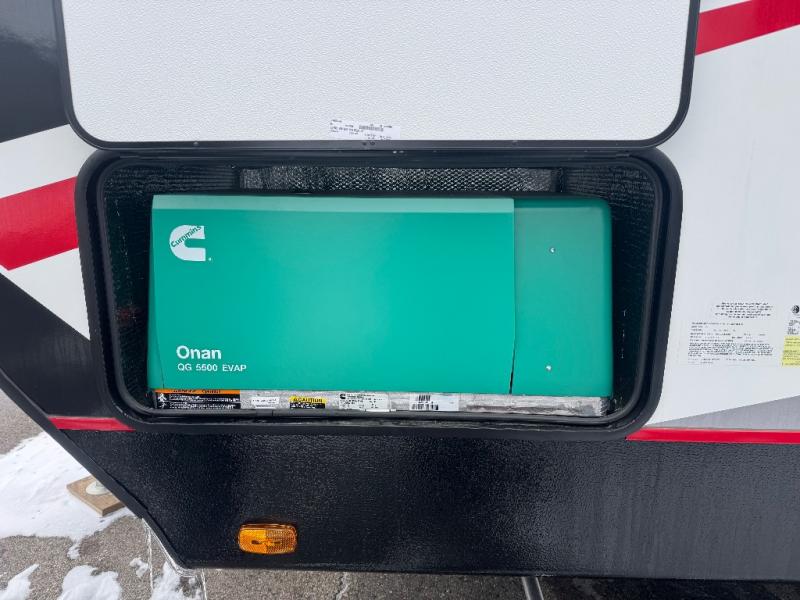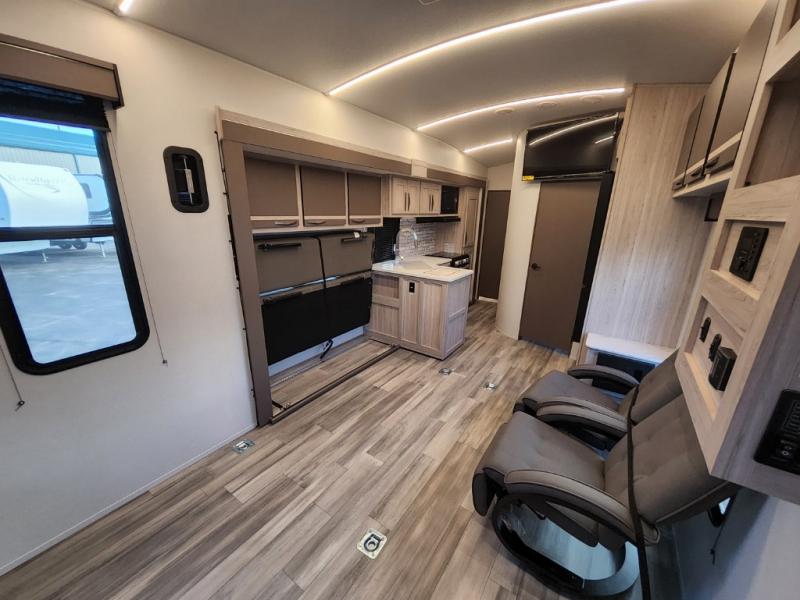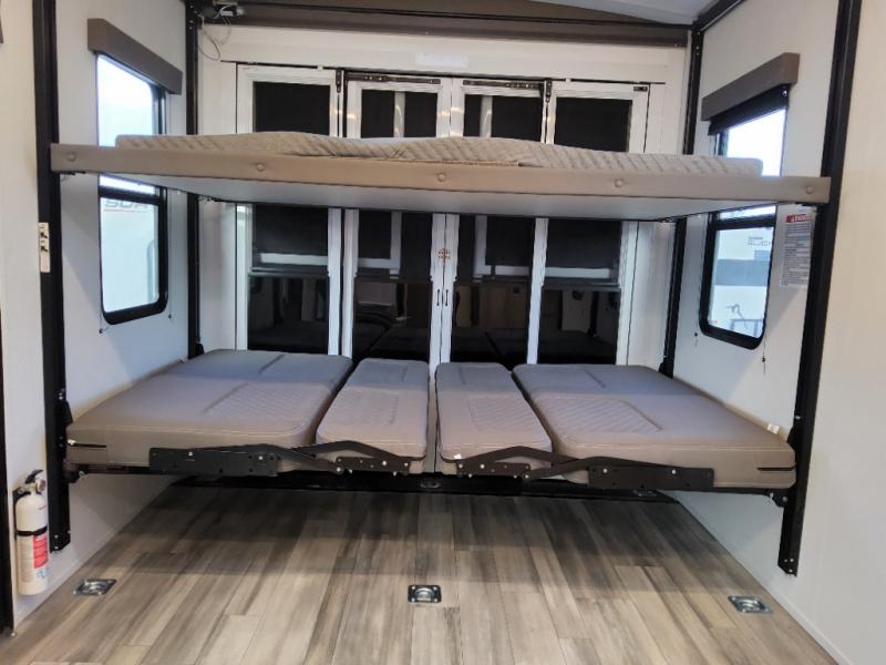 You can't go wrong with this dual entry toy hauler in tow! Once you arrive at the campground, fill up the bikes using the convenient 30 gallon fuel station, then head out on a trail or two! There is a dual entry bath on board that will allow you to clean up before heading to the kitchen to start dinner. You will love the large slide out that will provide more space when cooking, and there is a sofa with a table to dine at. You may just want to kick back on the dual lounge chairs before starting the dishes. Sleeping space can be found on the king bed in the front bedroom, or on the opposing sofas and power queen bed in the garage!