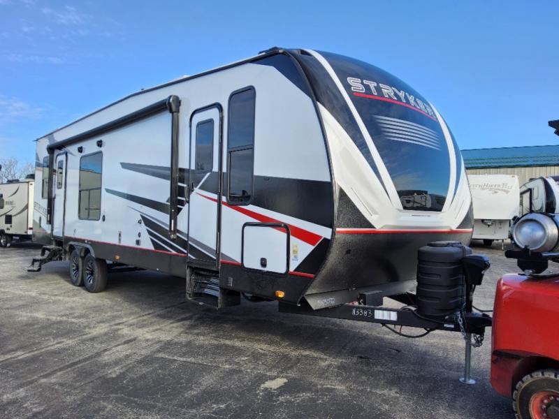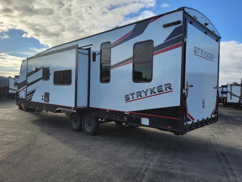 Each Stryker toy hauler travel trailer by Cruiser starts with a powder coated structural steel I-beam frame, Azdel composite laminated sidewalls, and a 102" wide body, perfect for your side-by-side, dirt bikes, or kayaks! The EZ flex rubberized suspension provides smooth towing on tougher roads, and the painted molded fiberglass front cap not only looks sleek, but provides better protection. Inside, you'll find barreled ceilings up to 98" in height, solid surface kitchen cabinets, and numerous USB ports and 110V outlets. There's so much more to love about the Stryker toy haulers, like the premium sound system, large windows, tons of storage space, and the list goes on!