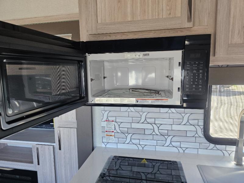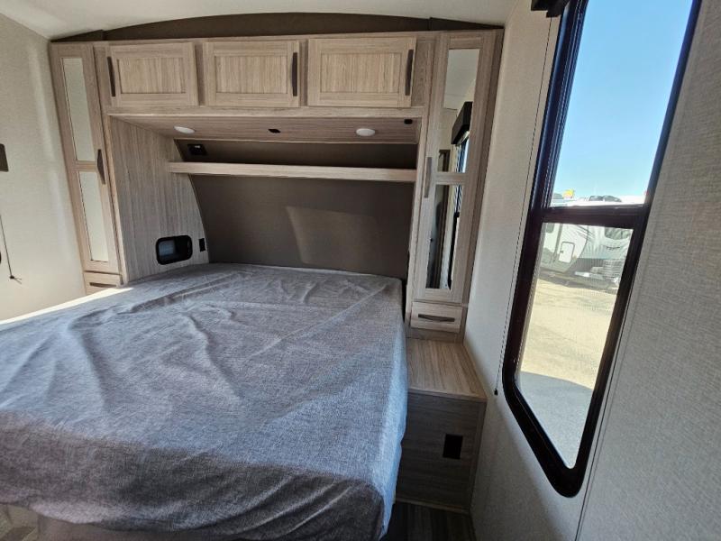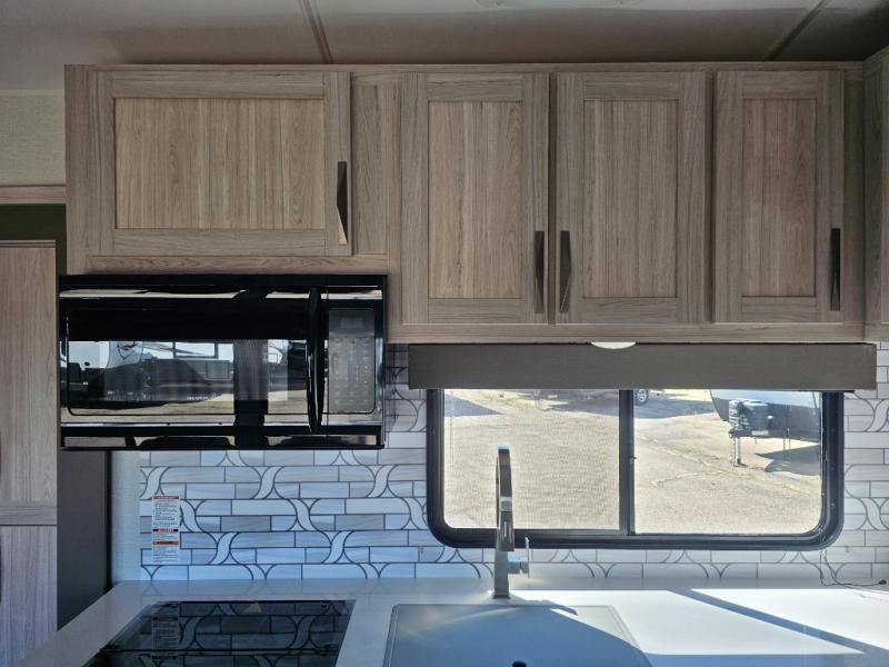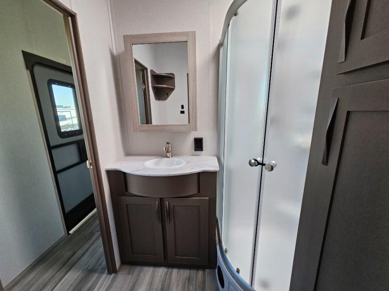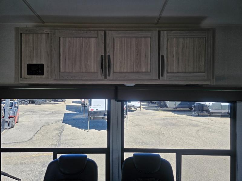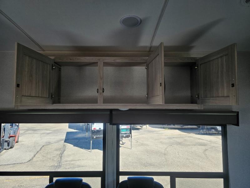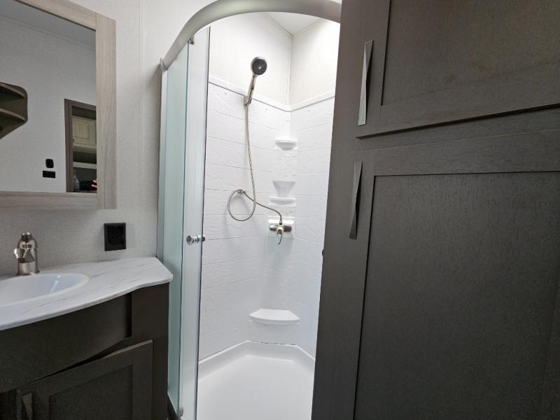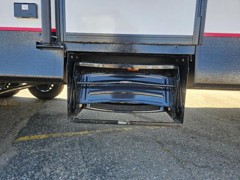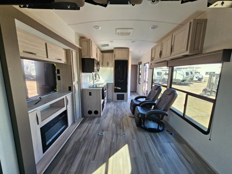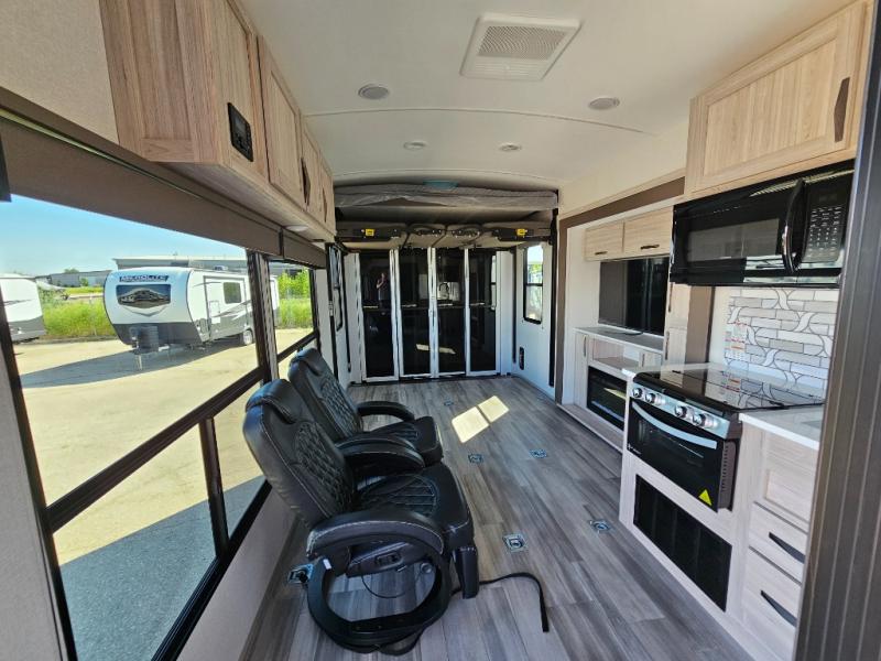 This toy hauler with an 18' garage is sure to meet all your expectations. Once the dirt bikes are unloaded, you can relax on the opposing sofa with a dinette, and there is an optional three seasons glass door that can be added for more convenience. The dual lounge chairs across from the fireplace slide out will make your space feel more like home, and the full kitchen lets you make meals each day. You'll also find a dual entry bath that will create a front master bedroom. Here, a king bed will provide a great night's rest and the dual wardrobes help keep your space tidy!