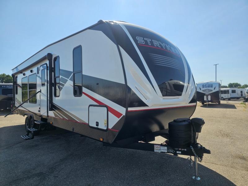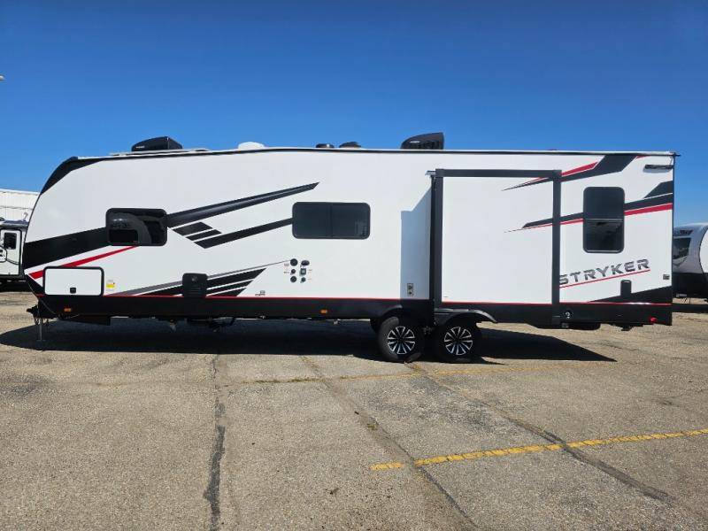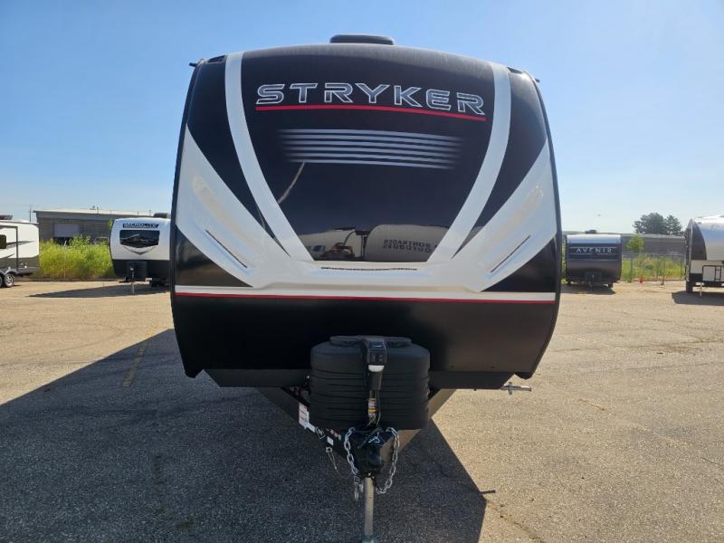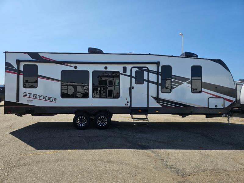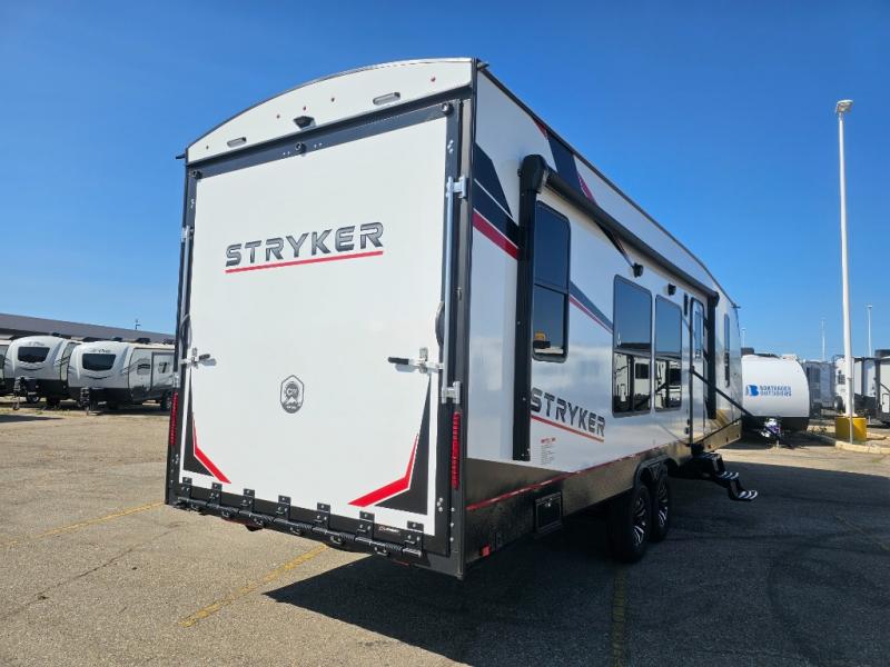 Each Stryker toy hauler travel trailer by Cruiser starts with a powder coated structural steel I-beam frame, Azdel composite laminated sidewalls, and a 102" wide body, perfect for your side-by-side, dirt bikes, or kayaks! The EZ flex rubberized suspension provides smooth towing on tougher roads, and the painted molded fiberglass front cap not only looks sleek, but provides better protection. Inside, you'll find barreled ceilings up to 98" in height, solid surface kitchen cabinets, and numerous USB ports and 110V outlets. There's so much more to love about the Stryker toy haulers, like the premium sound system, large windows, tons of storage space, and the list goes on!