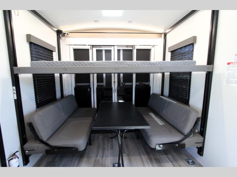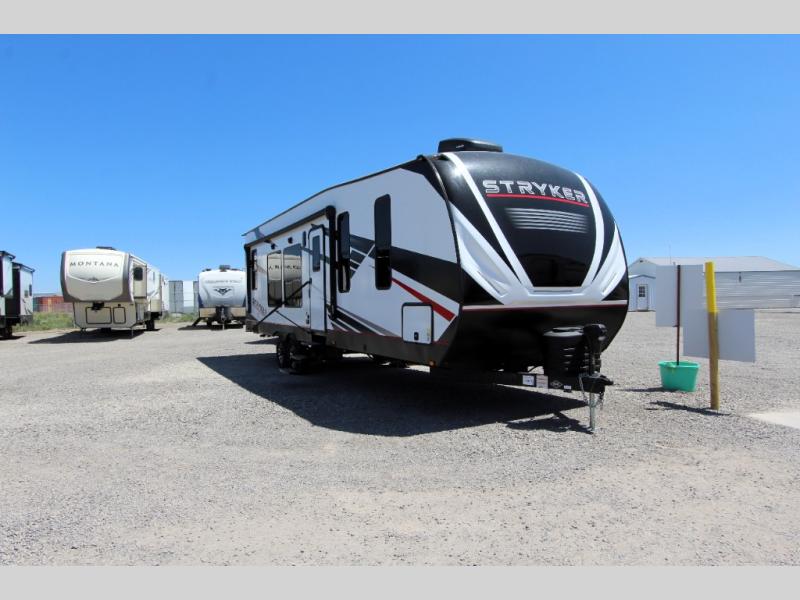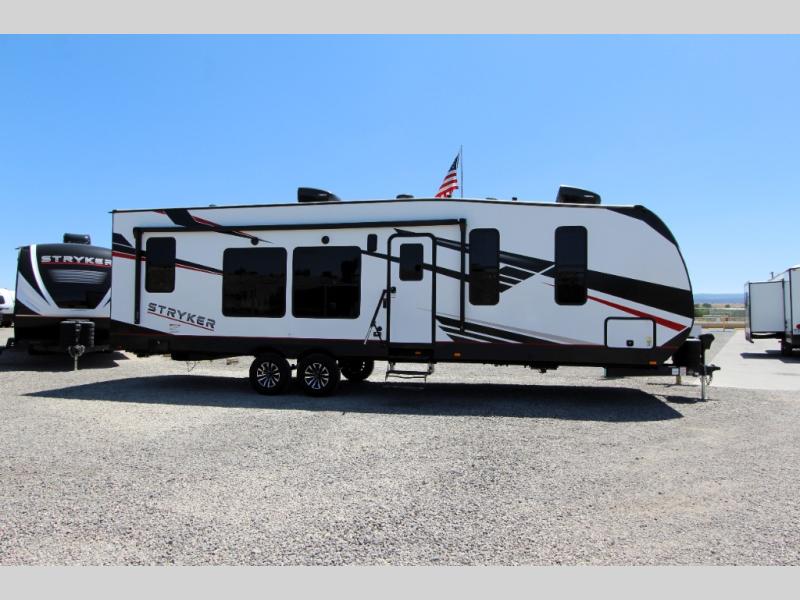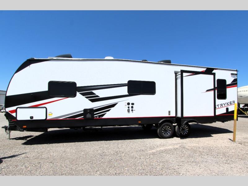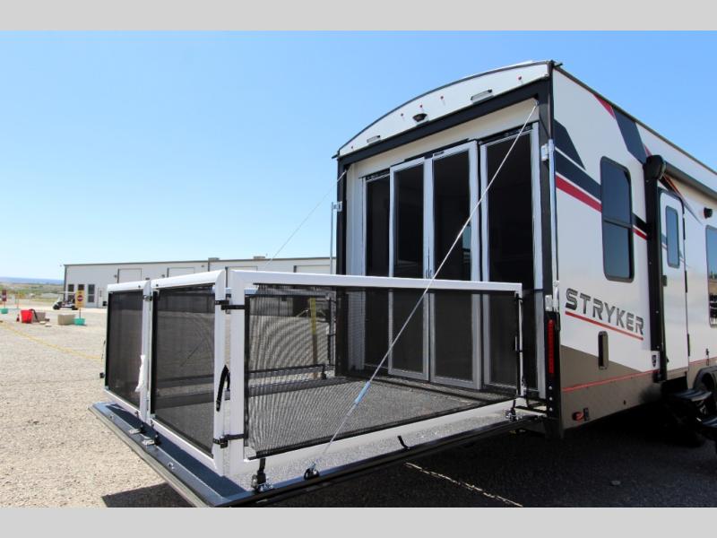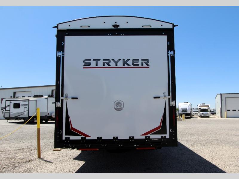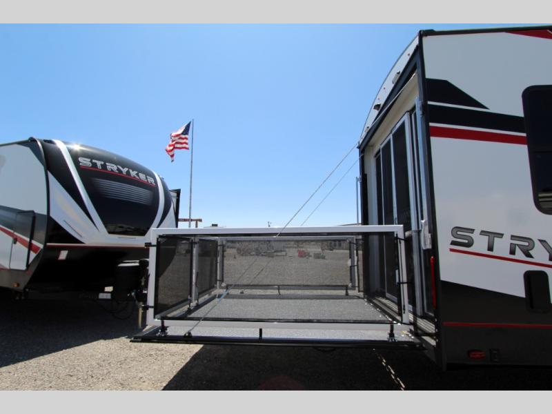 Each Stryker toy hauler travel trailer by Cruiser starts with a powder coated structural steel I-beam frame, Azdel composite laminated sidewalls, and a 102" wide body, perfect for your side-by-side, dirt bikes, or kayaks! The EZ flex rubberized suspension provides smooth towing on tougher roads, and the painted molded fiberglass front cap not only looks sleek, but provides better protection. Inside, you'll find barreled ceilings up to 98" in height, solid surface kitchen cabinets, and numerous USB ports and 110V outlets. There's so much more to love about the Stryker toy haulers, like the premium sound system, large windows, tons of storage space, and the list goes on!