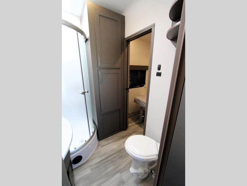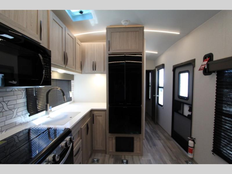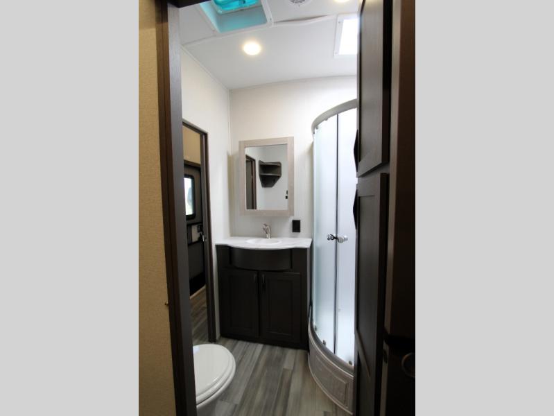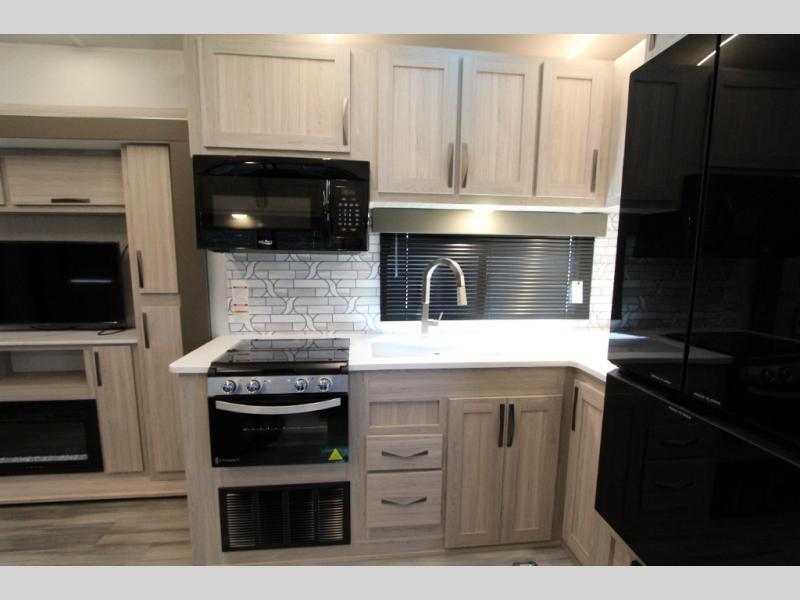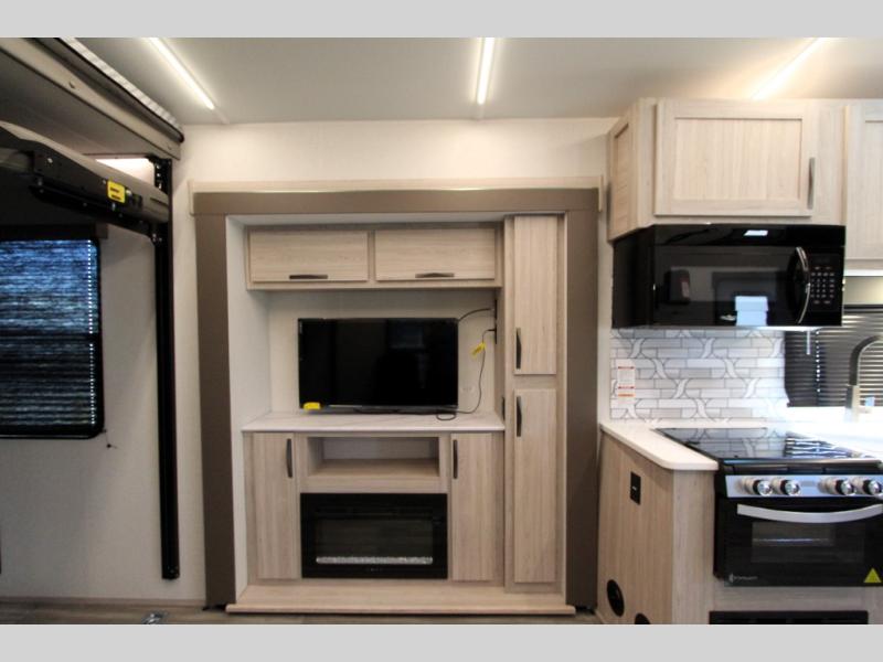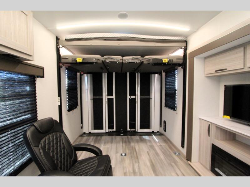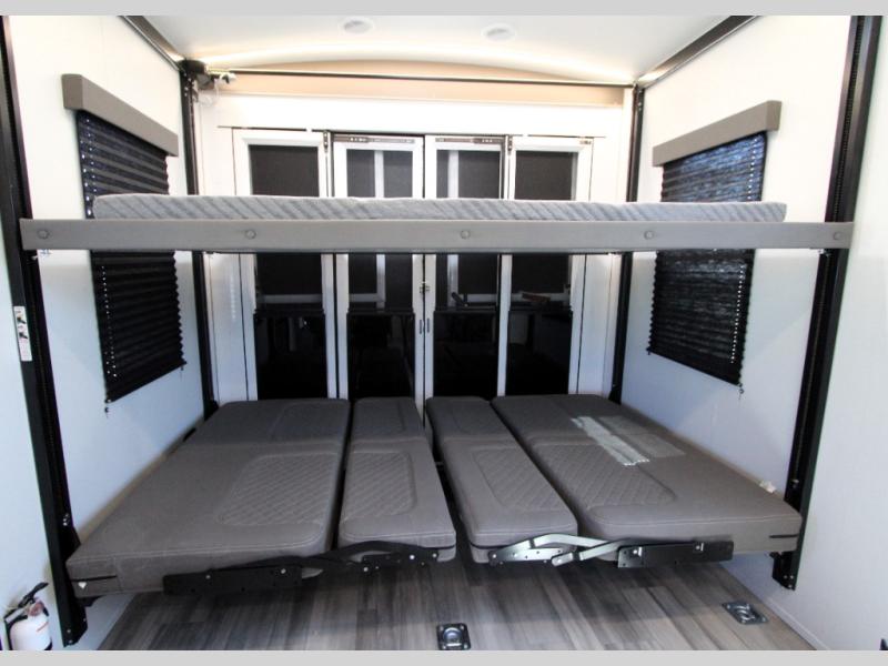 This toy hauler with an 18' garage is sure to meet all your expectations. Once the dirt bikes are unloaded, you can relax on the opposing sofa with a dinette, and there is an optional three seasons glass door that can be added for more convenience. The dual lounge chairs across from the fireplace slide out will make your space feel more like home, and the full kitchen lets you make meals each day. You'll also find a dual entry bath that will create a front master bedroom. Here, a king bed will provide a great night's rest and the dual wardrobes help keep your space tidy!