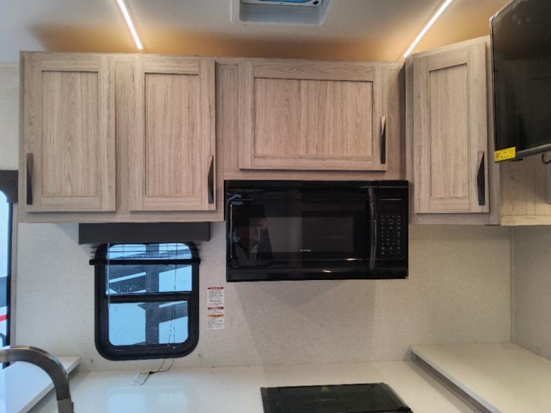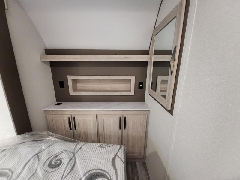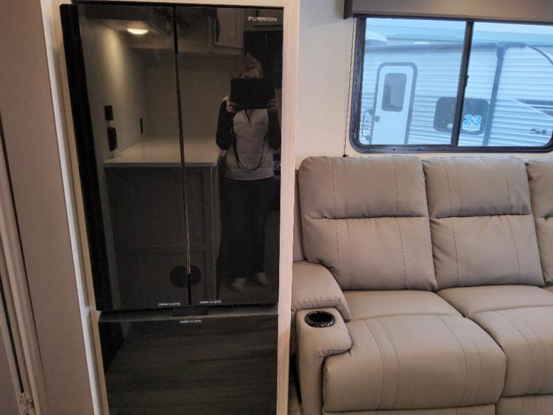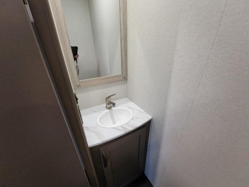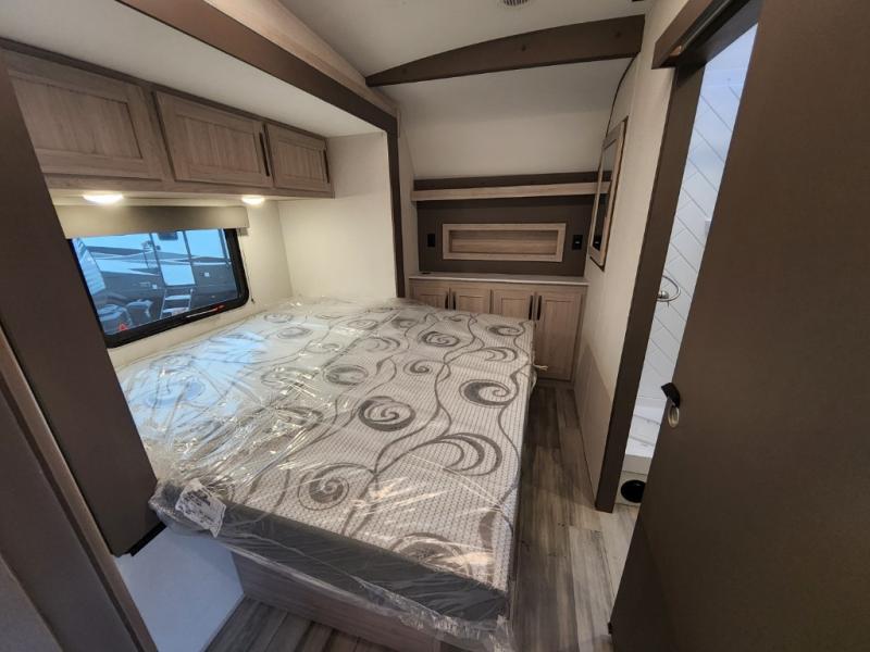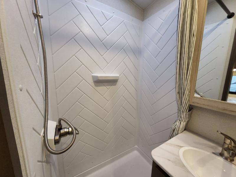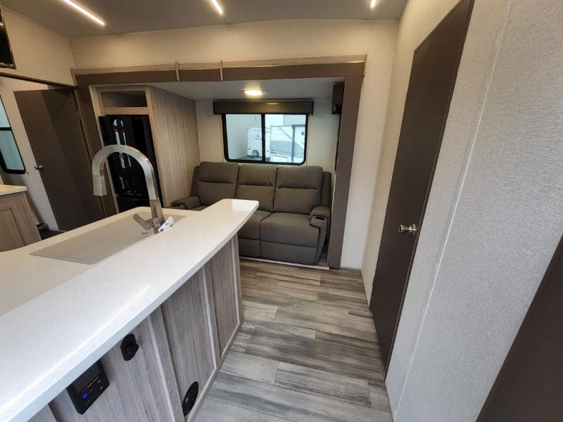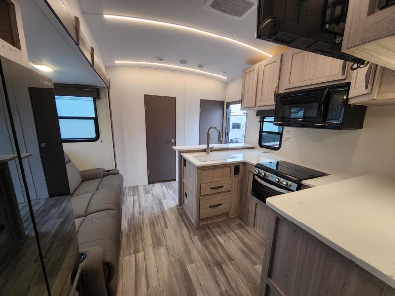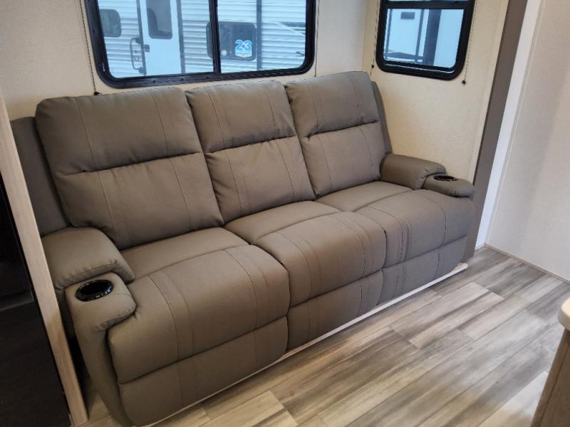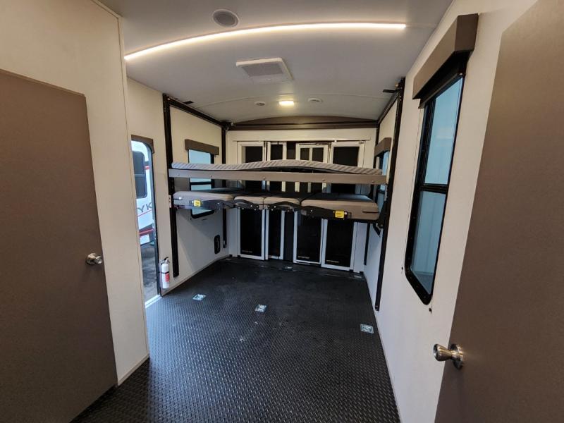 One step inside this feature packed toy hauler and you'll be hooked! The 13' 6" separate garage features 5,000 lb. tie-down rings to keep your toys secure and an 8' ramp door for easy unloading. Your guests can make this area their bedroom at night since there is a dual hinge sofa and a queen bed lift, plus their own half bath! The dual entry full bath up front will create a master bedroom you will fall in love with, especially with a king-size folding bed and a large dresser for your clothes. The interior will have you loving every minute, but don't forget about the exterior with a kitchen, a 19' power awning with LED lights, plus exterior storage for your riding gear!