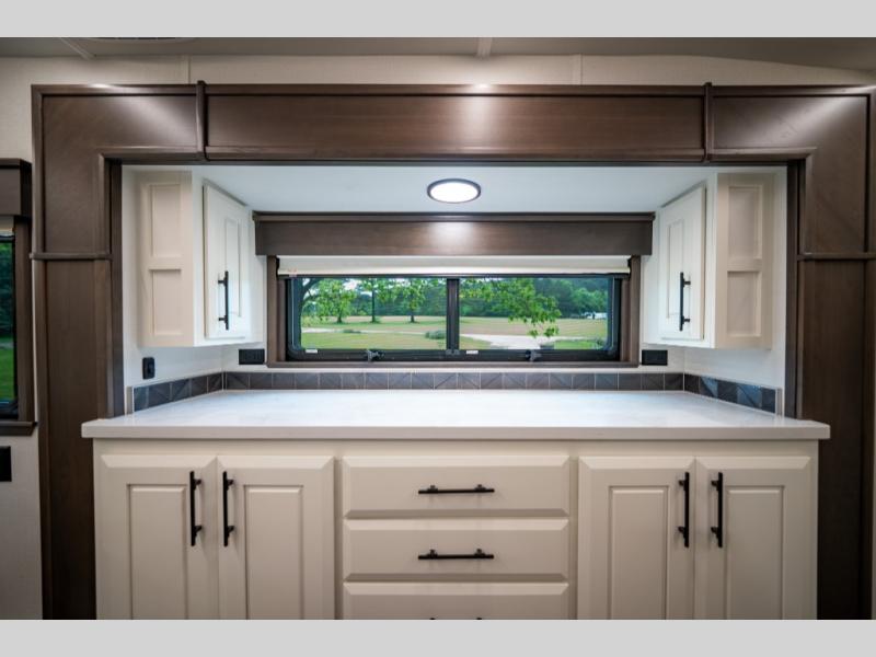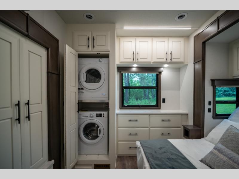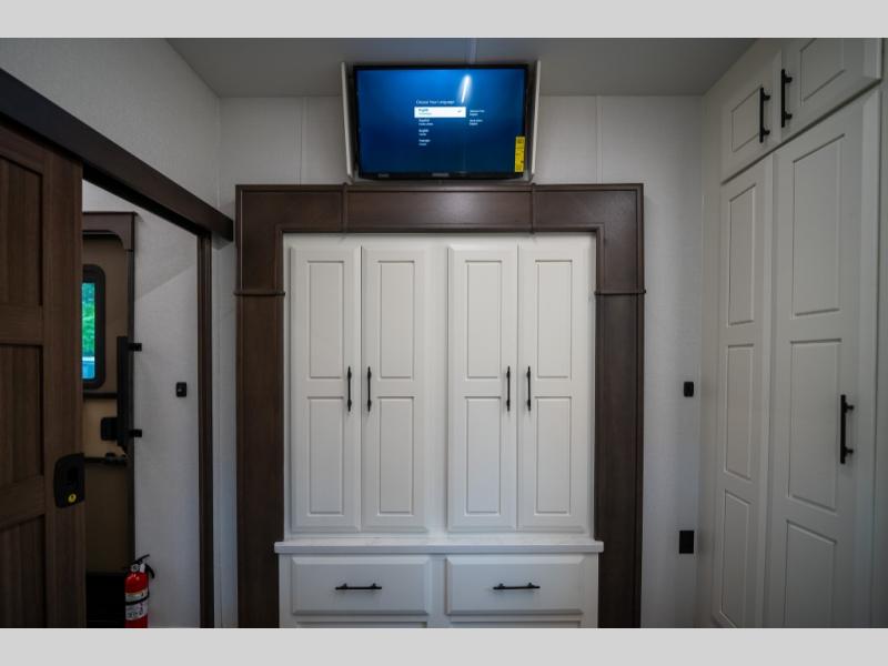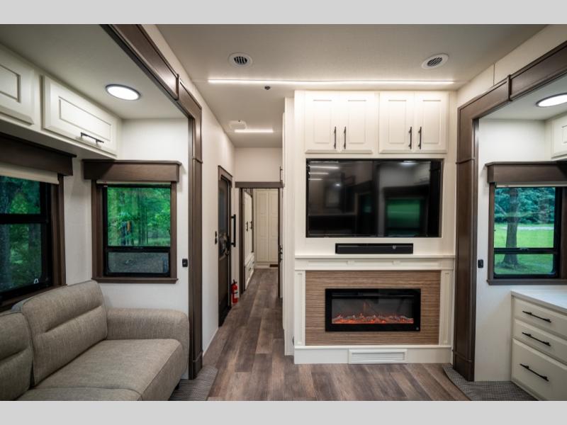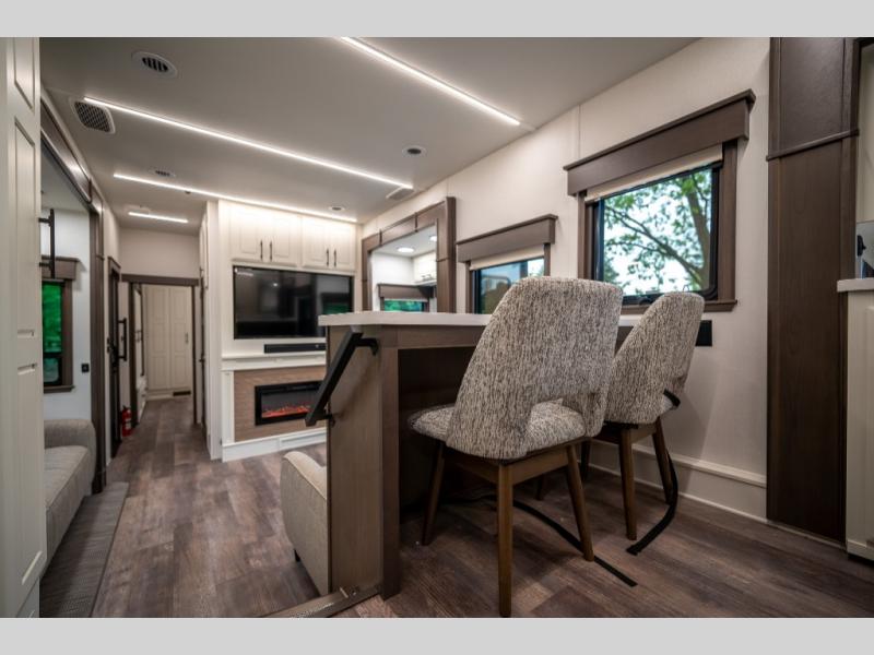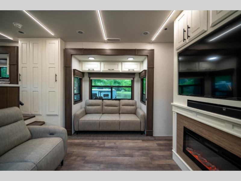 Luxury abounds in this fifth wheel made for full-time living! Step inside and you'll be wowed by the large living area with two sofas and an entertainment center. The kids or your guests can make this area their bedroom at night, while you and your spouse claim the rear private bedroom all to yourselves. Here, you'll sleep soundly on the king bed slide out, and you'll find plenty of storage space, including a dresser for your clothes. You will love waking up in the morning and heading to the gourmet kitchen up front that includes a lighted pantry, dual slides for added space, plus a counter with chairs the kids will love. This model also includes its own designated closet with washer/dryer prep. The only thing missing in this fifth wheel is you!