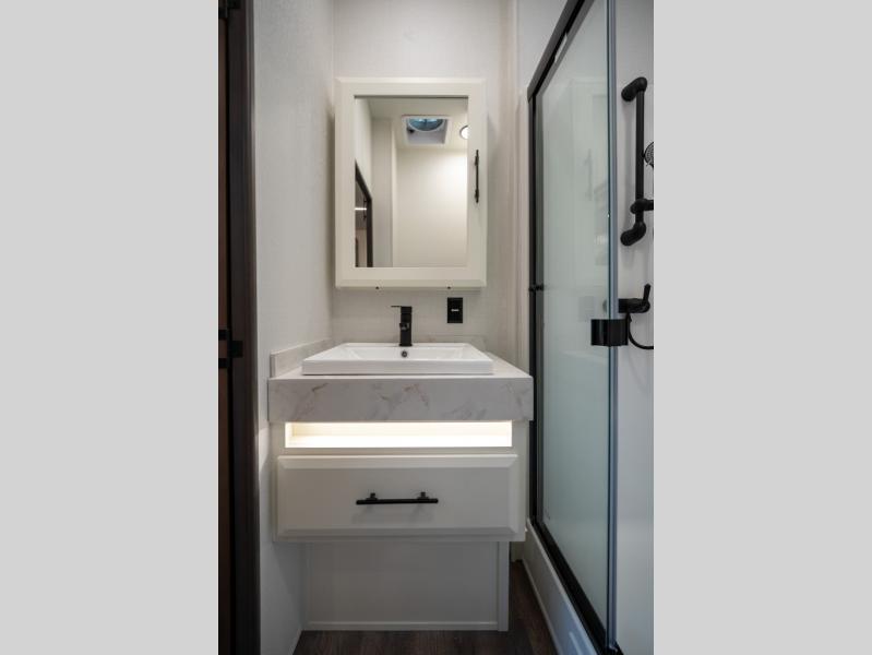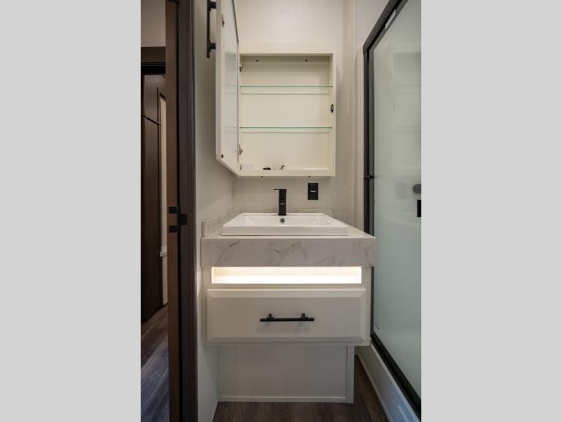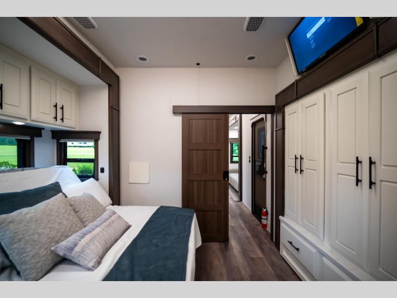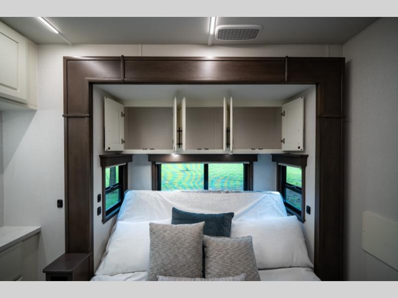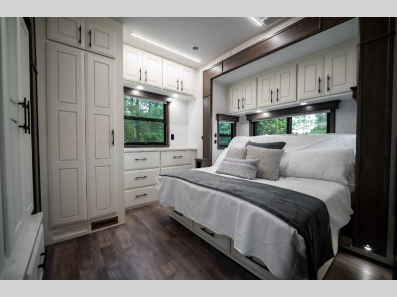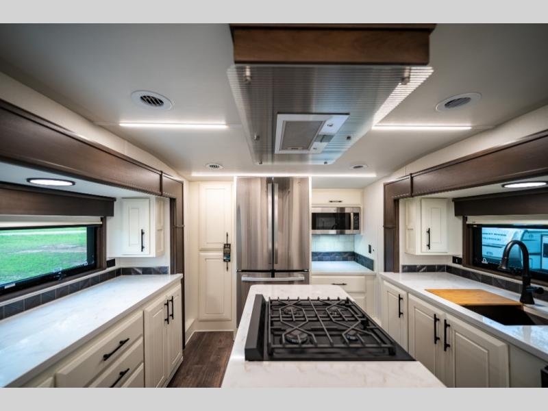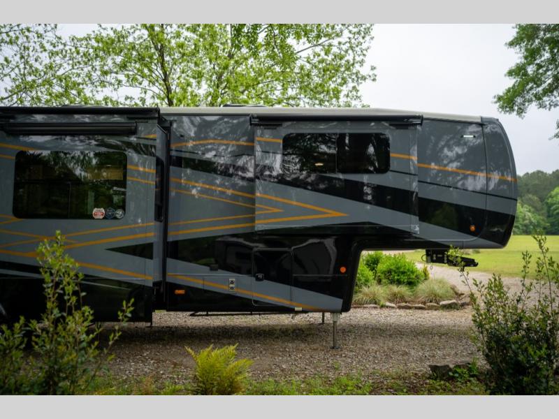 Luxury abounds in this fifth wheel made for full-time living! Step inside and you'll be wowed by the large living area with two sofas and an entertainment center. The kids or your guests can make this area their bedroom at night, while you and your spouse claim the rear private bedroom all to yourselves. Here, you'll sleep soundly on the king bed slide out, and you'll find plenty of storage space, including a dresser for your clothes. You will love waking up in the morning and heading to the gourmet kitchen up front that includes a lighted pantry, dual slides for added space, plus a counter with chairs the kids will love. This model also includes its own designated closet with washer/dryer prep. The only thing missing in this fifth wheel is you!