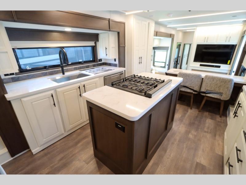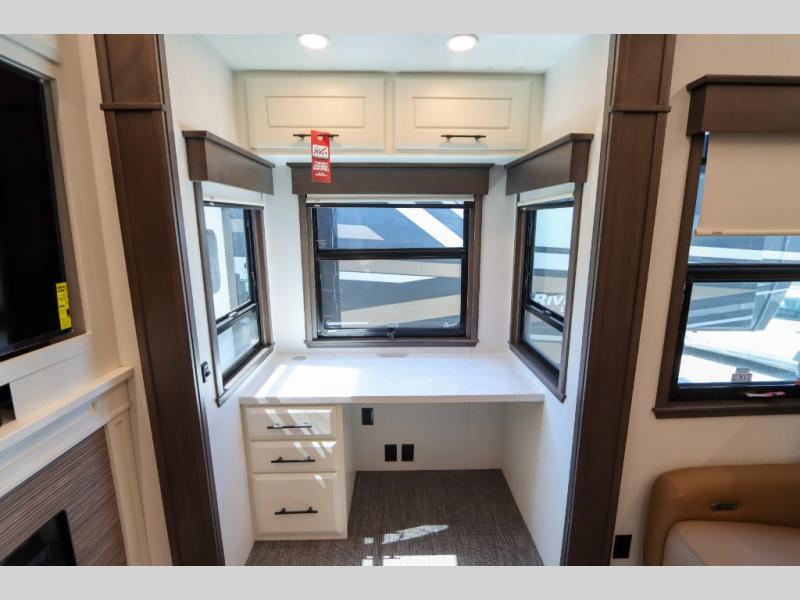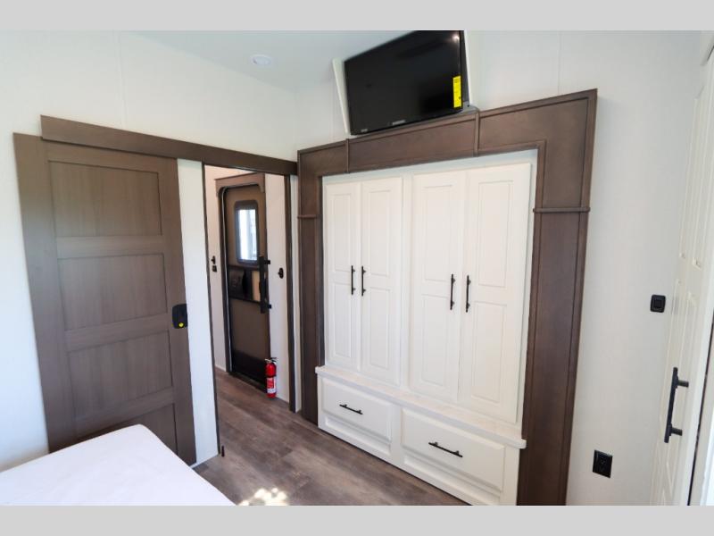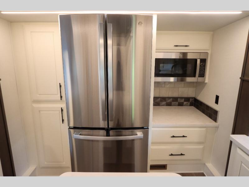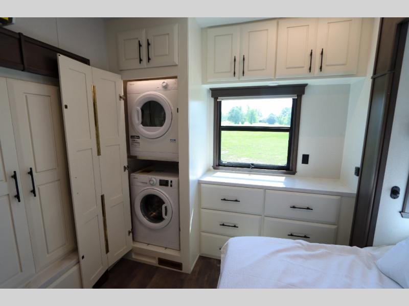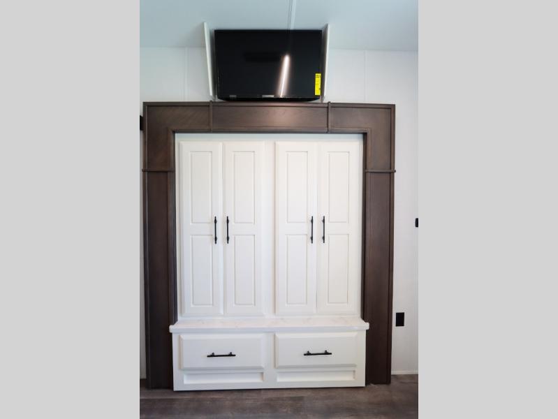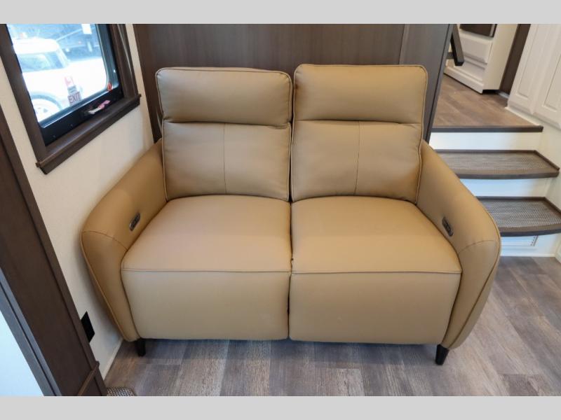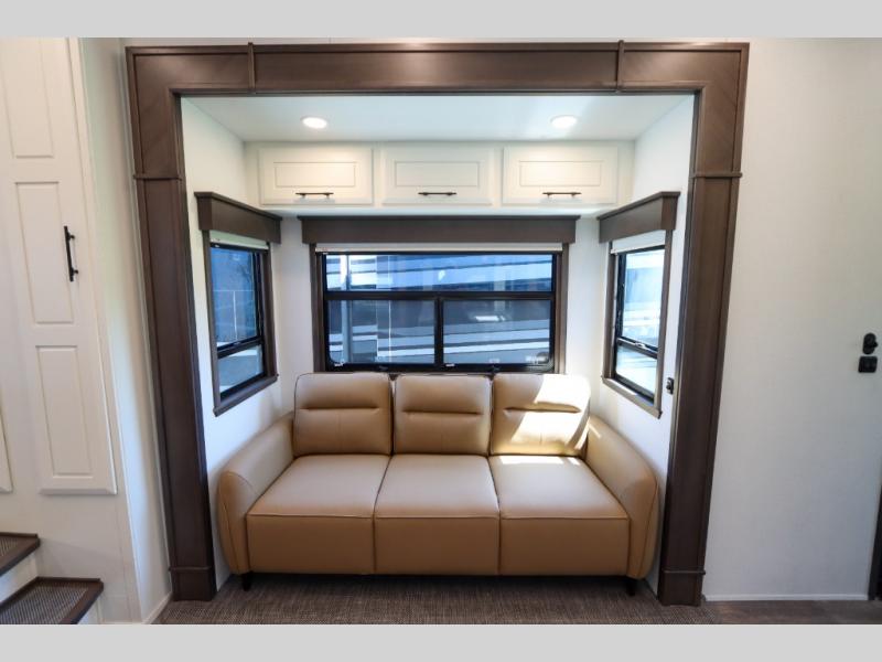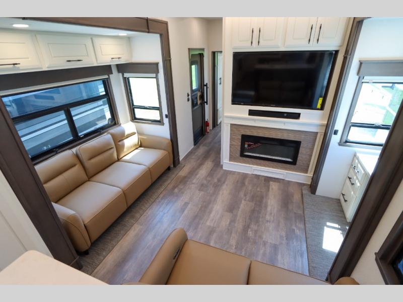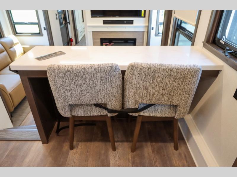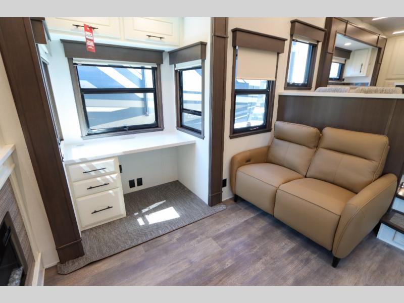 Luxury abounds in this fifth wheel made for full-time living! Step inside and you'll be wowed by the large living area with two sofas and an entertainment center. The kids or your guests can make this area their bedroom at night, while you and your spouse claim the rear private bedroom all to yourselves. Here, you'll sleep soundly on the king bed slide out, and you'll find plenty of storage space, including a dresser for your clothes. You will love waking up in the morning and heading to the gourmet kitchen up front that includes a lighted pantry, dual slides for added space, plus a counter with chairs the kids will love. This model also includes its own designated closet with washer/dryer prep. The only thing missing in this fifth wheel is you!