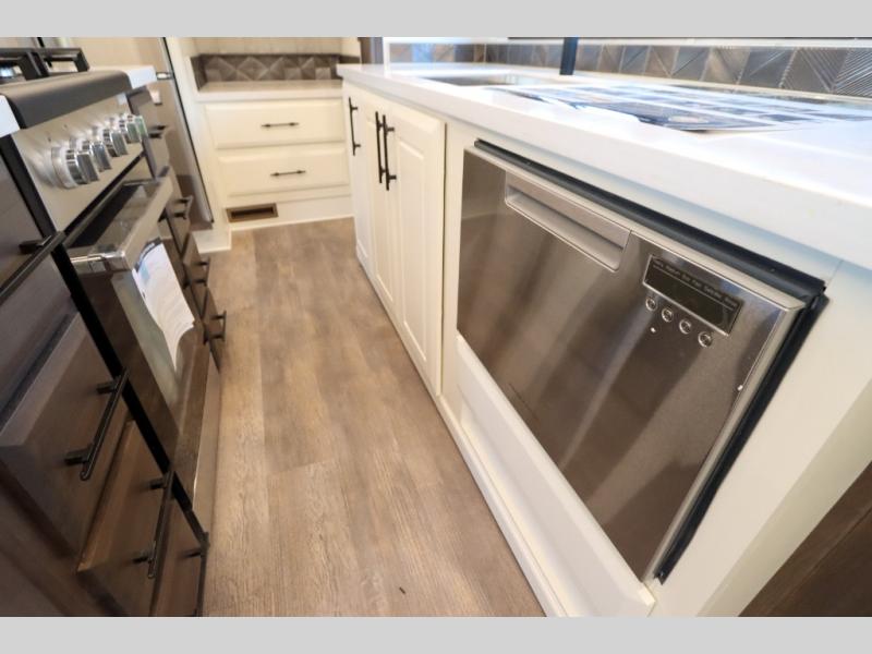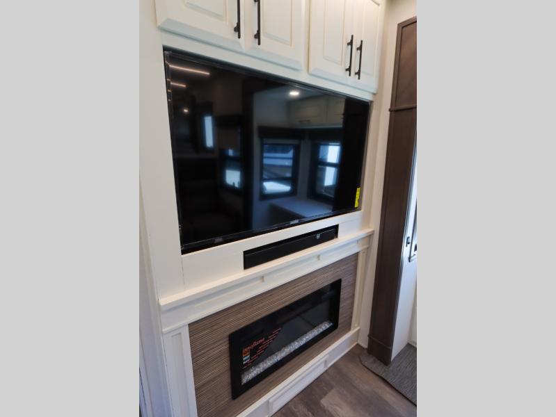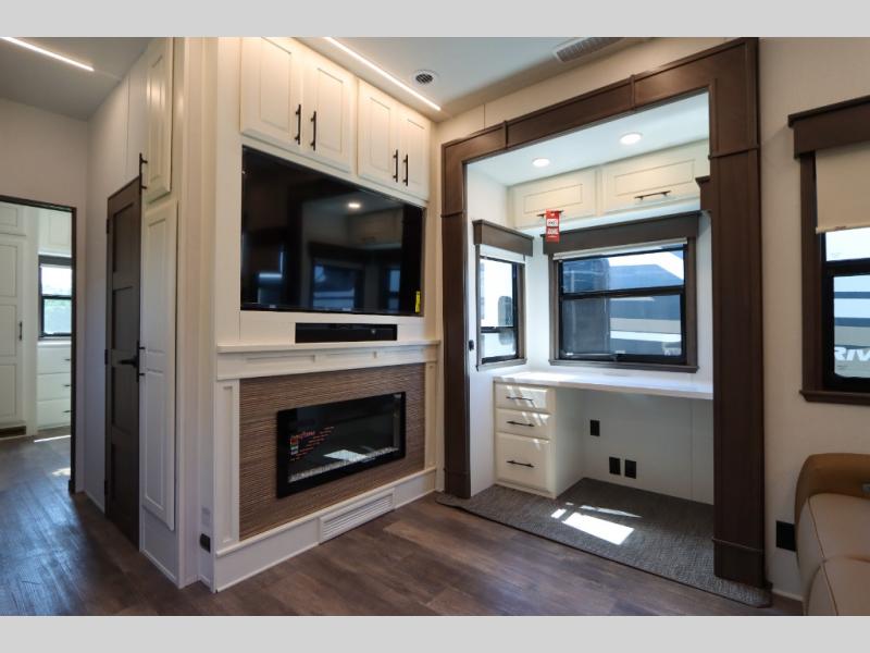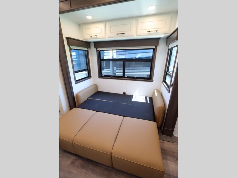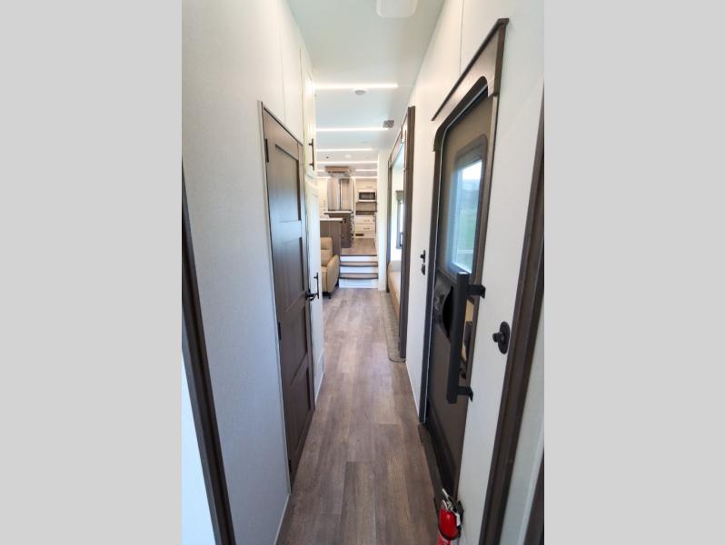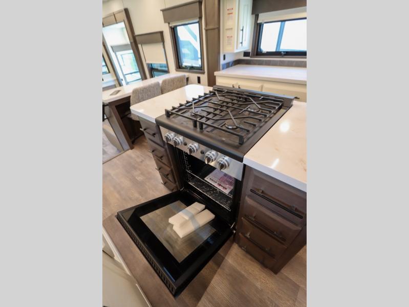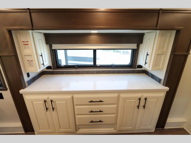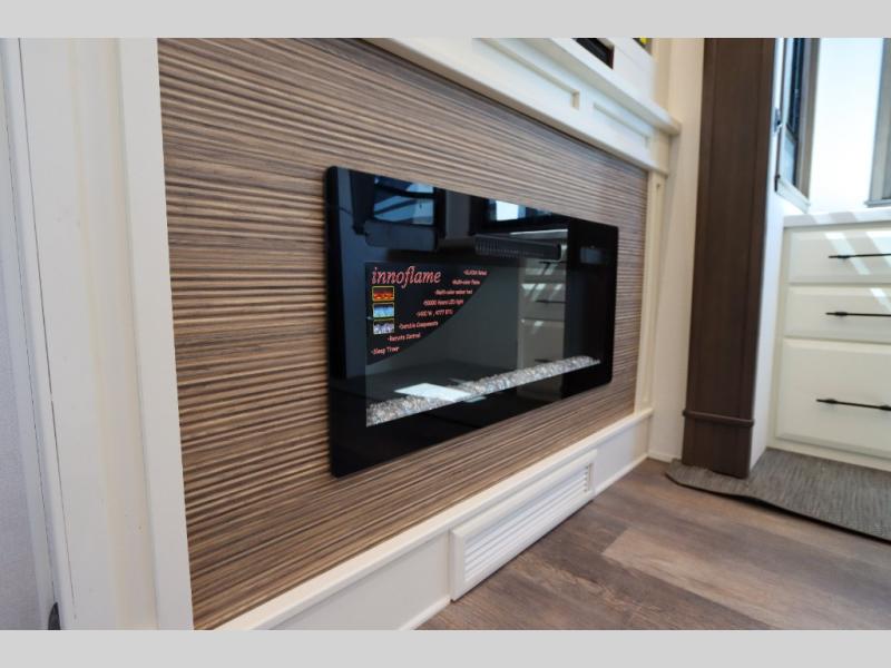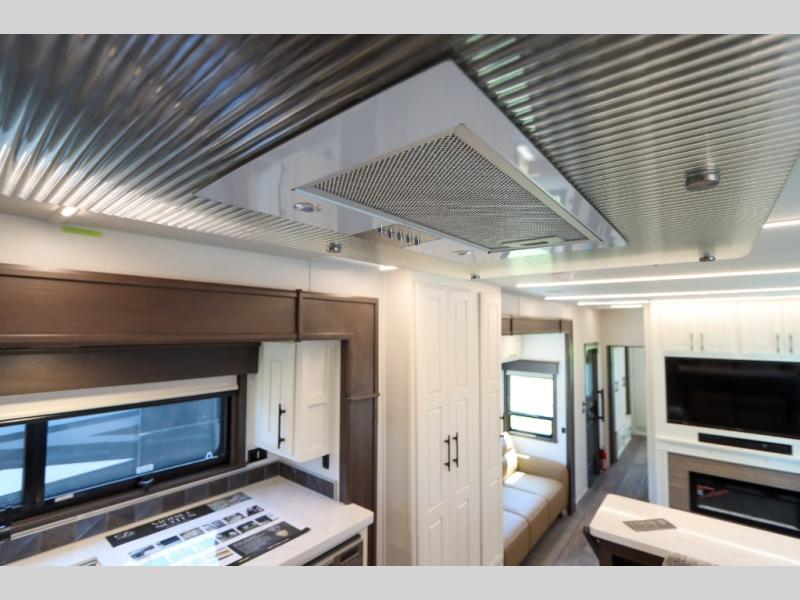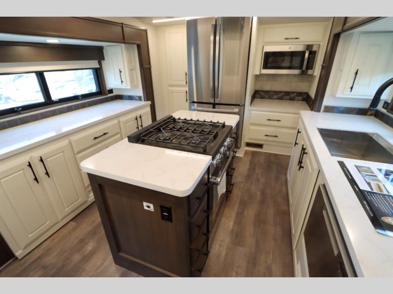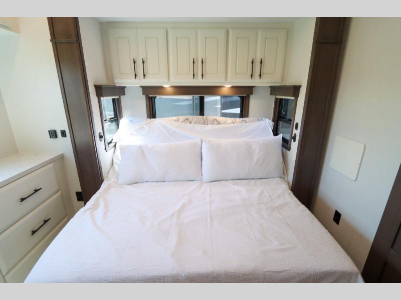 Luxury abounds in this fifth wheel made for full-time living! Step inside and you'll be wowed by the large living area with two sofas and an entertainment center. The kids or your guests can make this area their bedroom at night, while you and your spouse claim the rear private bedroom all to yourselves. Here, you'll sleep soundly on the king bed slide out, and you'll find plenty of storage space, including a dresser for your clothes. You will love waking up in the morning and heading to the gourmet kitchen up front that includes a lighted pantry, dual slides for added space, plus a counter with chairs the kids will love. This model also includes its own designated closet with washer/dryer prep. The only thing missing in this fifth wheel is you!