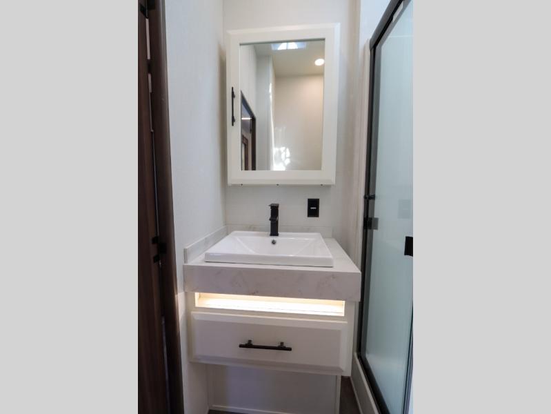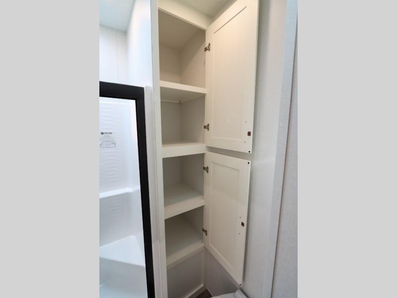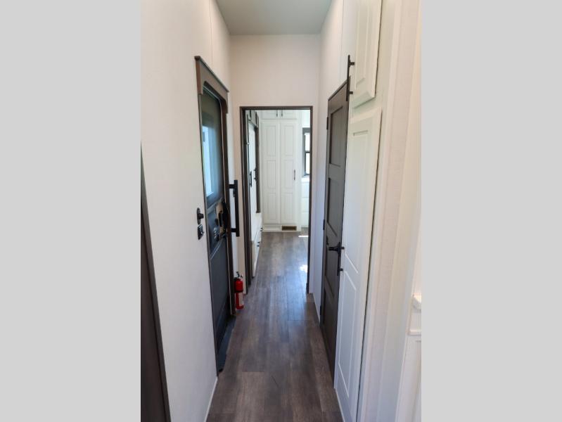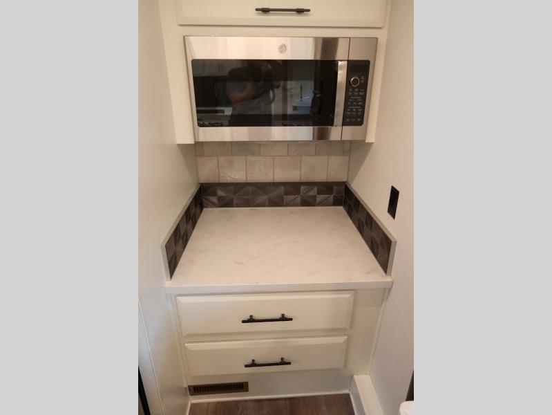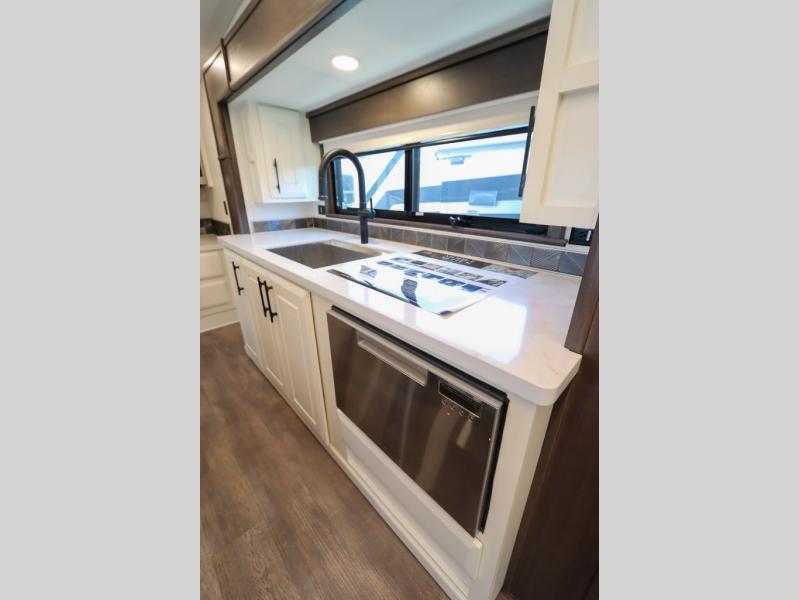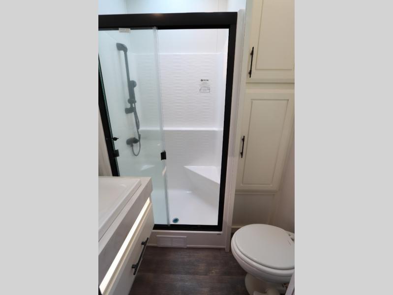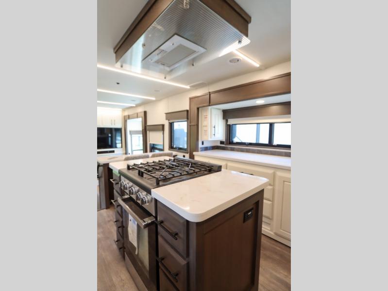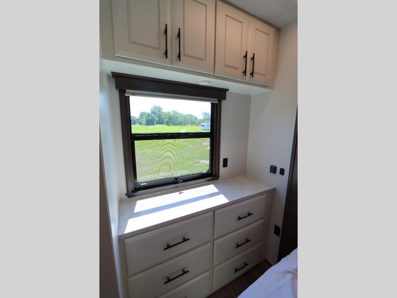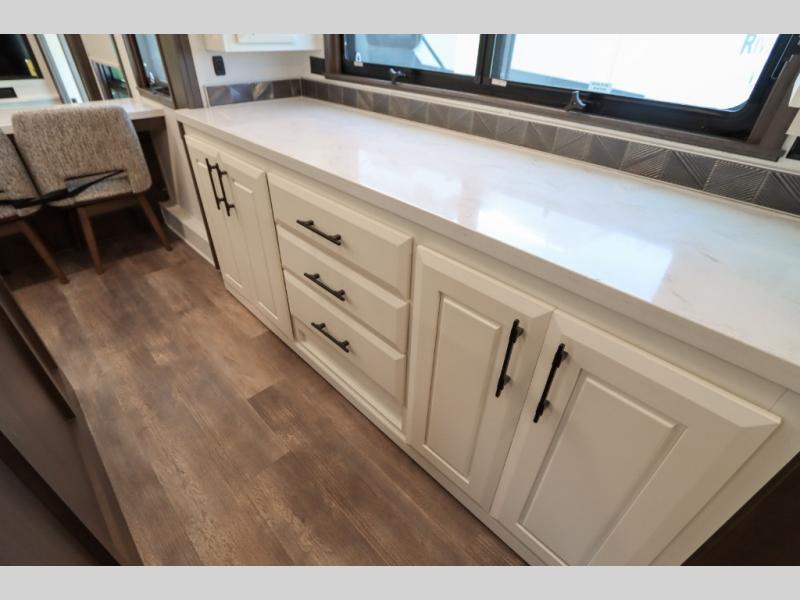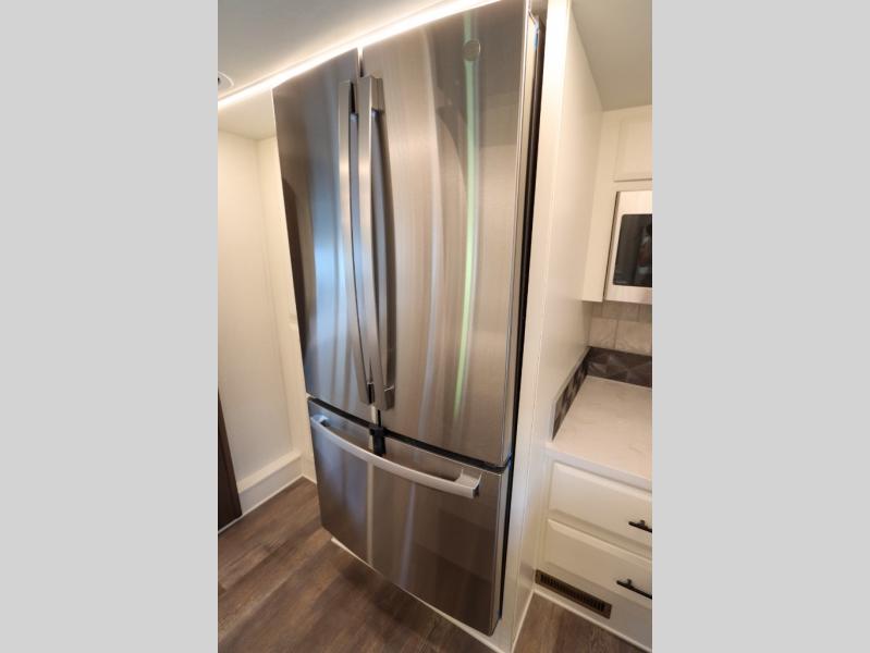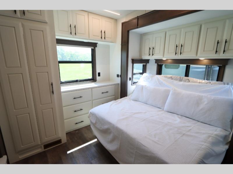 Luxury abounds in this fifth wheel made for full-time living! Step inside and you'll be wowed by the large living area with two sofas and an entertainment center. The kids or your guests can make this area their bedroom at night, while you and your spouse claim the rear private bedroom all to yourselves. Here, you'll sleep soundly on the king bed slide out, and you'll find plenty of storage space, including a dresser for your clothes. You will love waking up in the morning and heading to the gourmet kitchen up front that includes a lighted pantry, dual slides for added space, plus a counter with chairs the kids will love. This model also includes its own designated closet with washer/dryer prep. The only thing missing in this fifth wheel is you!