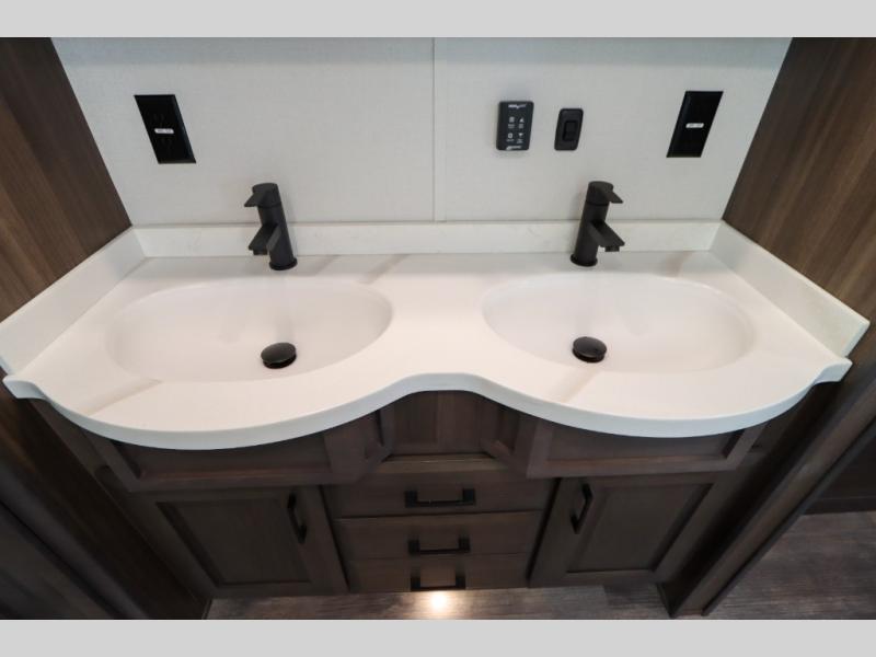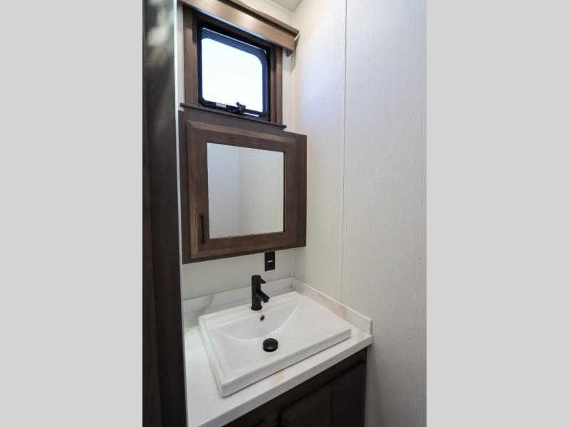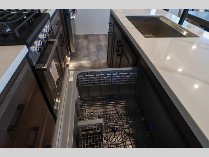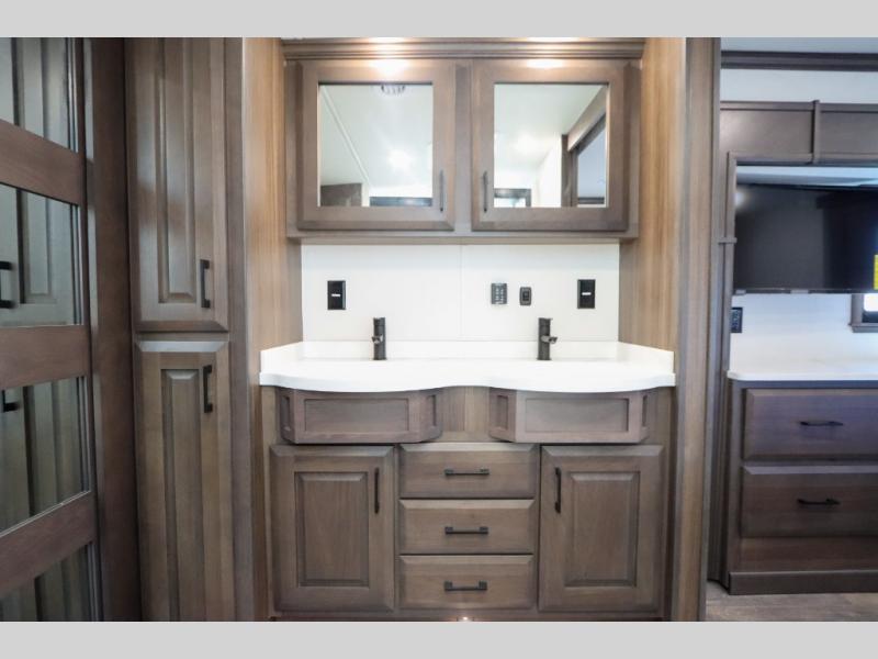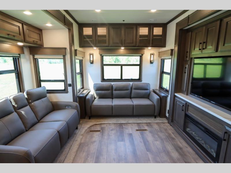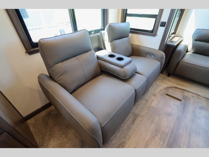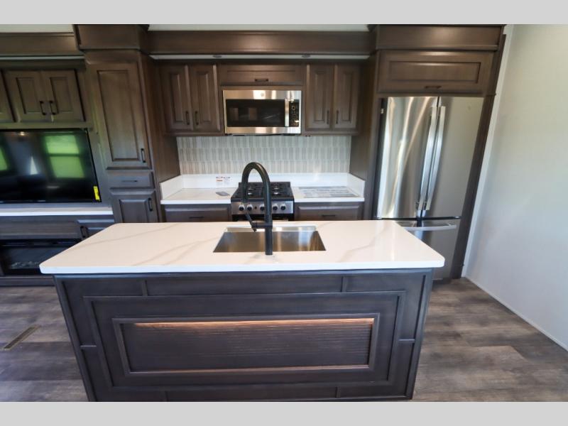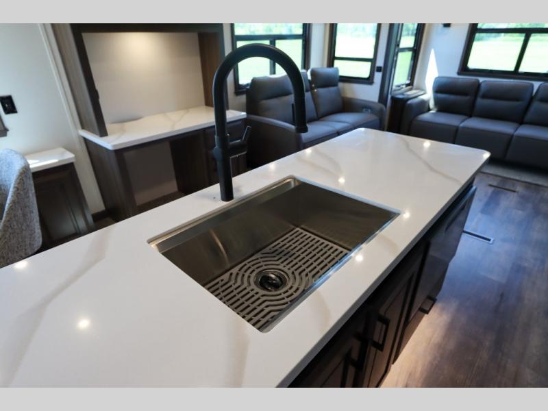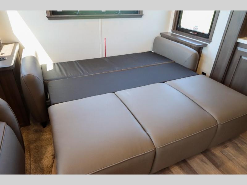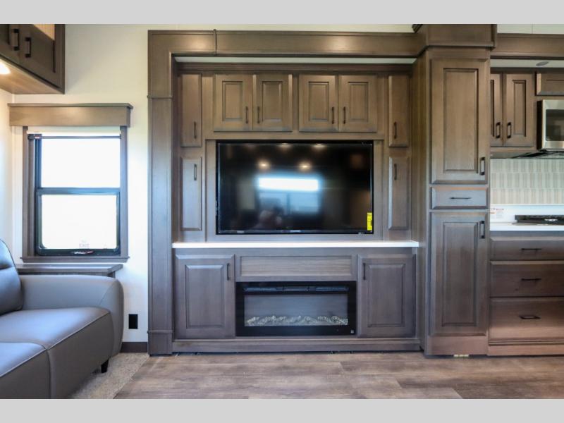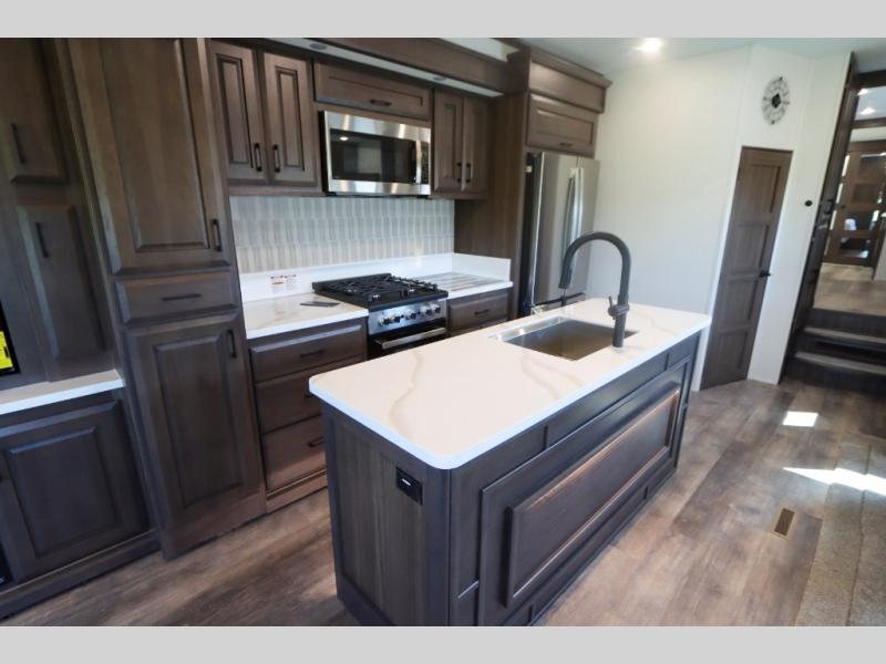 This couple's fifth wheel provides extra sleeping space on the residential sofa with a hide-a-bed in the main living and kitchen area. The entertainment center and fireplace will keep everyone entertained and cozy, and the gourmet kitchen will keep everyone fed. Your family and RV friends can use the half bath which even has washer/dryer prep if you want the option to make full-time living easier than ever, and you will have your own full bathroom up front with a large bath sink and custom closet after walking through your master bedroom.