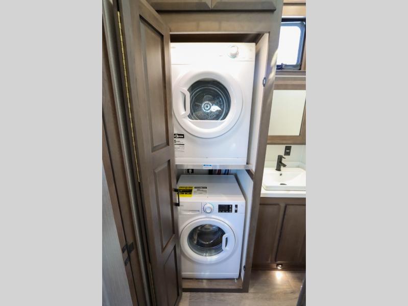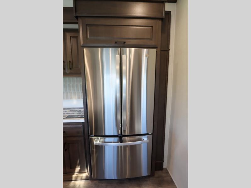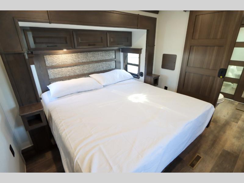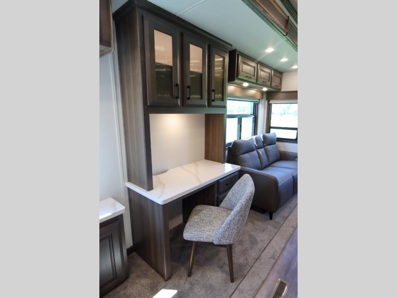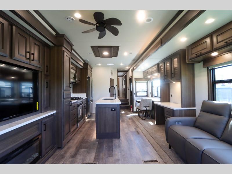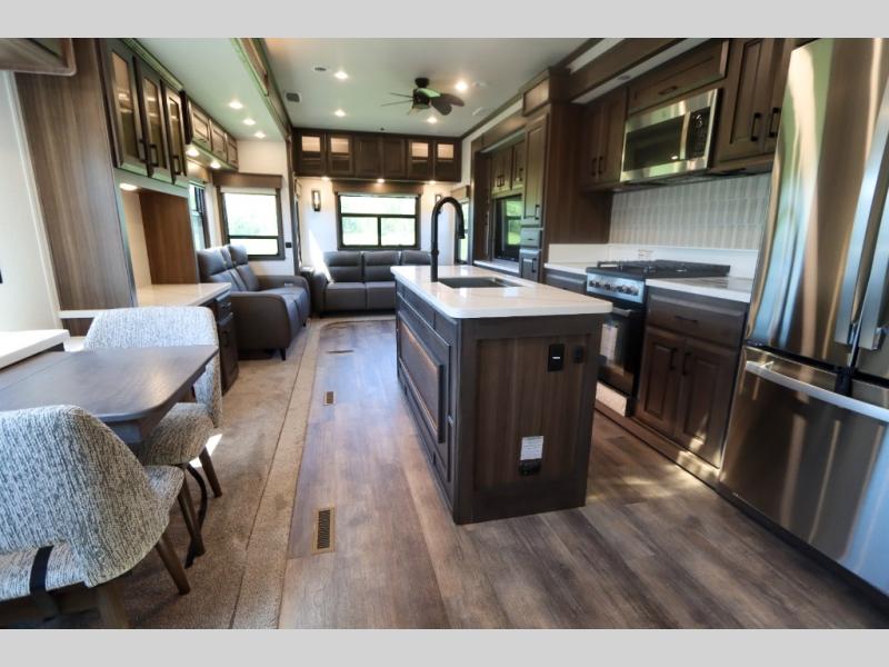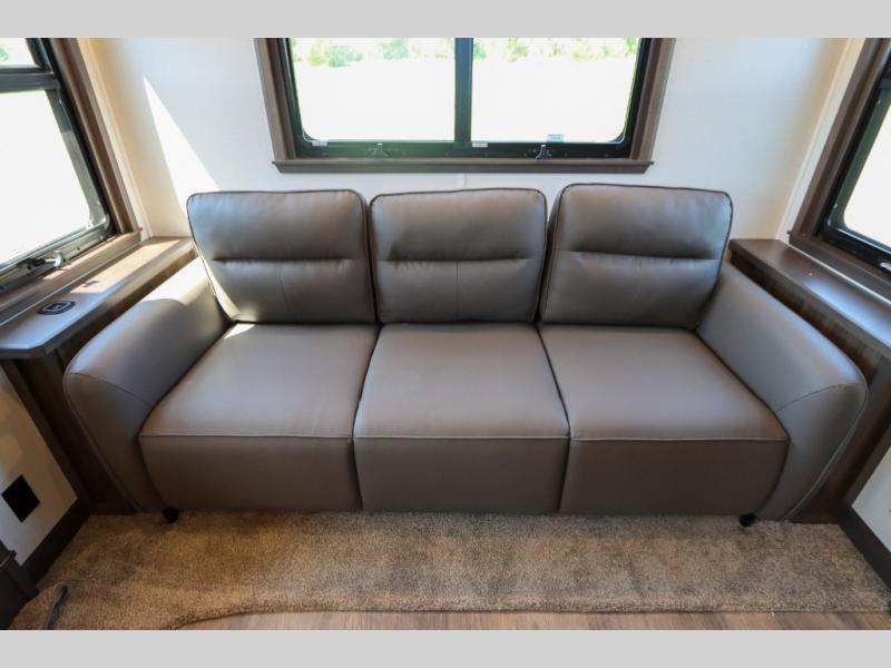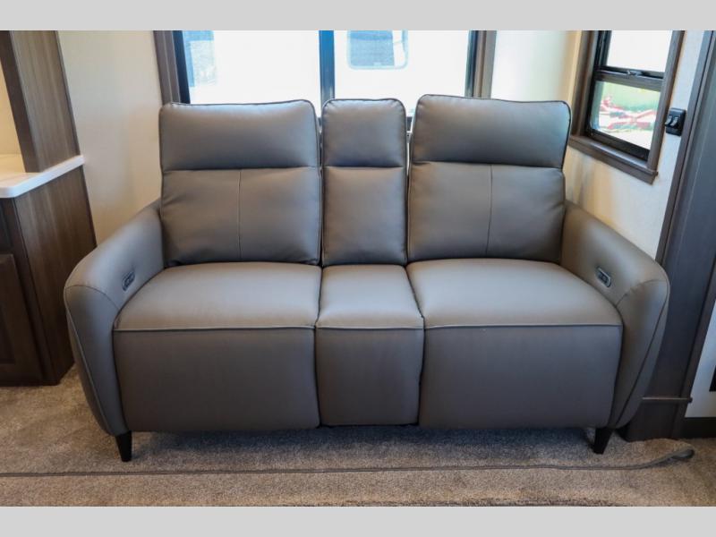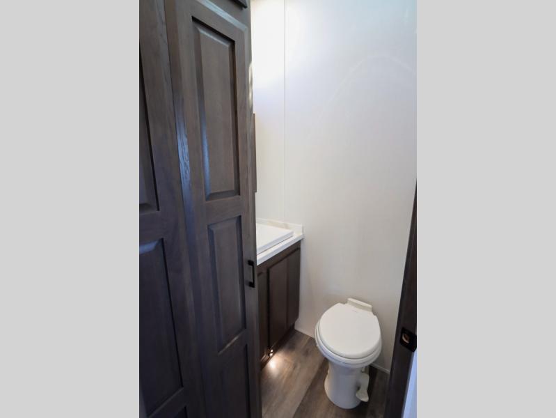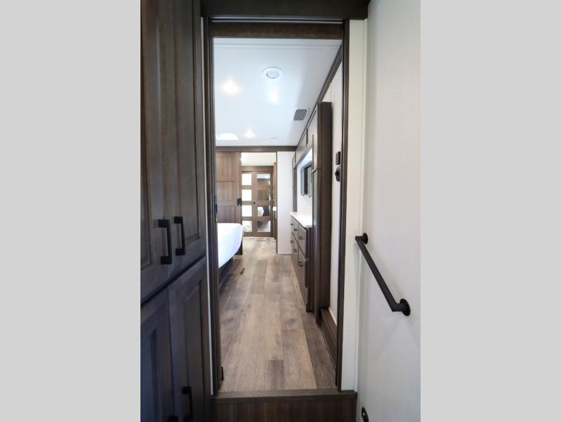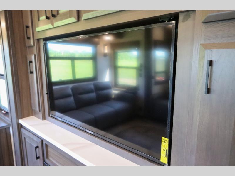 This couple's fifth wheel provides extra sleeping space on the residential sofa with a hide-a-bed in the main living and kitchen area. The entertainment center and fireplace will keep everyone entertained and cozy, and the gourmet kitchen will keep everyone fed. Your family and RV friends can use the half bath which even has washer/dryer prep if you want the option to make full-time living easier than ever, and you will have your own full bathroom up front with a large bath sink and custom closet after walking through your master bedroom.