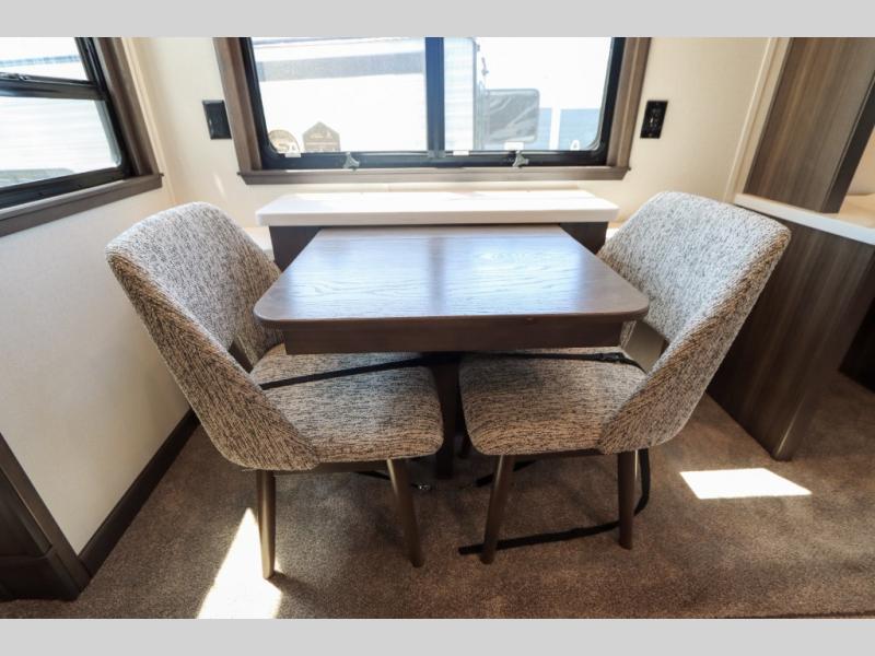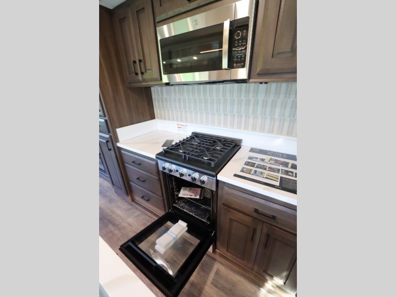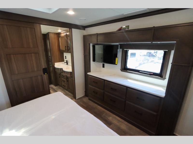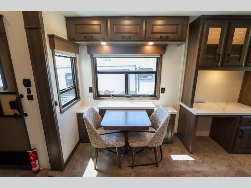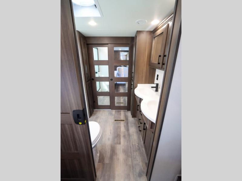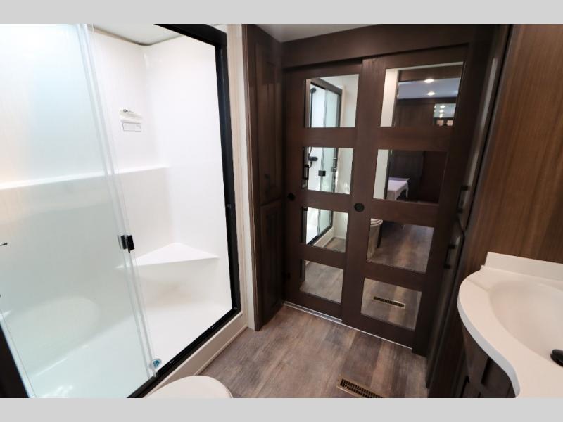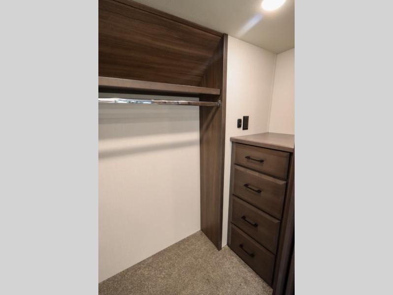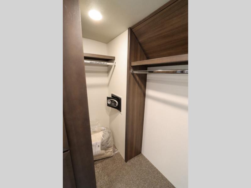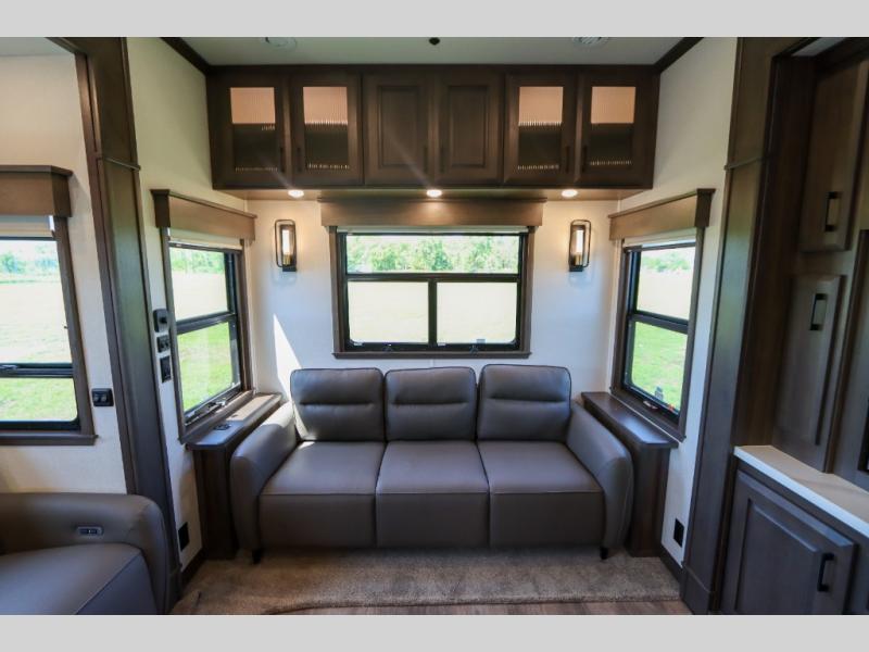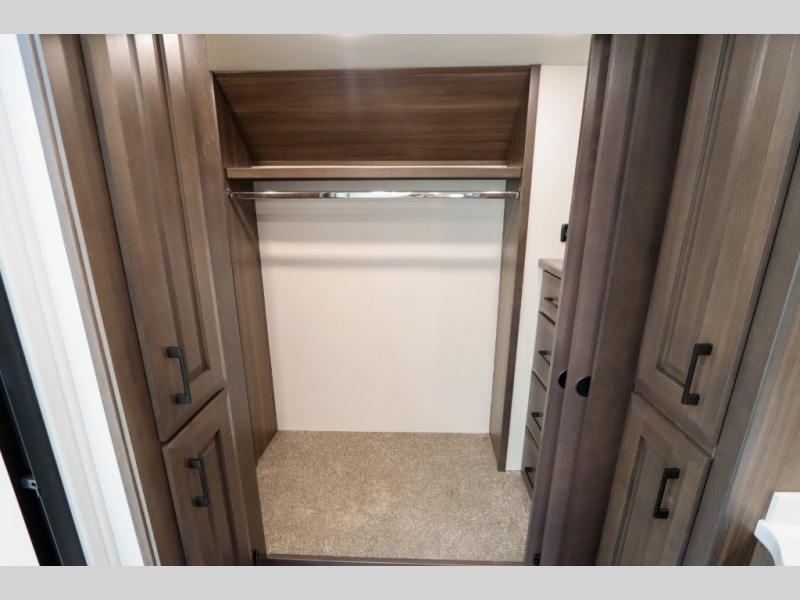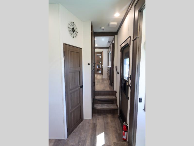 This couple's fifth wheel provides extra sleeping space on the residential sofa with a hide-a-bed in the main living and kitchen area. The entertainment center and fireplace will keep everyone entertained and cozy, and the gourmet kitchen will keep everyone fed. Your family and RV friends can use the half bath which even has washer/dryer prep if you want the option to make full-time living easier than ever, and you will have your own full bathroom up front with a large bath sink and custom closet after walking through your master bedroom.