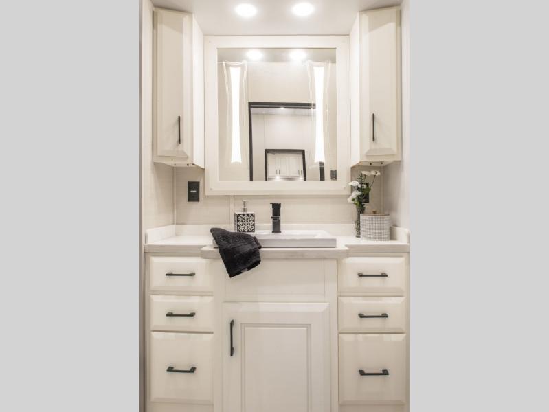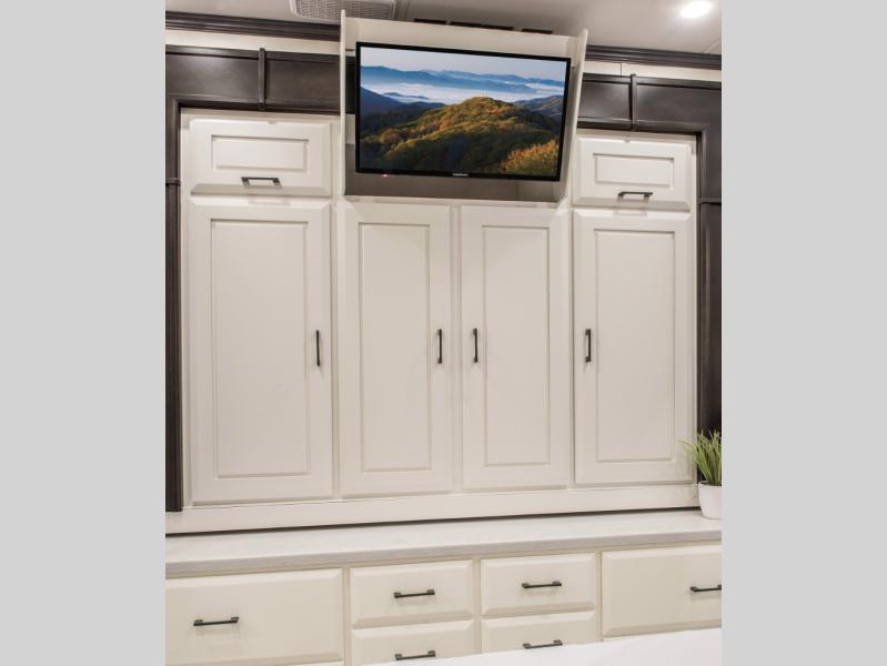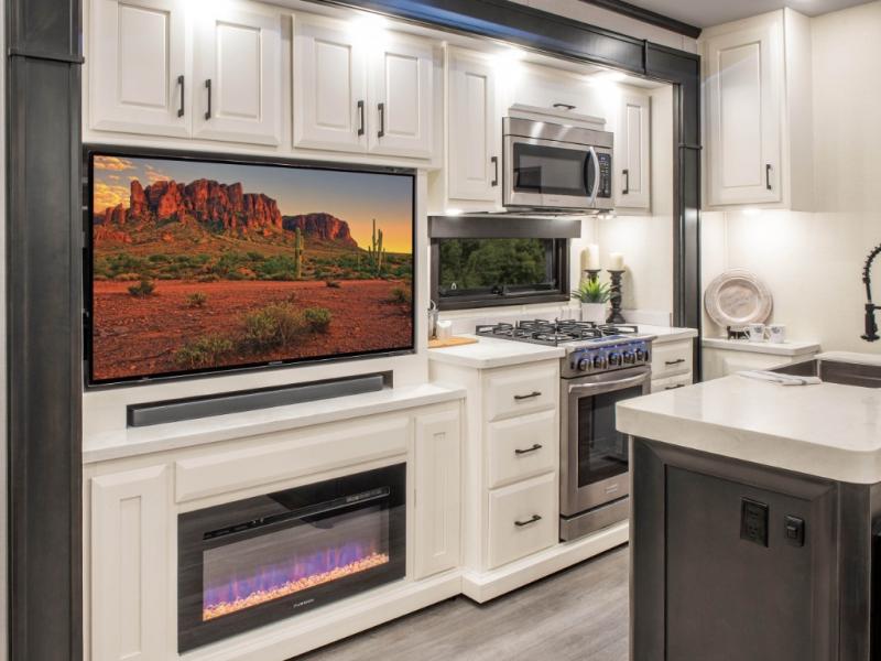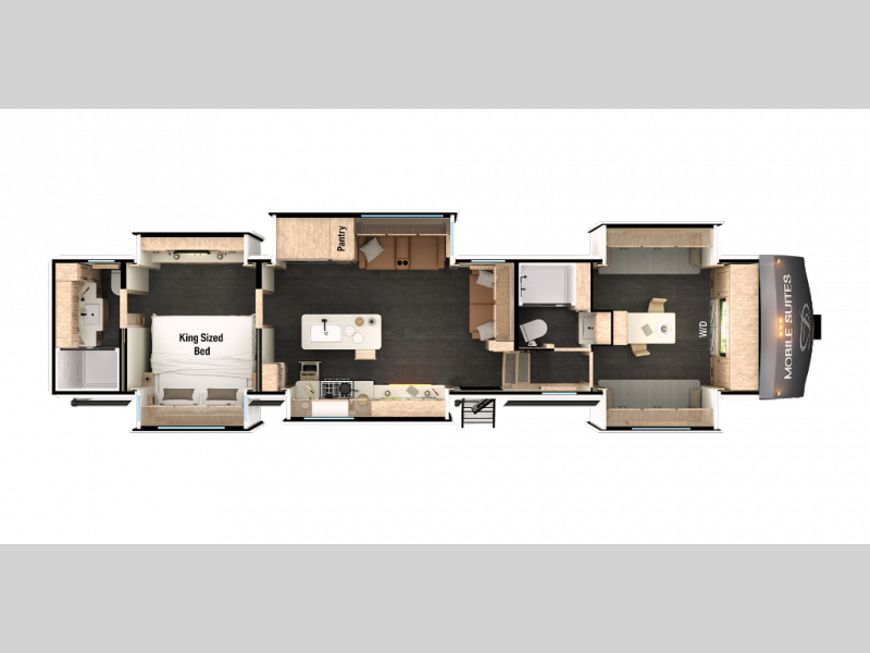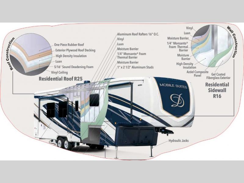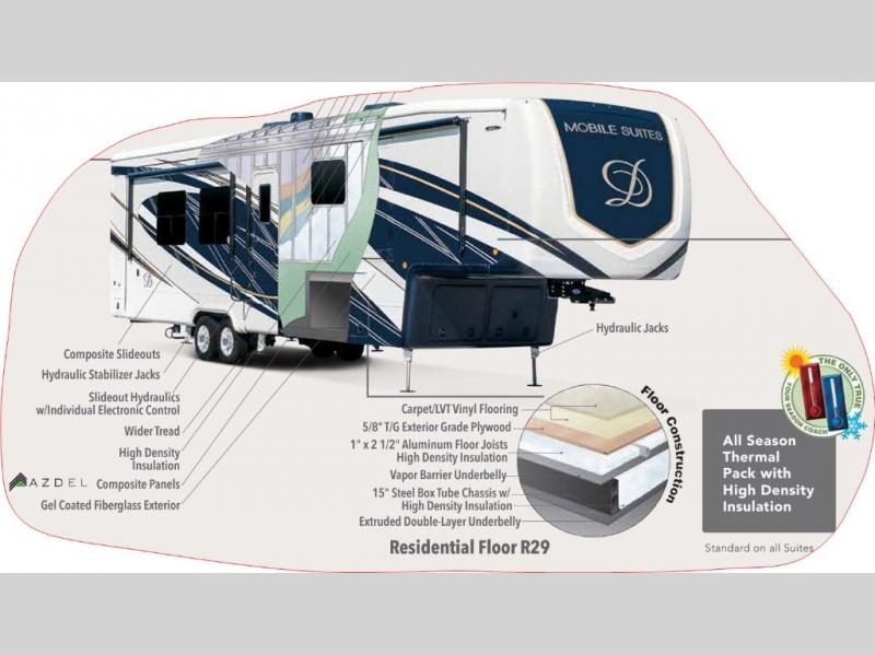 With any Mobile Suites fifth wheel by DRV Luxury Suites you will enjoy durable construction, beautiful interiors, and tons of storage spaces. Each model includes hassle-free conveniences, like the SeeLevel tank monitoring, the fully ducted A/C system with cold air return, solar prep, and much more! The interior is packed with luxury features, such as custom hardwood wardrobe doors, LED ceiling lights with dimmer switches, crown molding throughout, and custom hand laid backsplash. You may spend all your time relaxing indoors, but don't forget to check out the exterior. A power awning with LED lights, extra thick compartment doors with gas struts, and a custom painted exterior with clear coat are just a few features that are sure to be a deal breaker! You might even want to choose between the two optional full-body paint choices within the Elite Package, and many more available options to further customize your fifth wheel!