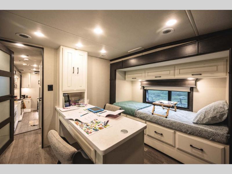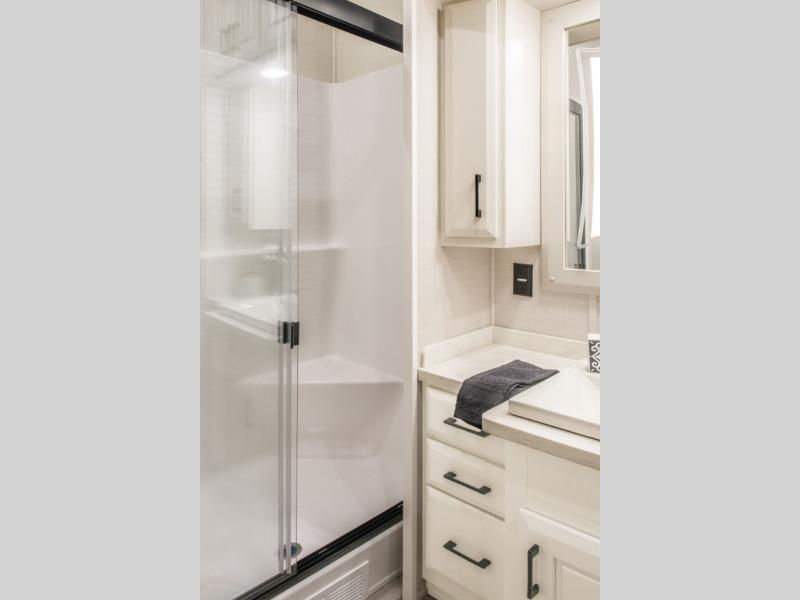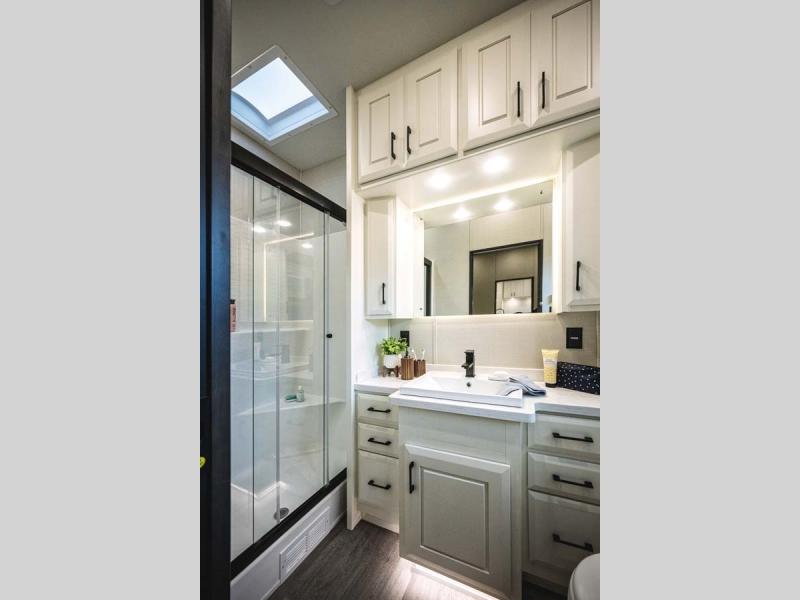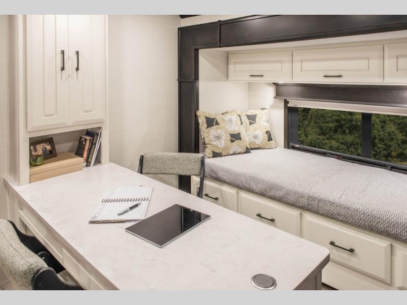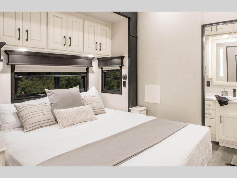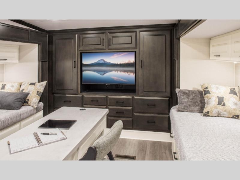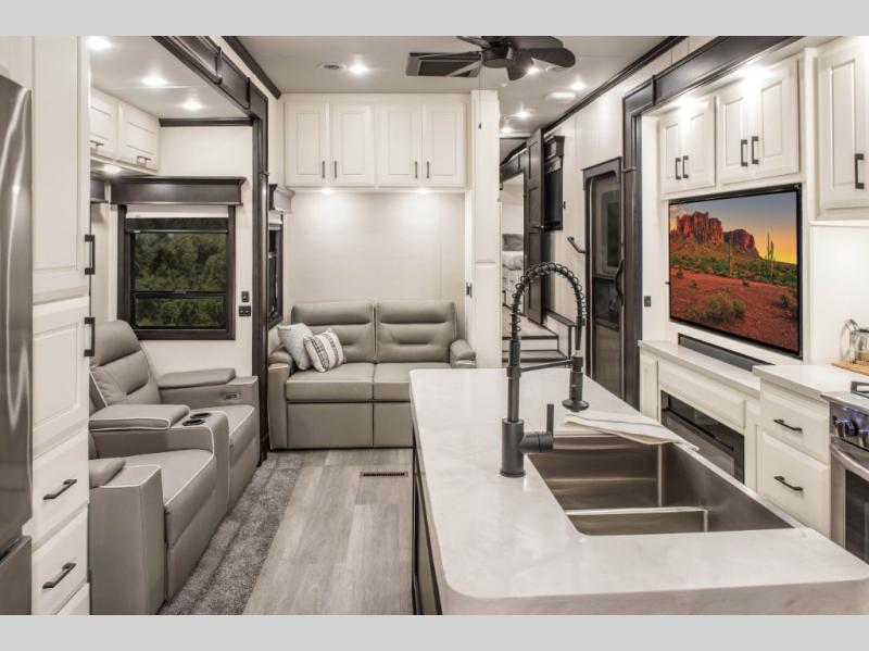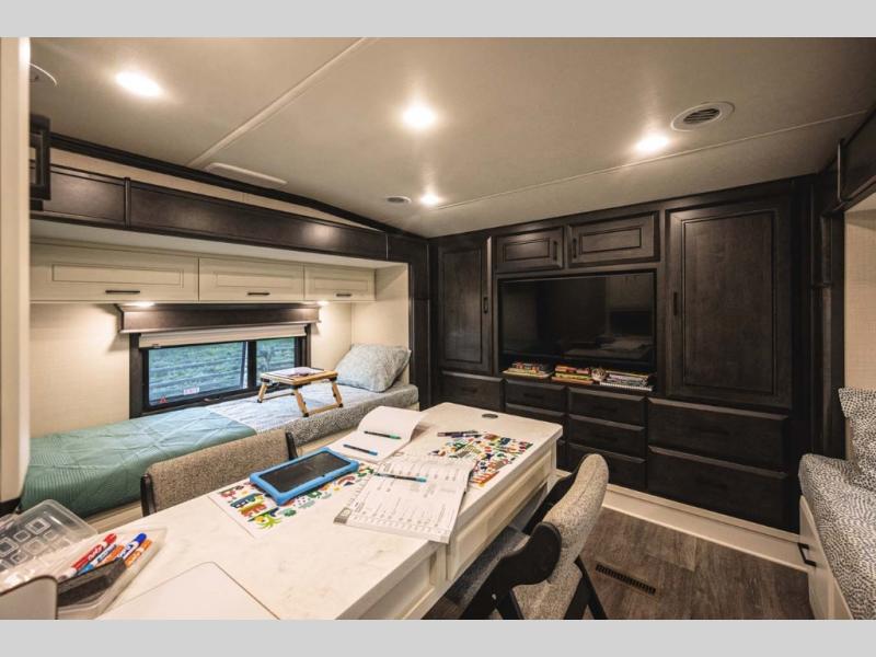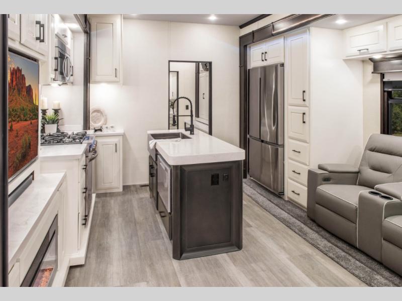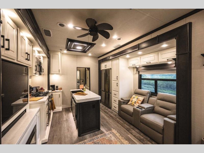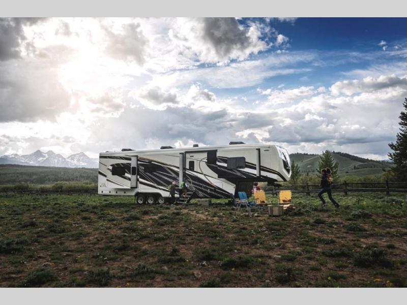 You'll be blown away by the amount of space you have in this fifth wheel thanks to the six slide outs! Enjoying time with loved ones in the main living area will feel just like home on the residential theater seating and residential hide-a-bed sofa, plus there is a fireplace to add to the coziness. The chef of your group will love the gourmet kitchen with a kitchen island, stainless steel appliances, plus a residential stainless steel French door refrigerator. A master suite will be waiting for you at the end of the day, and your guests will enjoy front private bedroom/den with a desk with two chairs and two slide out beds. This unit also includes two full baths for added convenience!