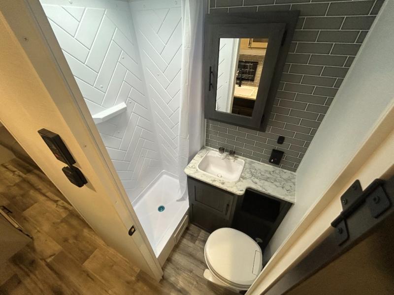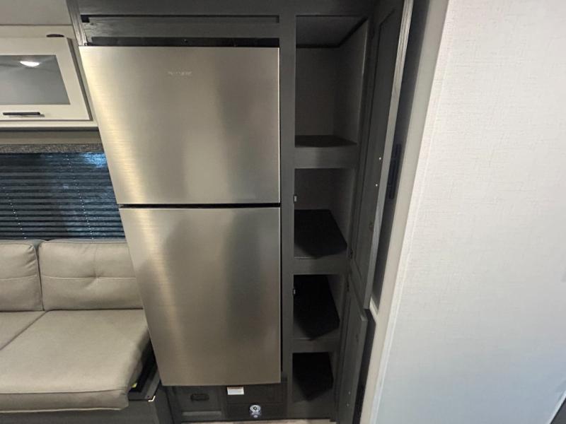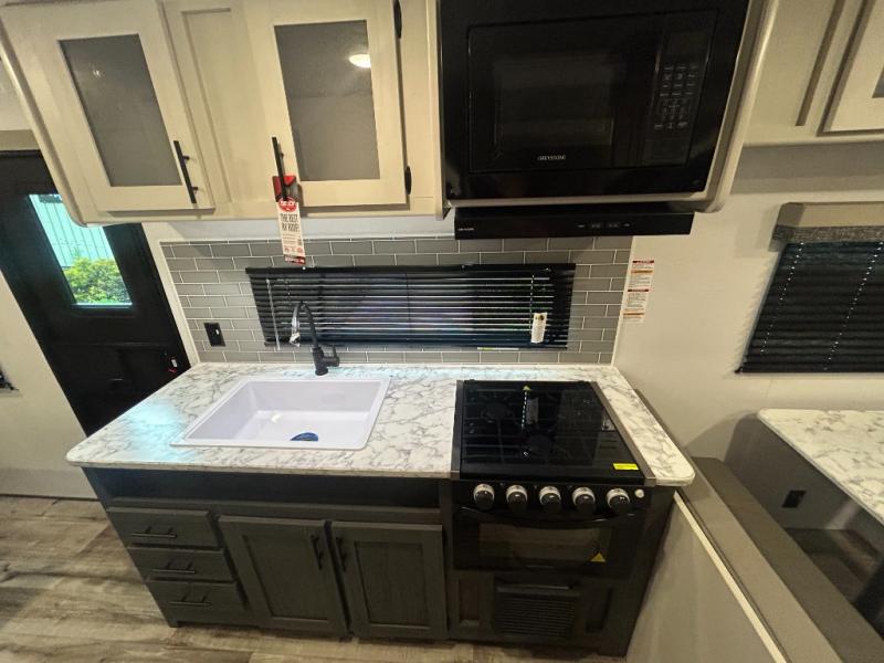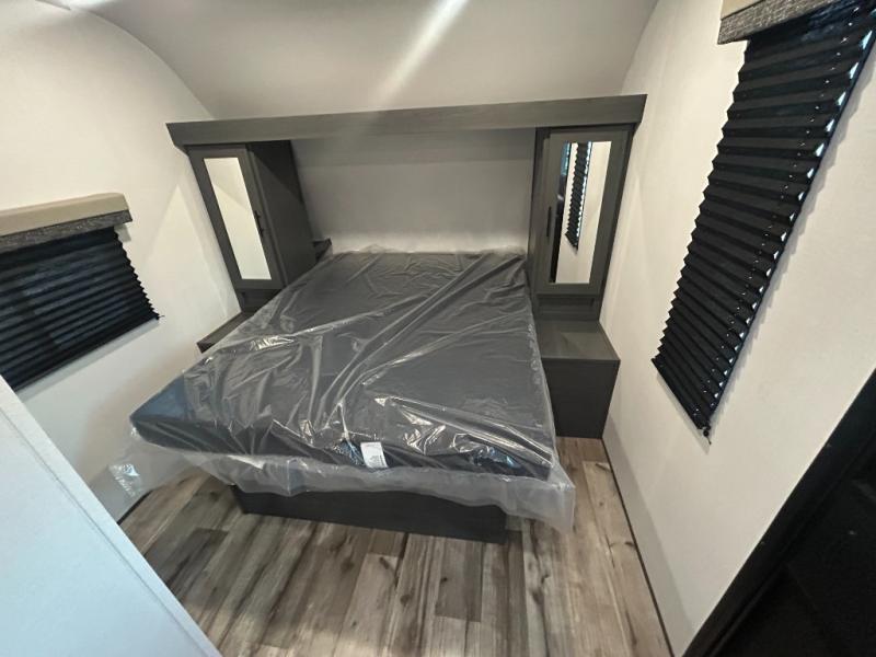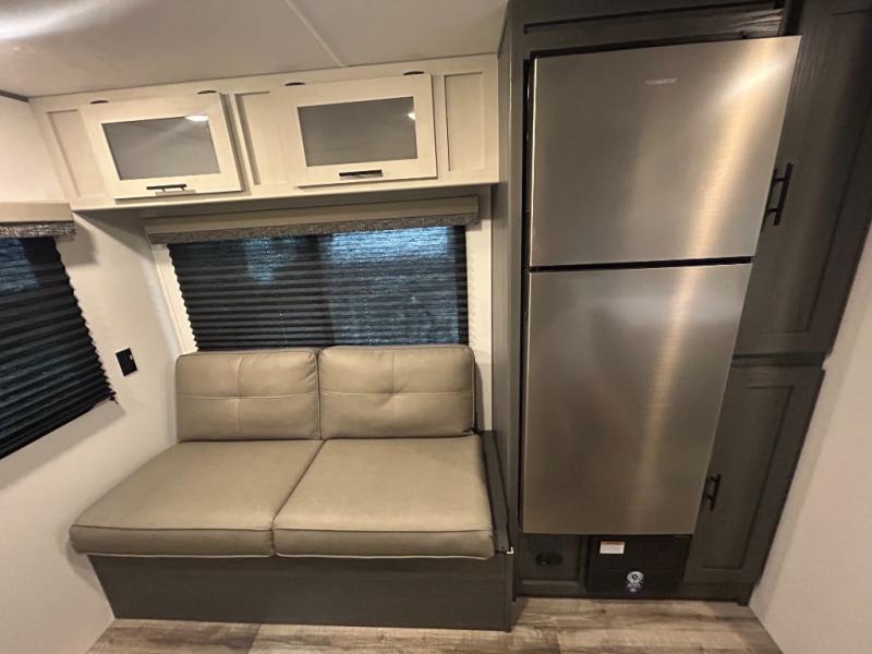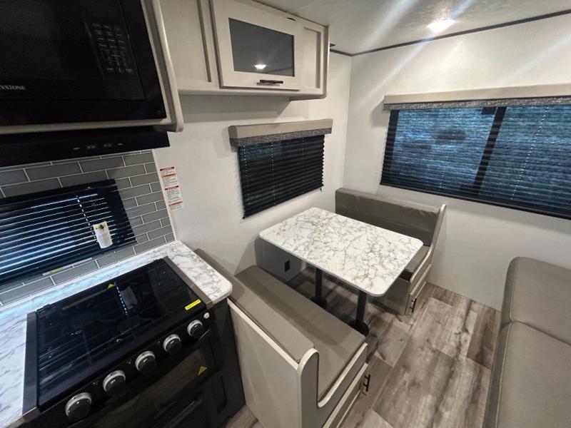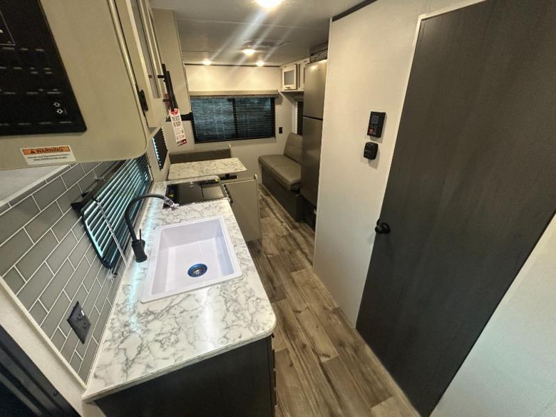 Whatever reason you camp, this lightweight trailer allows you to easily tow to your campsite, and enjoy comforts of home such as your own residential queen bed, wardrobe storage, a full bathroom with a shower, and furniture to relax and dine at. The sofa and booth dinette are across from each other, allowing you to visit with other RVers or your family. The cook will have an oven and a microwave to make meals, and a 10 cu. ft. 12V refrigerator for cold items, plus a galley sink with high rise faucet to keep the dishes clean.