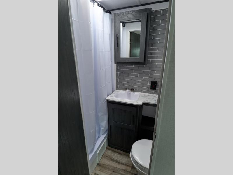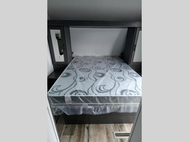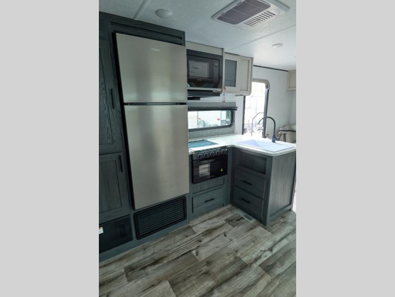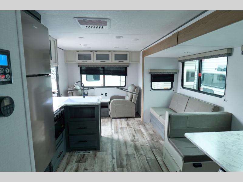 With dual entry doors, you can easily enter and exit this travel trailer! The jackknife sofa with footrest and booth dinette are next to each other near the fireplace, as well as two rear recliners allowing you to visit with other RVers or your family. The cook will have an oven and a microwave to make meals, and a 10 cu. ft. 12V refrigerator for cold items, plus a galley sink with high rise faucet to keep the dishes clean. Speaking of being clean, the full bathroom offers a shower with exhaust fan to eliminate unwanted steam as you clean yourself up after a fun day at the beach. The front private bedroom has a residential queen bed and one of the entrance/exit doors so you can slip out for an early morning fishing trip!