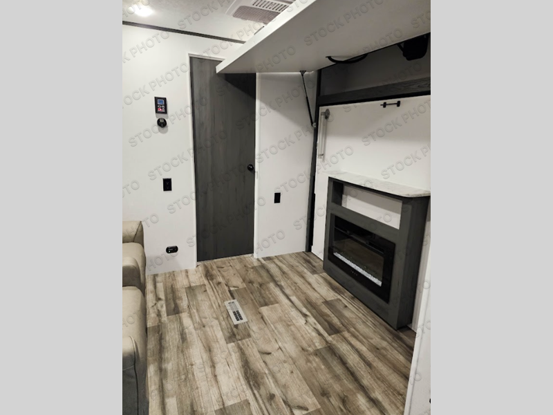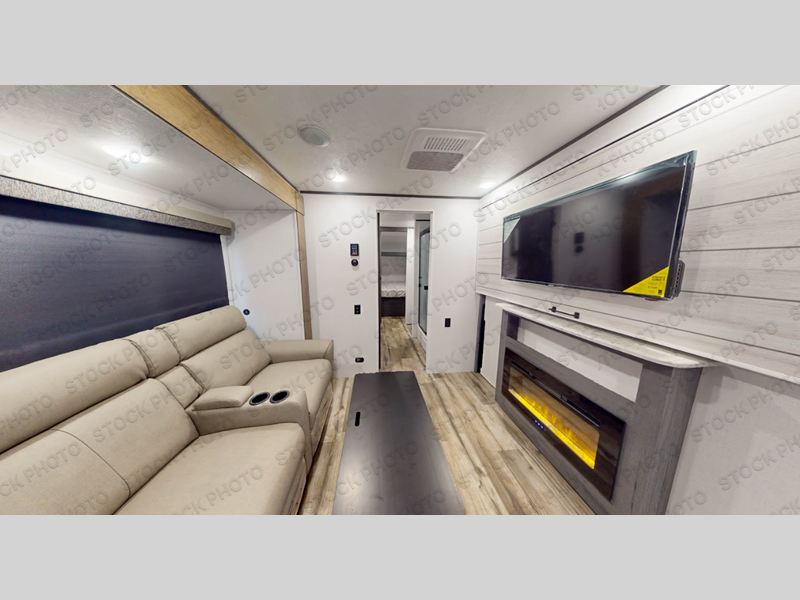 This unique travel trailer is one to remember! The rear wrap-around porch features ample space to entertain guests plus a peak-a-boo window with a fold-down bartop so those on the deck can visit with those inside. Once inside, you can relax on the theater seats with a flip top ottoman, and the fireplace will make this space more cozy. And check out the hidden Murphy bed behind the fireplace so guests can sleep over! A walk-thru bath is spacious so you can easily clean up each day, and the front master bedroom features a residential queen bed for all-around comfort.