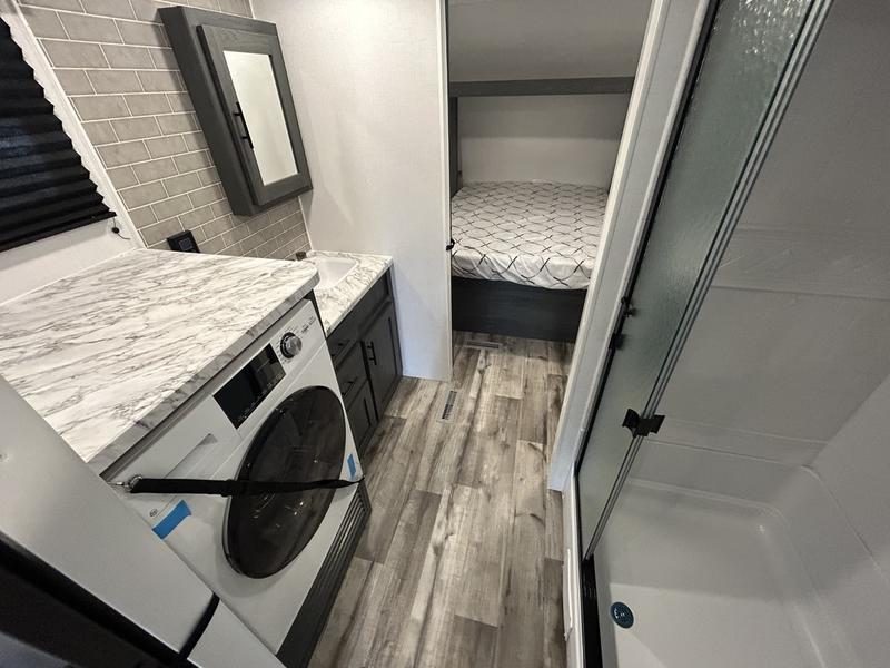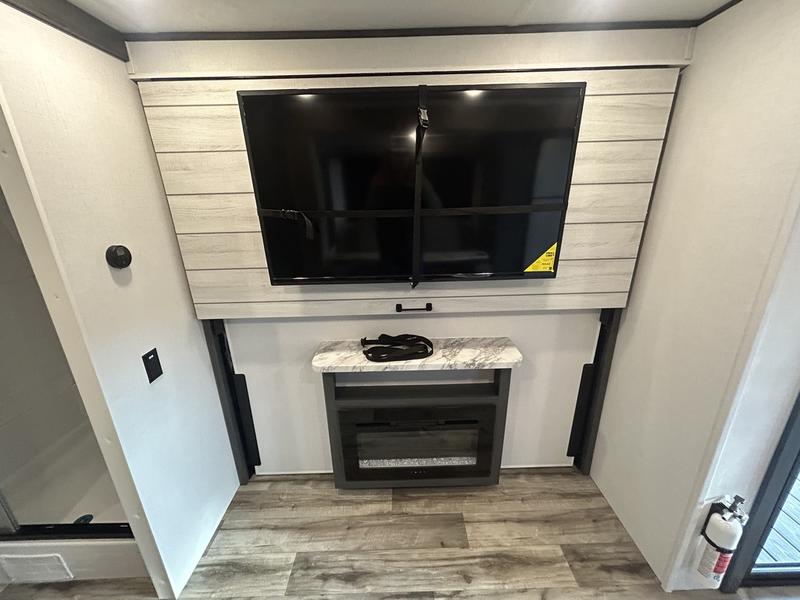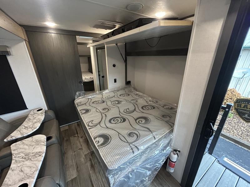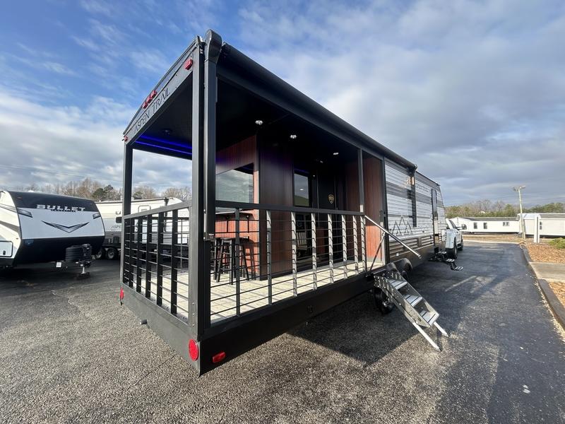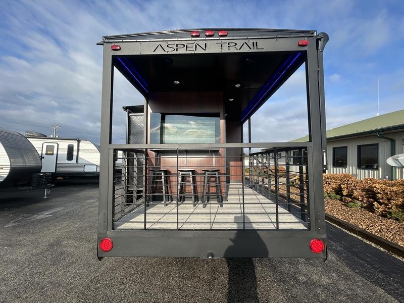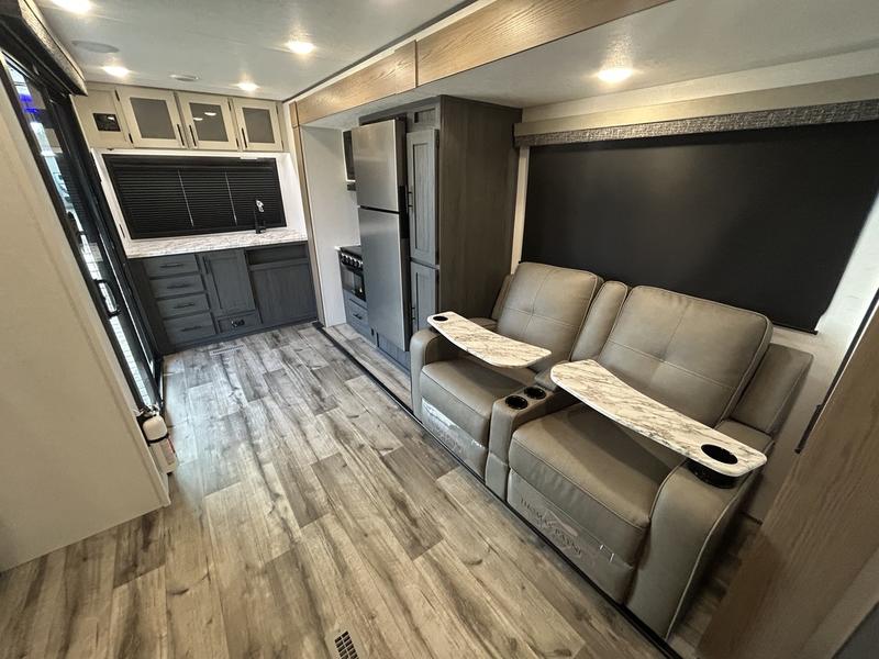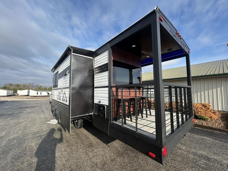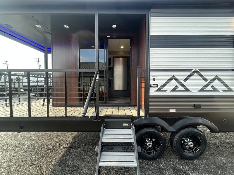 This unique travel trailer is one to remember! The rear wrap-around porch features ample space to entertain guests plus a peak-a-boo window with a fold-down bartop so those on the deck can visit with those inside. Once inside, you can relax on the theater seats with a flip top ottoman, and the fireplace will make this space more cozy. And check out the hidden Murphy bed behind the fireplace so guests can sleep over! A walk-thru bath is spacious so you can easily clean up each day, and the front master bedroom features a residential queen bed for all-around comfort.