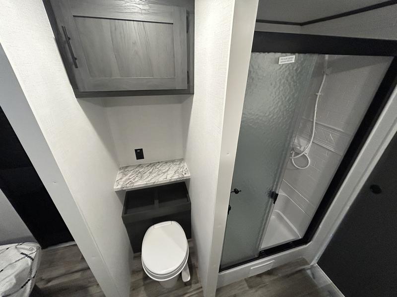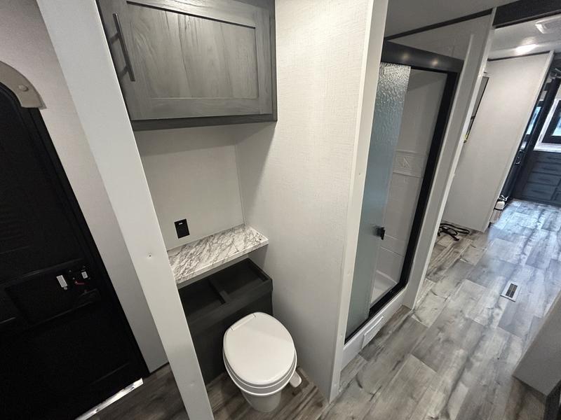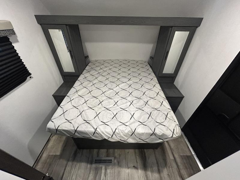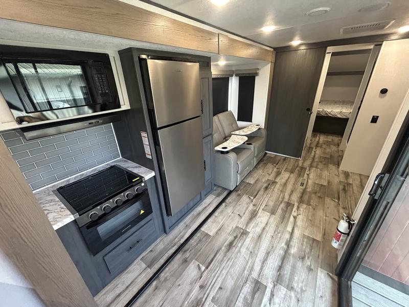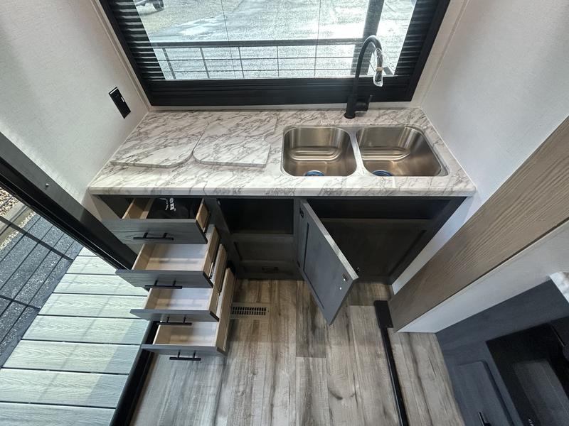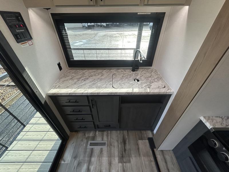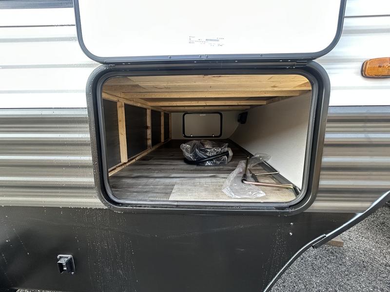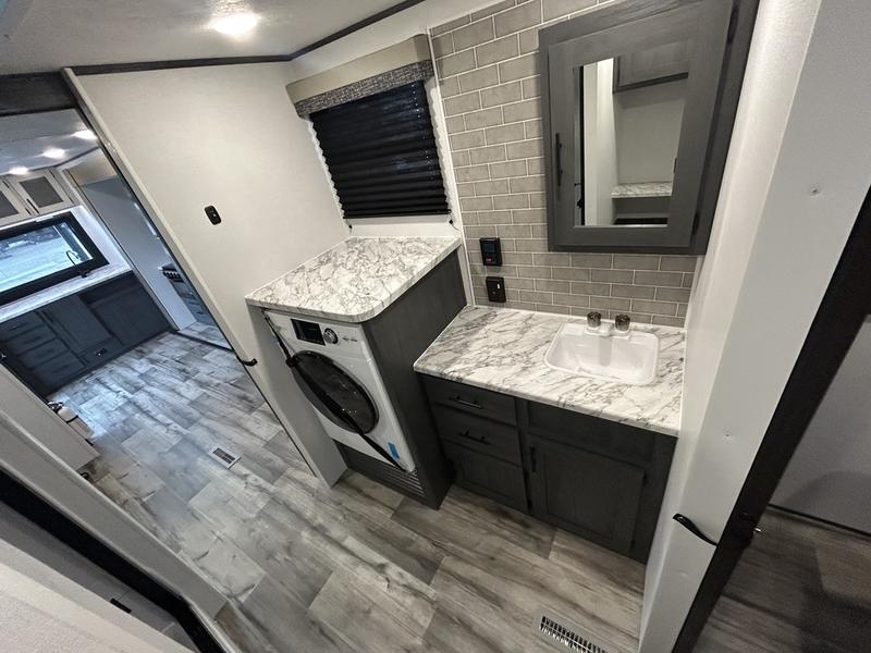 This unique travel trailer is one to remember! The rear wrap-around porch features ample space to entertain guests plus a peak-a-boo window with a fold-down bartop so those on the deck can visit with those inside. Once inside, you can relax on the theater seats with a flip top ottoman, and the fireplace will make this space more cozy. And check out the hidden Murphy bed behind the fireplace so guests can sleep over! A walk-thru bath is spacious so you can easily clean up each day, and the front master bedroom features a residential queen bed for all-around comfort.