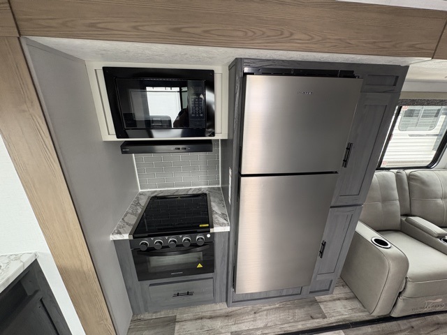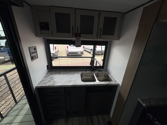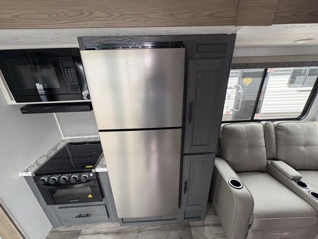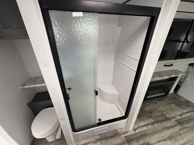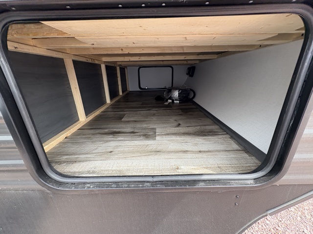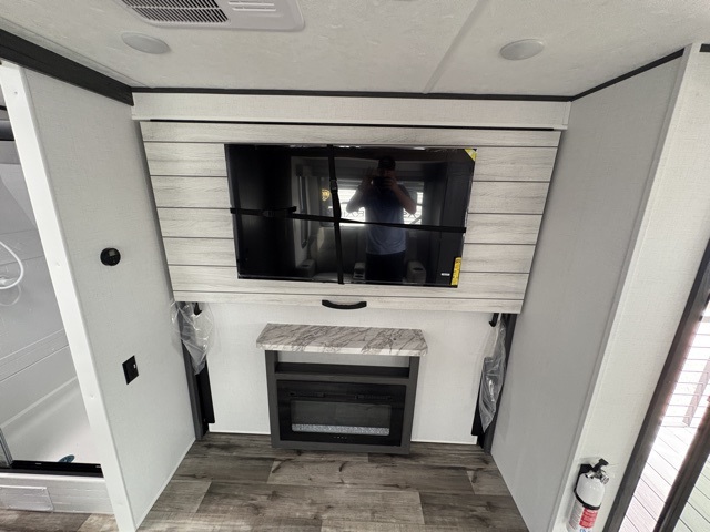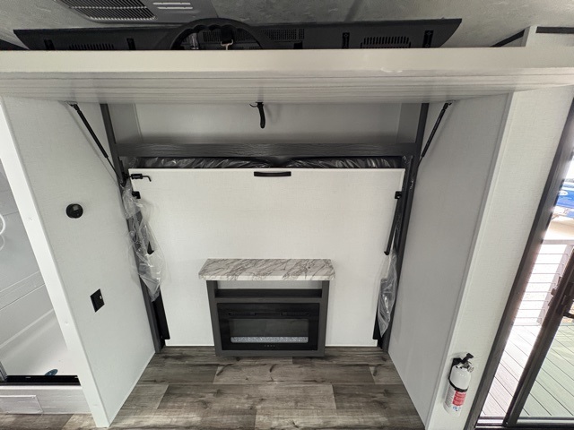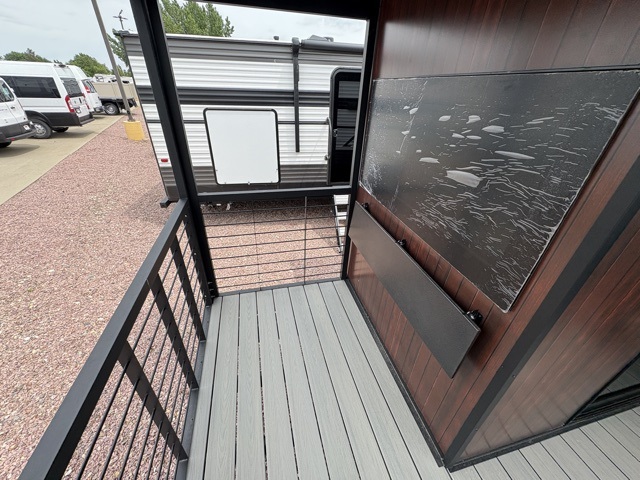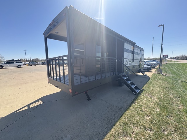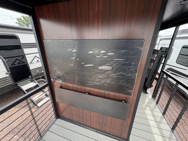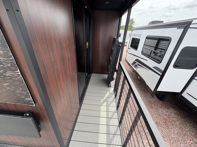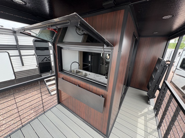This unique travel trailer is one to remember! The rear wrap-around porch features ample space to entertain guests plus a peak-a-boo window with a fold-down bartop so those on the deck can visit with those inside. Once inside, you can relax on the theater seats with a flip top ottoman, and the fireplace will make this space more cozy. And check out the hidden Murphy bed behind the fireplace so guests can sleep over! A walk-thru bath is spacious so you can easily clean up each day, and the front master bedroom features a residential queen bed for all-around comfort.