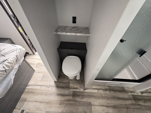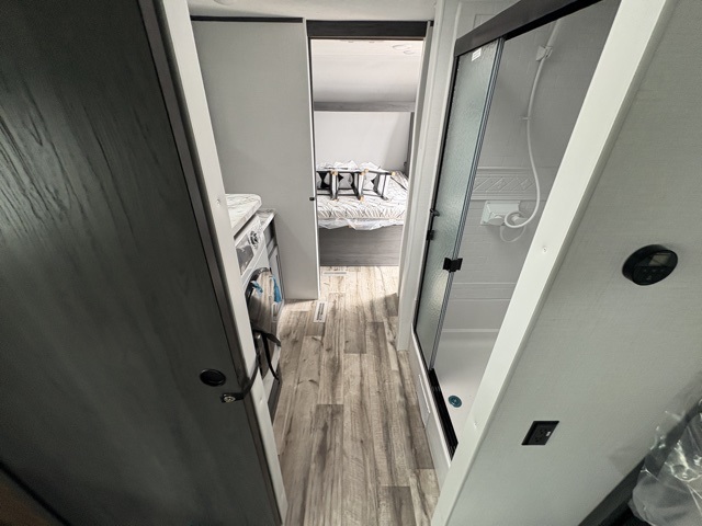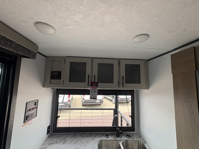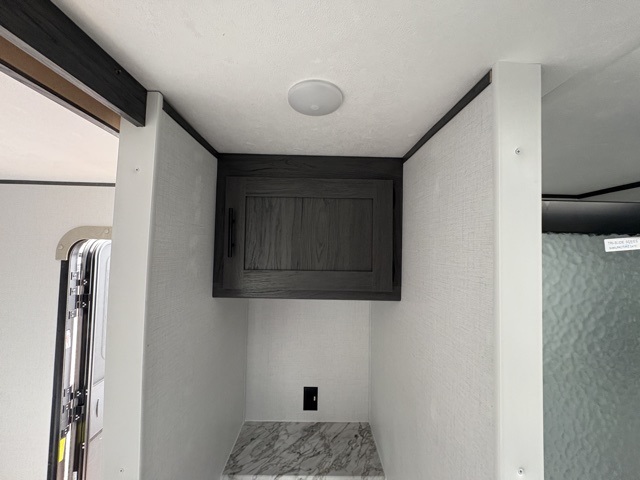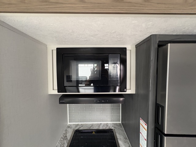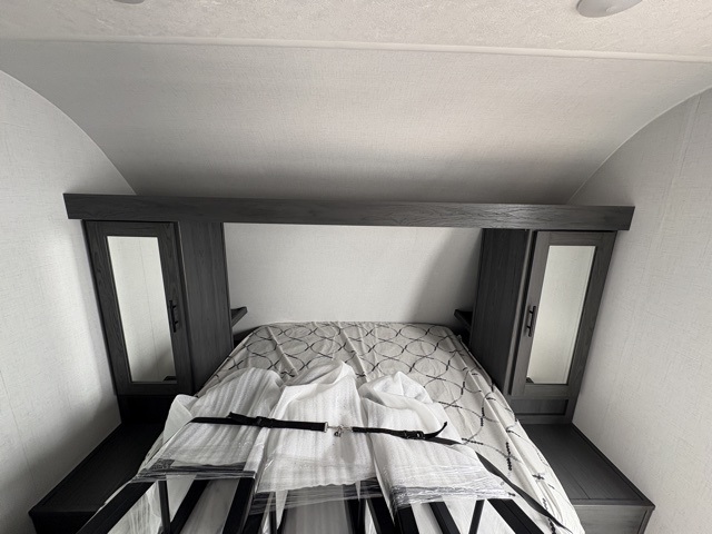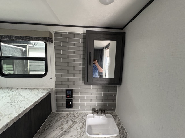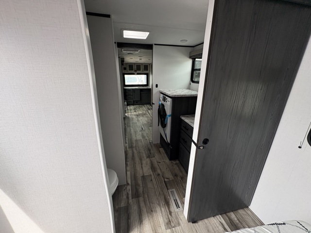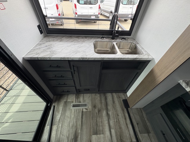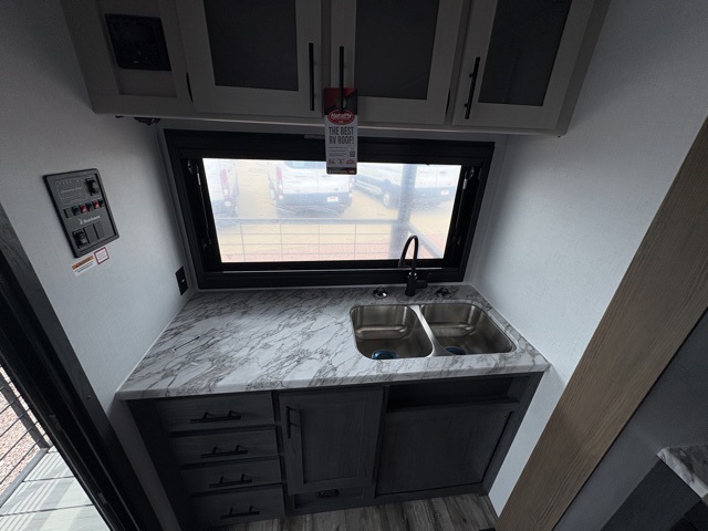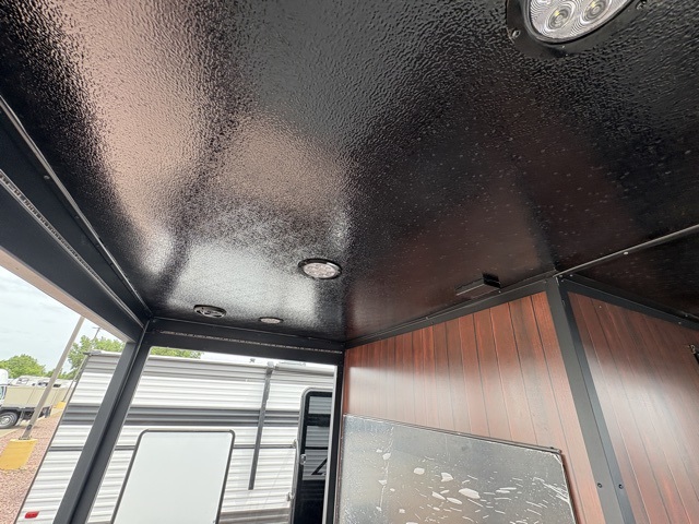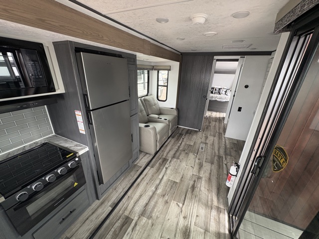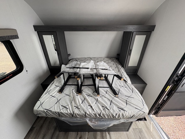 This unique travel trailer is one to remember! The rear wrap-around porch features ample space to entertain guests plus a peak-a-boo window with a fold-down bartop so those on the deck can visit with those inside. Once inside, you can relax on the theater seats with a flip top ottoman, and the fireplace will make this space more cozy. And check out the hidden Murphy bed behind the fireplace so guests can sleep over! A walk-thru bath is spacious so you can easily clean up each day, and the front master bedroom features a residential queen bed for all-around comfort.